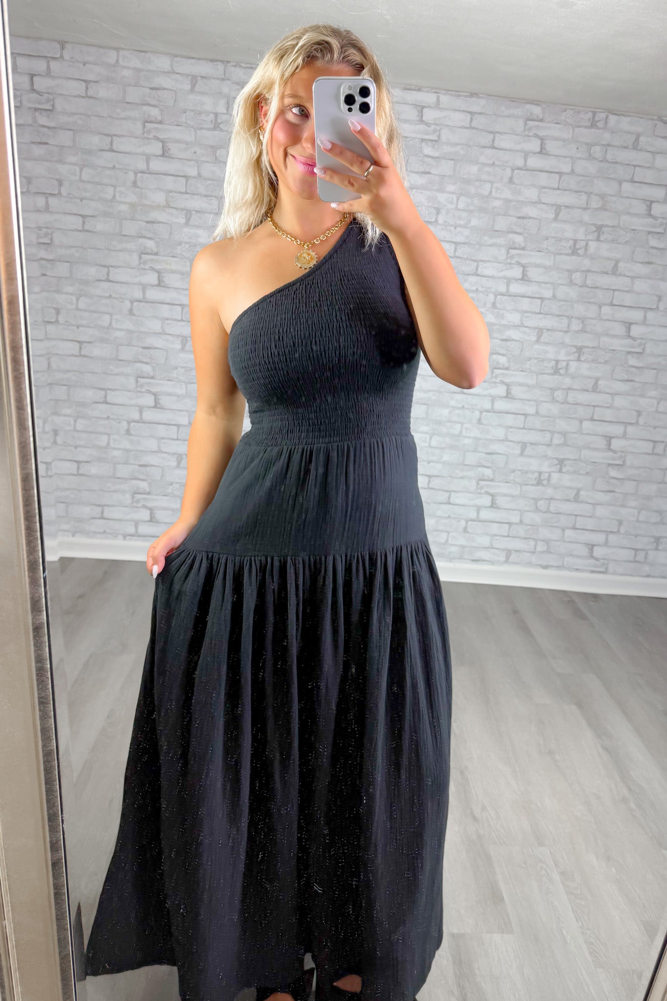 One-shoulder midi dress with a stretchy smocked bodice and flowy tiered skirt
