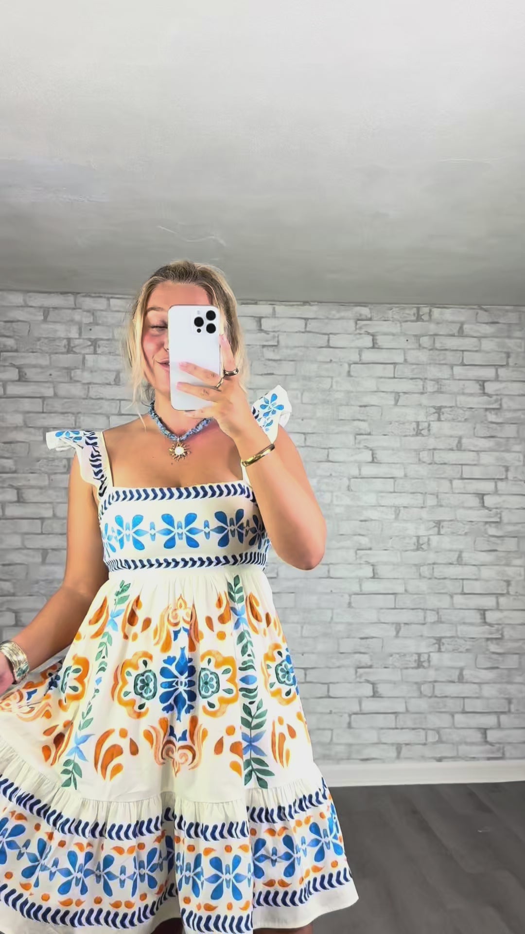 European-inspired mini dress with a vibrant tile print and flutter straps