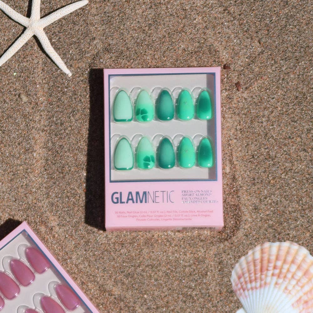 Prepare to make waves with the Siren Green Press-On Nail Set. Inspired by swirling seafoam, these short almond nails enchant with a cool aquamarine gradient and delicate floral accents. Finished with a dewy gloss, this set glistens like sea. Apply in 5 minutes for up to 2 weeks of mermaid-approved glam