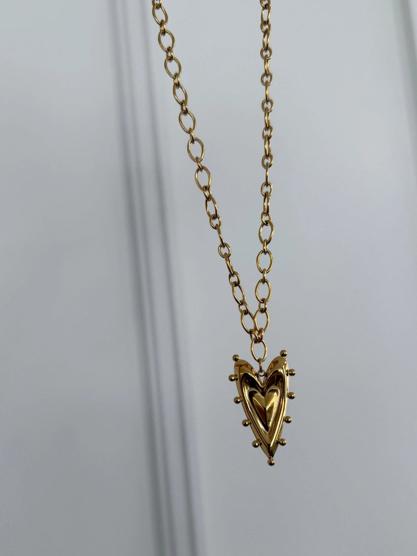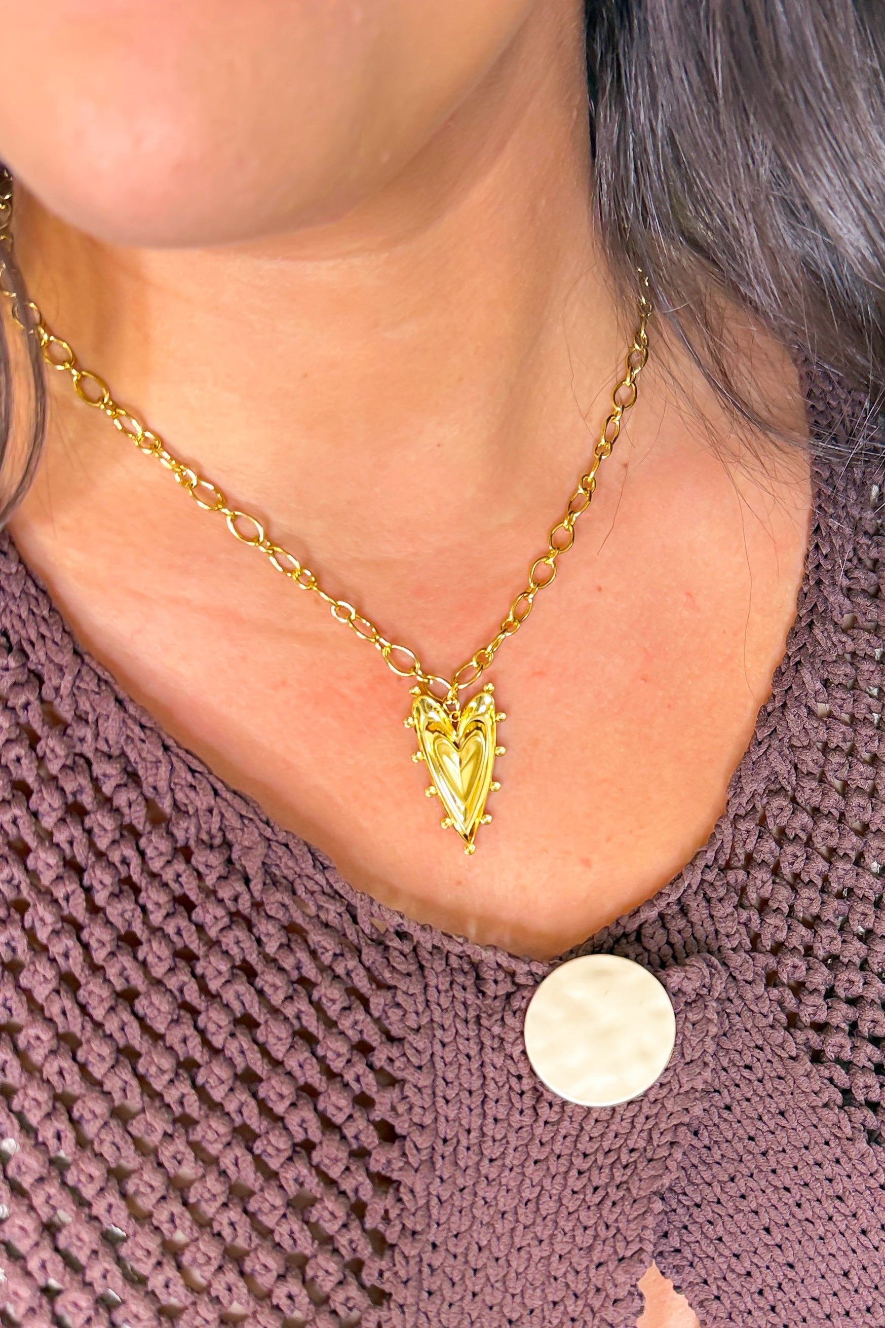 Set your look ablaze with the Hearts On Fire Chain Necklace. This bold, gold-toned piece features a sculptural heart pendant wrapped in edgy raised details, striking the perfect balance between fierce and feminine. Waterproof and tarnish-free, it's made to keep up with your glow—no matter the weather or your mood. Wear it solo or stack it for an unforgettable statement with a life-time warranty.