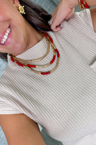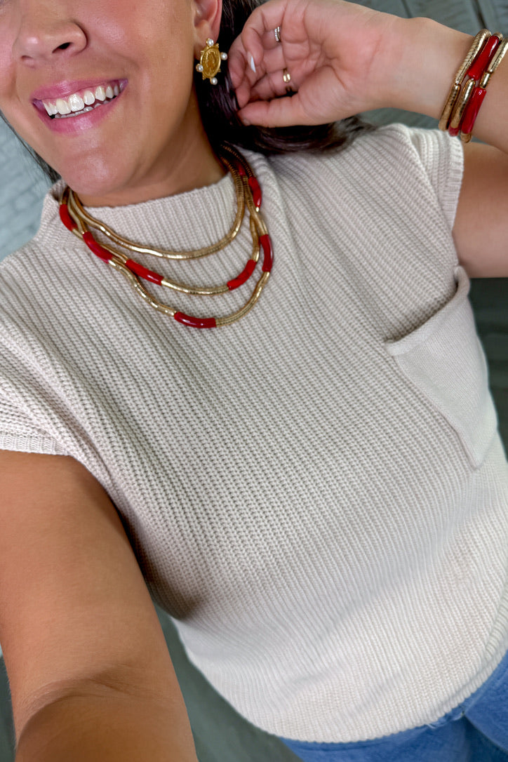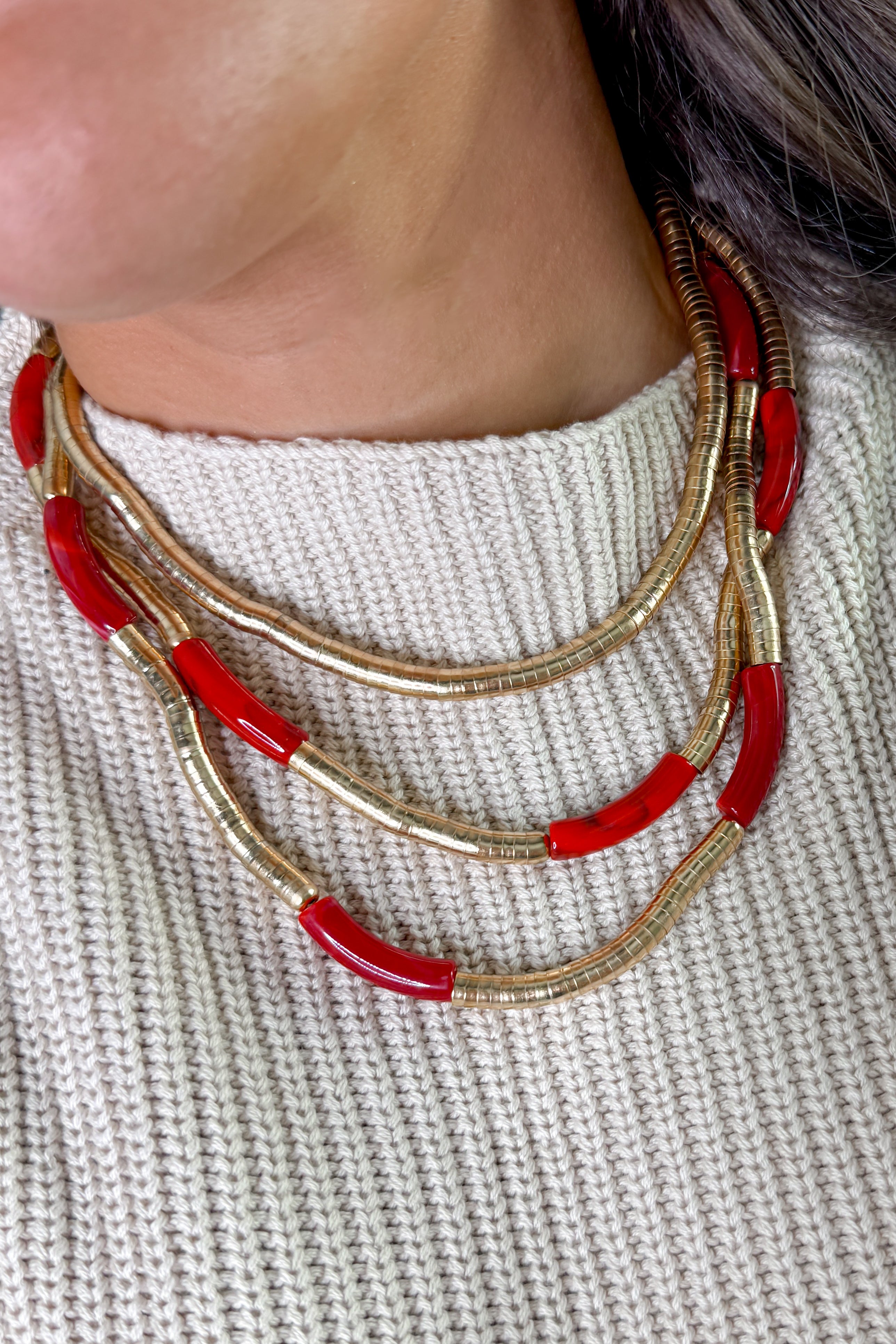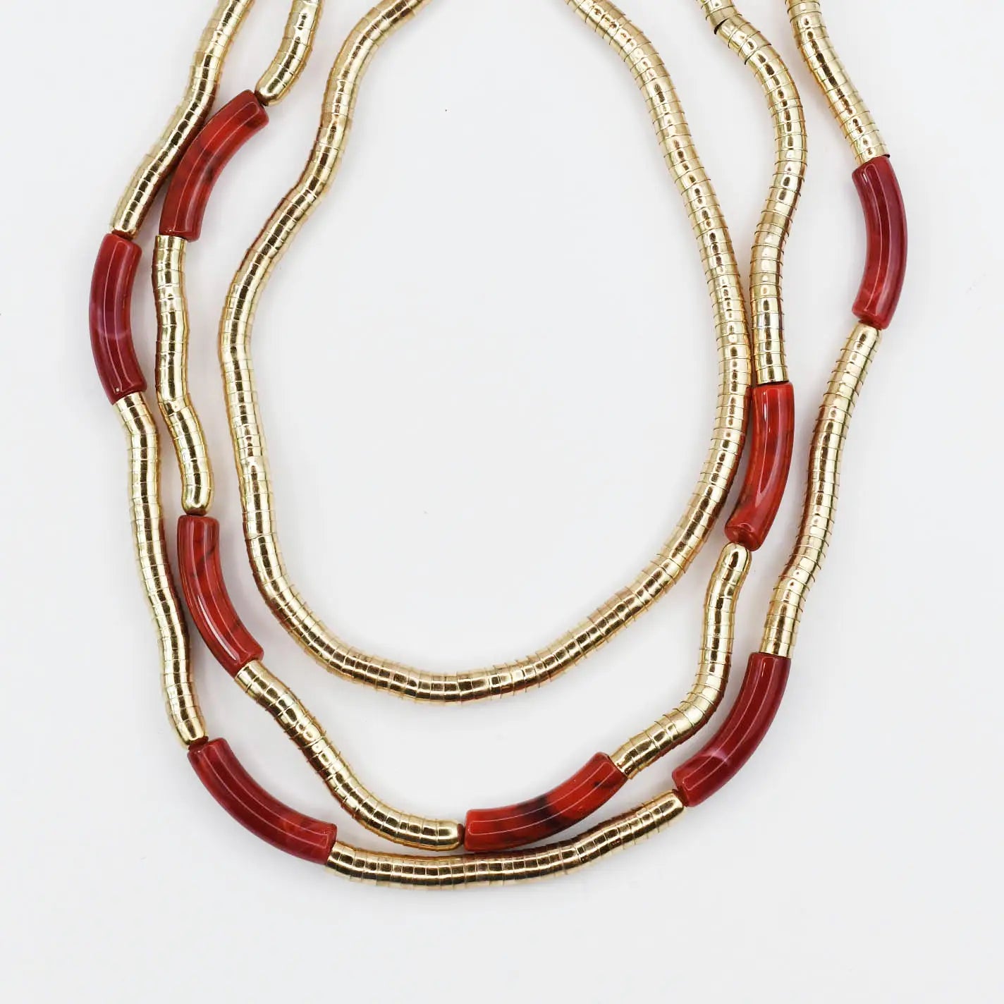 - Featuring sleek design of golden beads accented by glossy marbled red resin links, this piece brings warmth, elegance, and a modern edge to your look.