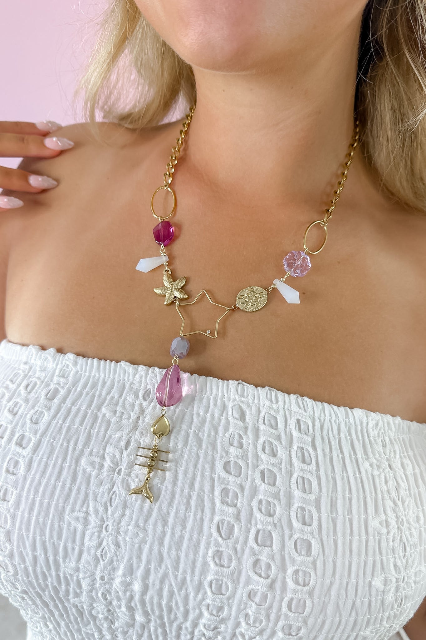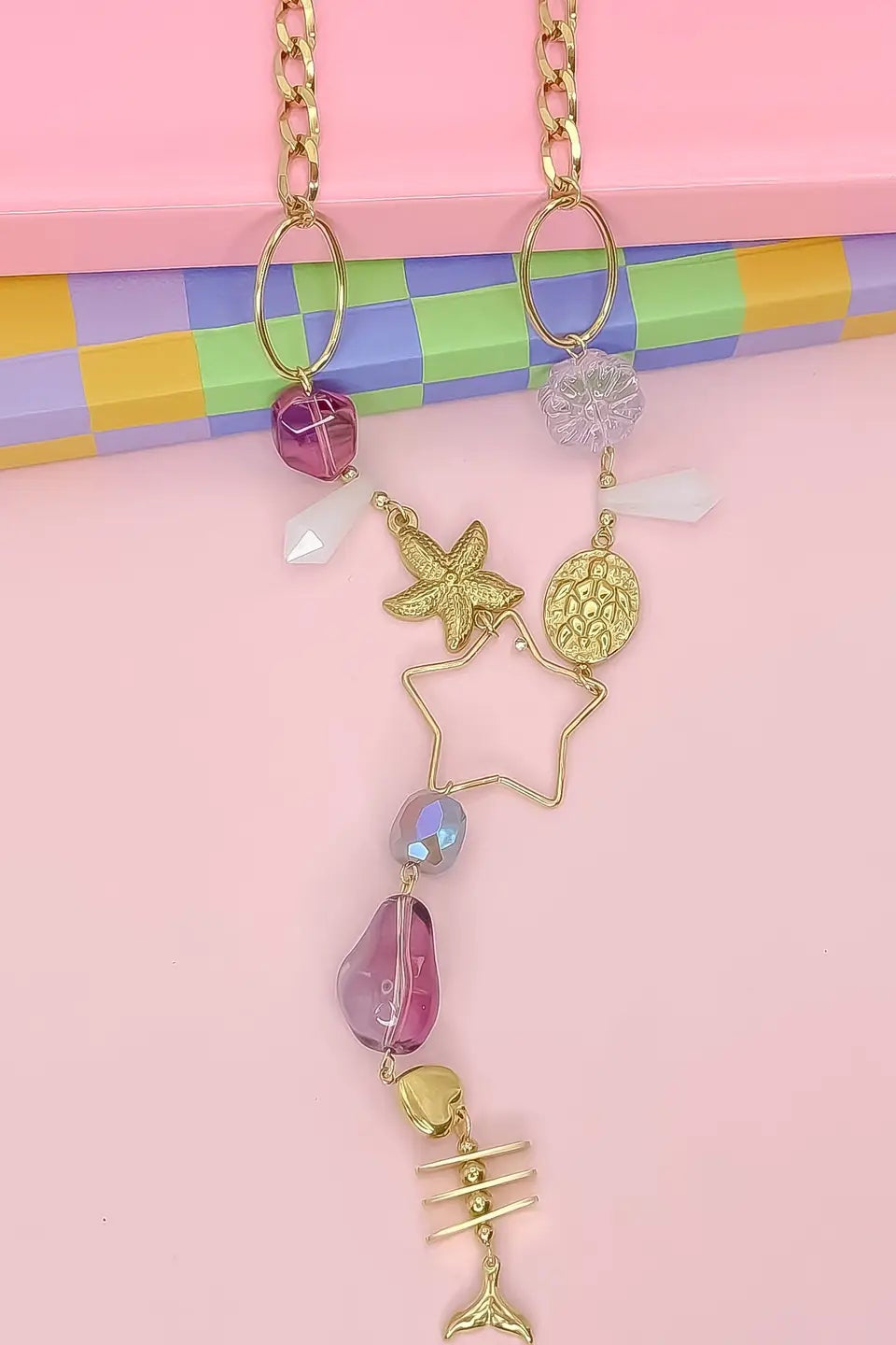 - This gold-accented beauty features an enchanting mix of ocean-inspired charms—like a starfish, mermaid tail, and fishbone—paired with pastel beads, a golden star outline, and glimmering crystal touches