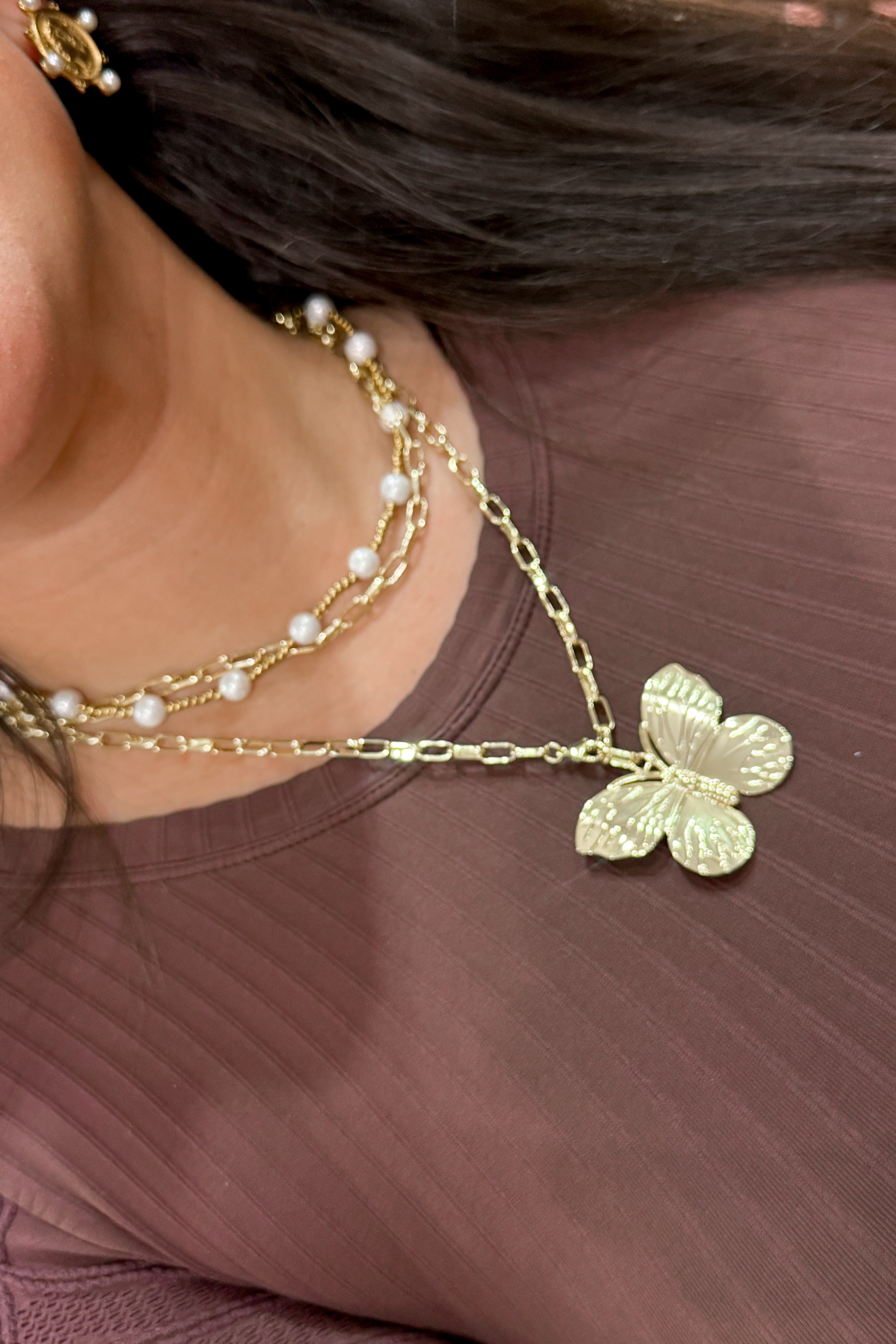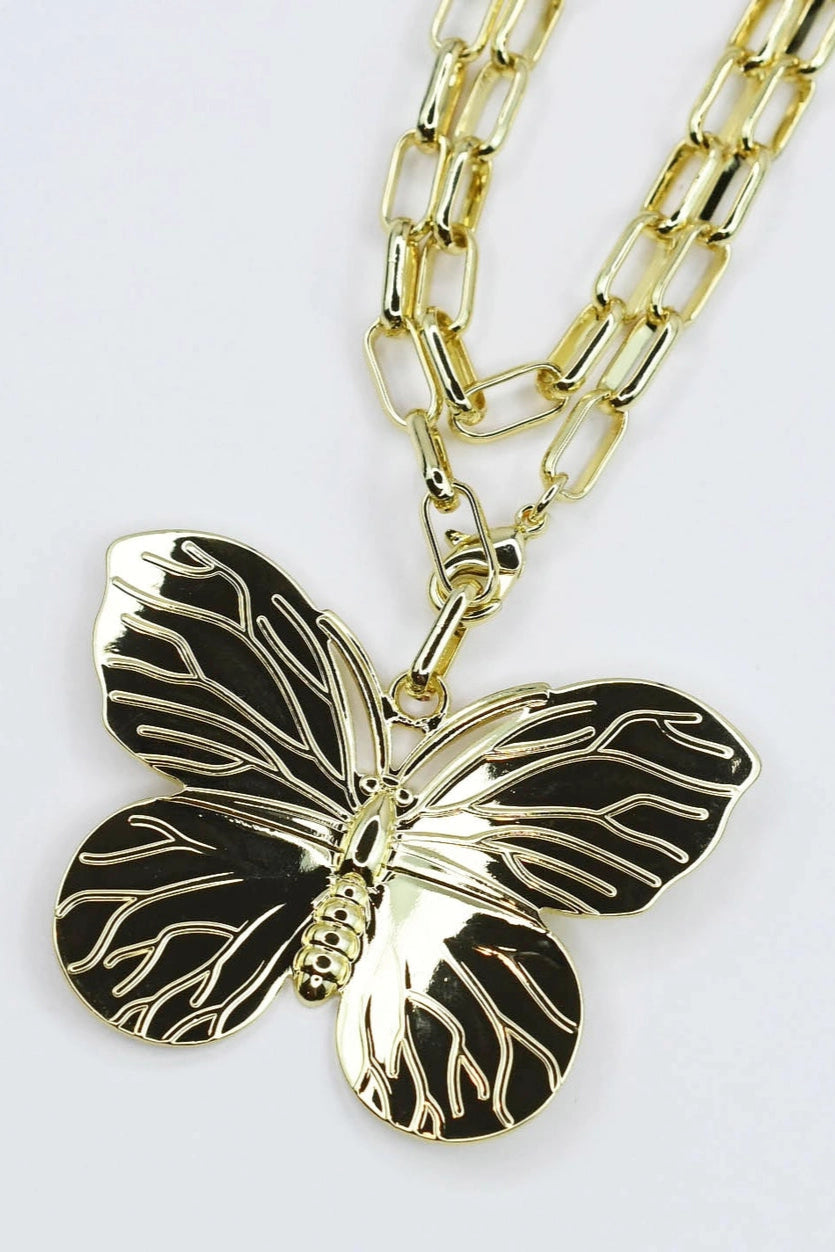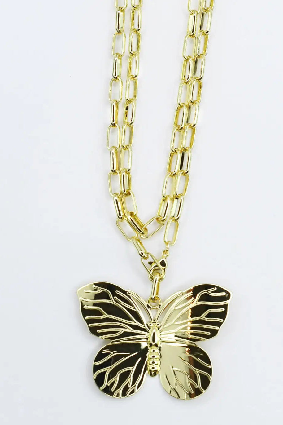 - Featuring a stunning oversized butterfly pendant on a double layer gold chain.