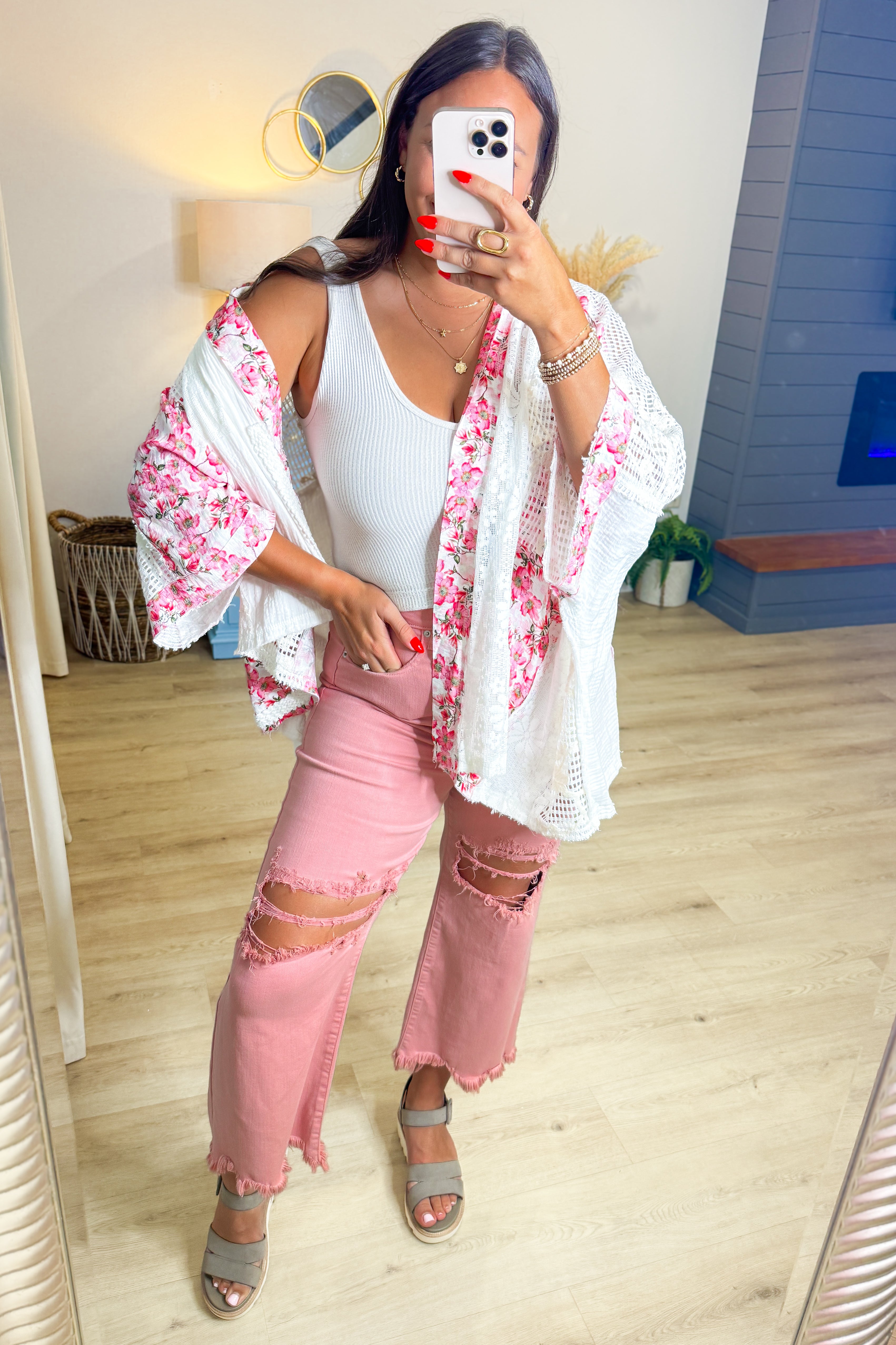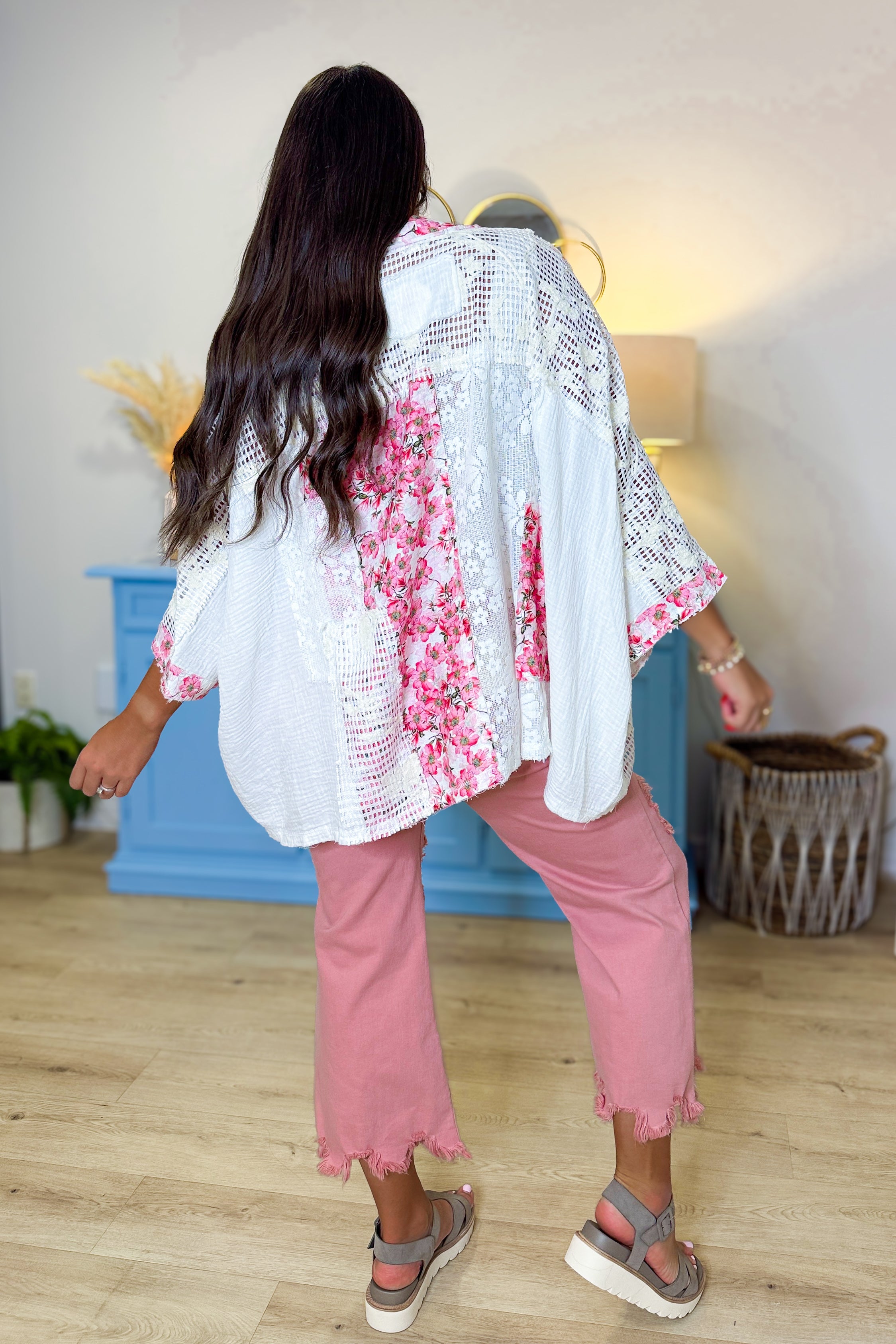 - Float into feminine charm with the Blossom Breeze Patchwork Kimono. This dreamy open-front layer features a romantic mix of floral prints, crochet panels, and soft gauze textures in a breezy, oversized silhouette. The pink rose trim adds a delicate touch, while the flowy sleeves and drapey fit make it perfect for layering over tanks, dresses, or even swimwear. Whether you're brunching or beach-bound, this kimono adds instant boho elegance.