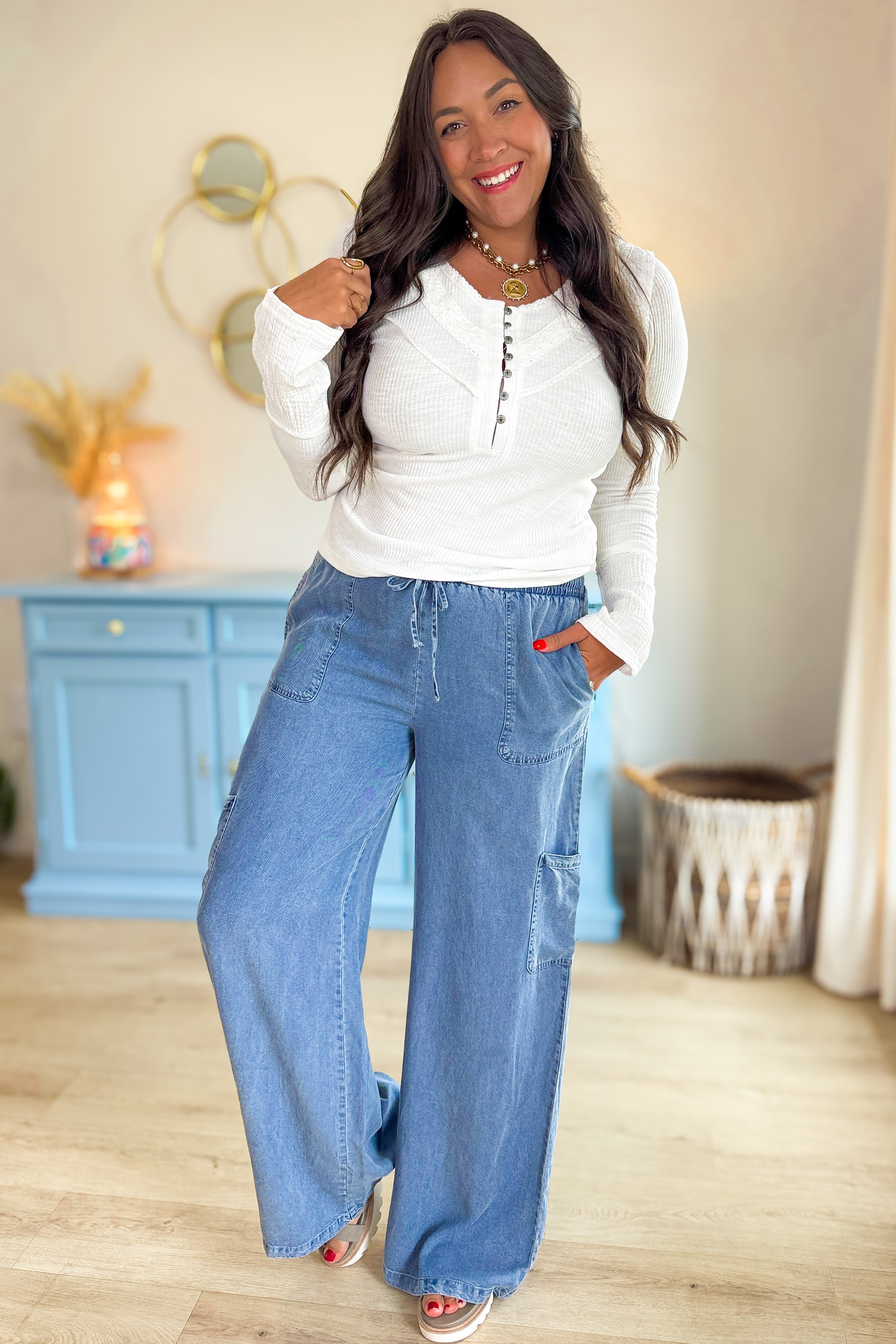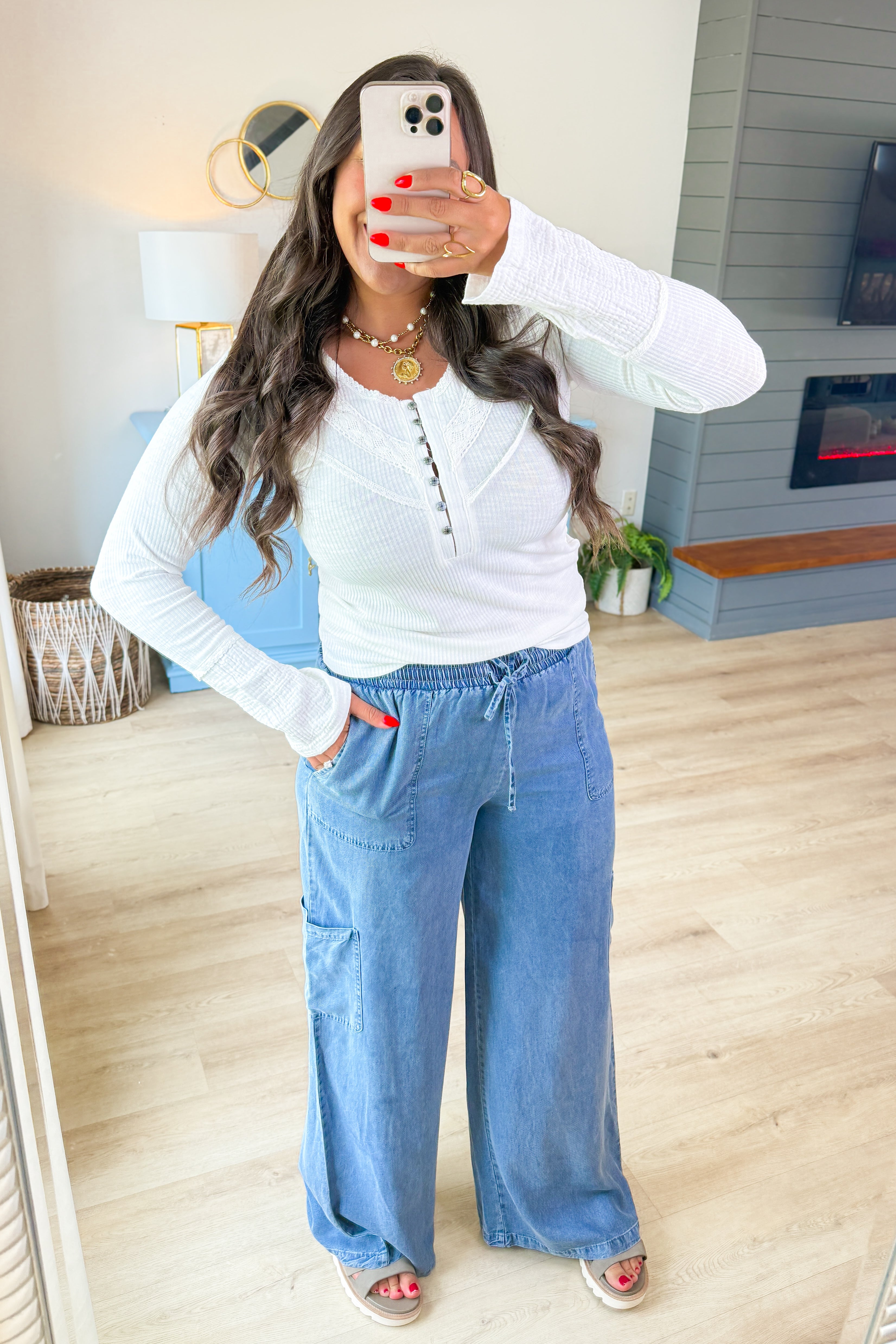 - Say hello to your new favorite off-duty staple. The Coastal Ease Chambray Pants blend casual cool with everyday comfort. Made from a soft, lightweight chambray, these wide-leg pants feature an easy elastic waistband with drawstring tie, oversized patch pockets, and a relaxed fit that moves with you.