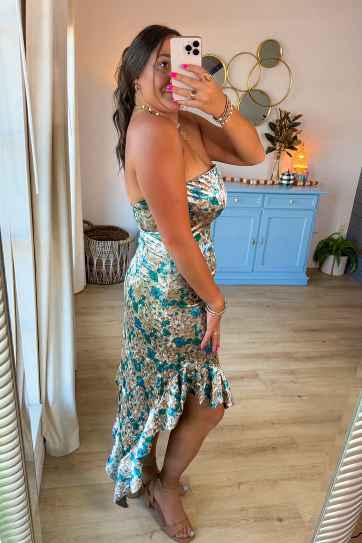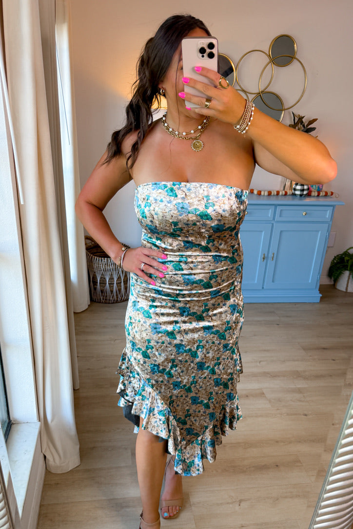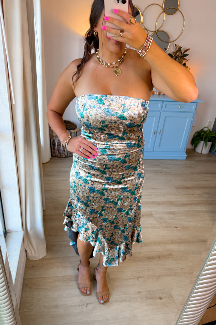 - Velvety with a soft floral print, this dress features a strapless neckline and a cascading ruffle hem for a touch of drama.