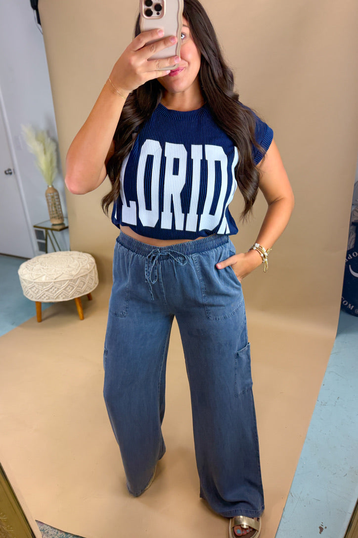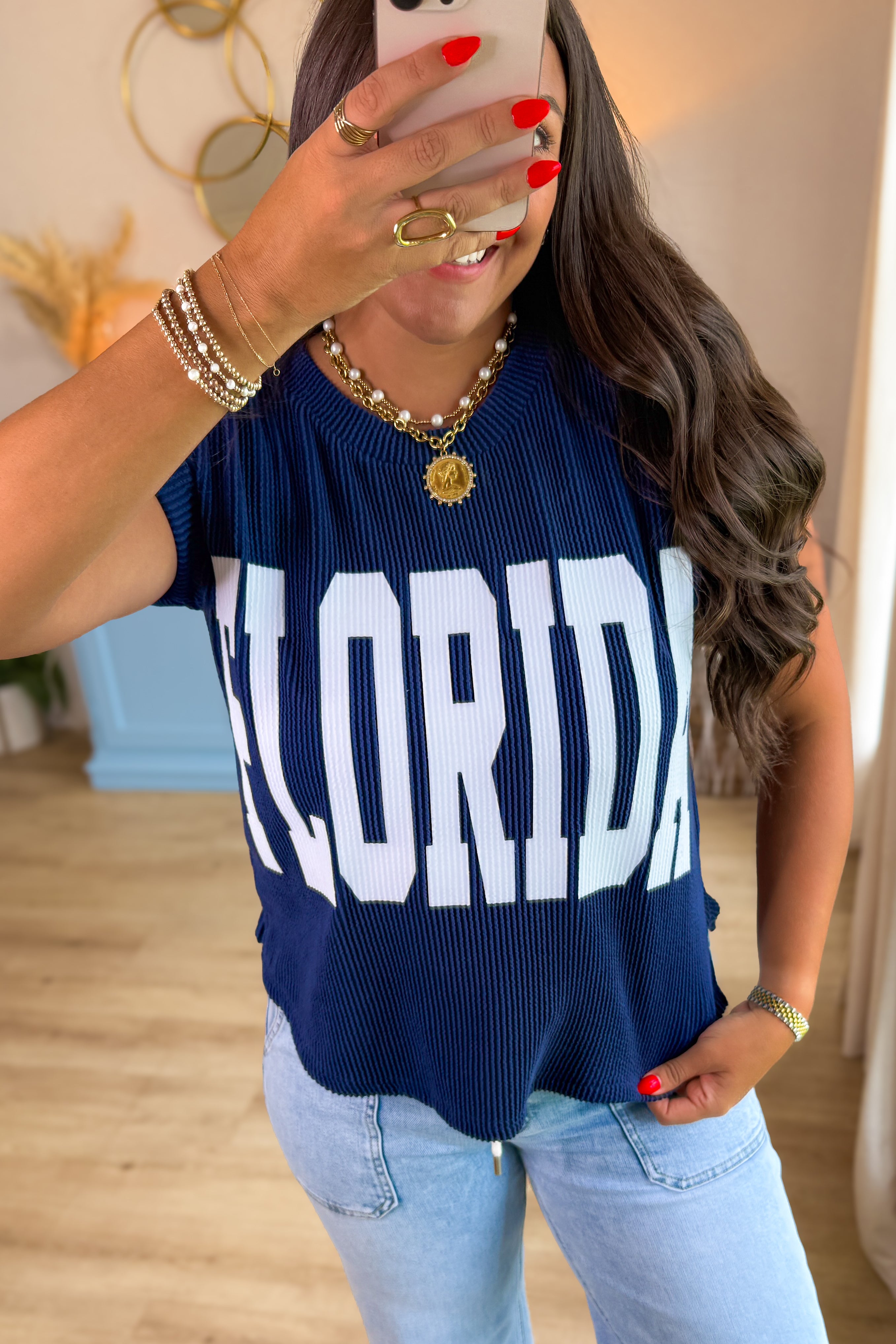 - The Florida Ribbed Knit Tee in navy is your go-to for effortless coastal style. Featuring bold white block lettering and a soft ribbed knit texture, this slightly boxy tee brings a sporty yet elevated vibe. Whether you're repping the Sunshine State or just loving the look, this top pairs perfectly with denim, shorts, or layered over swimwear.
