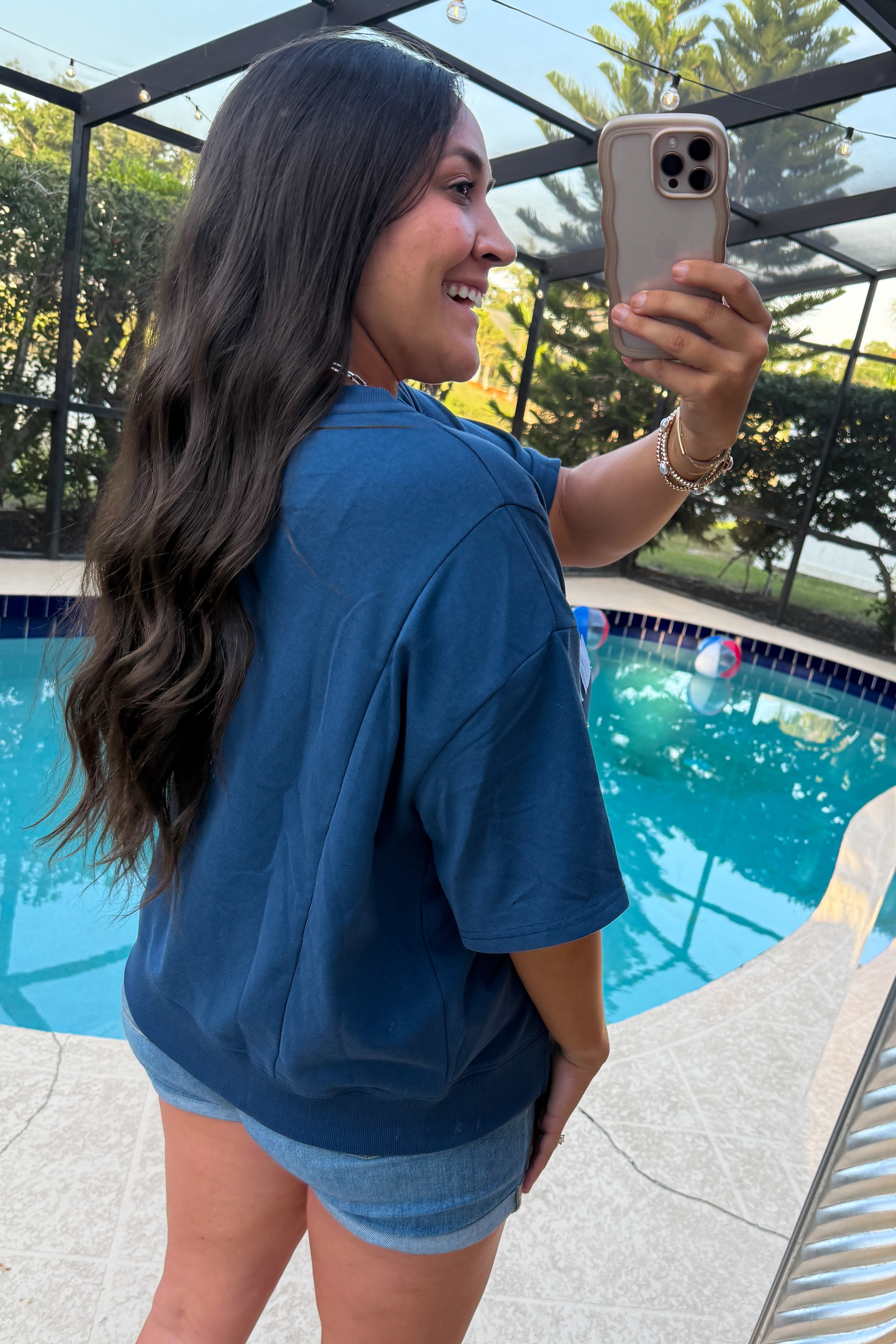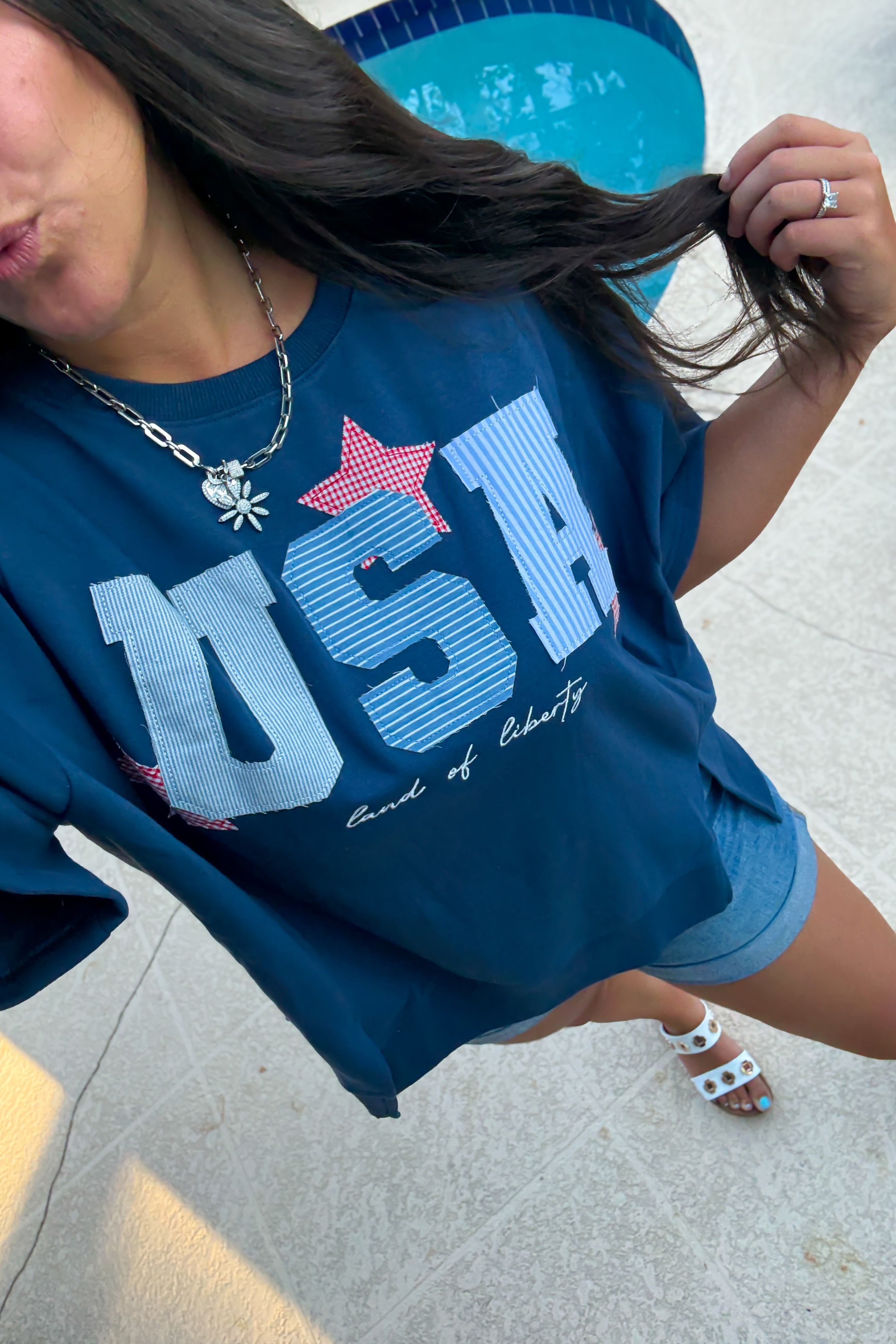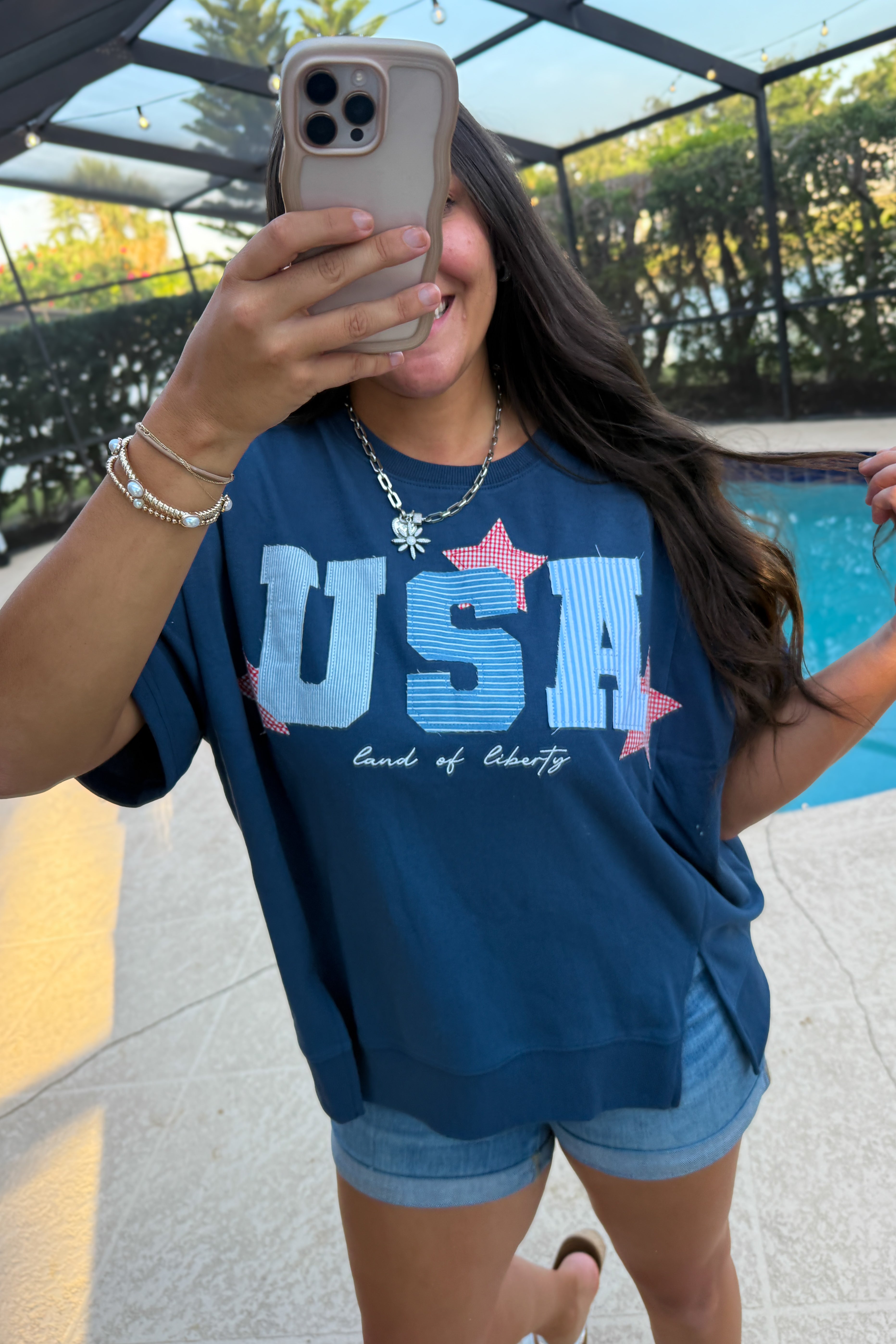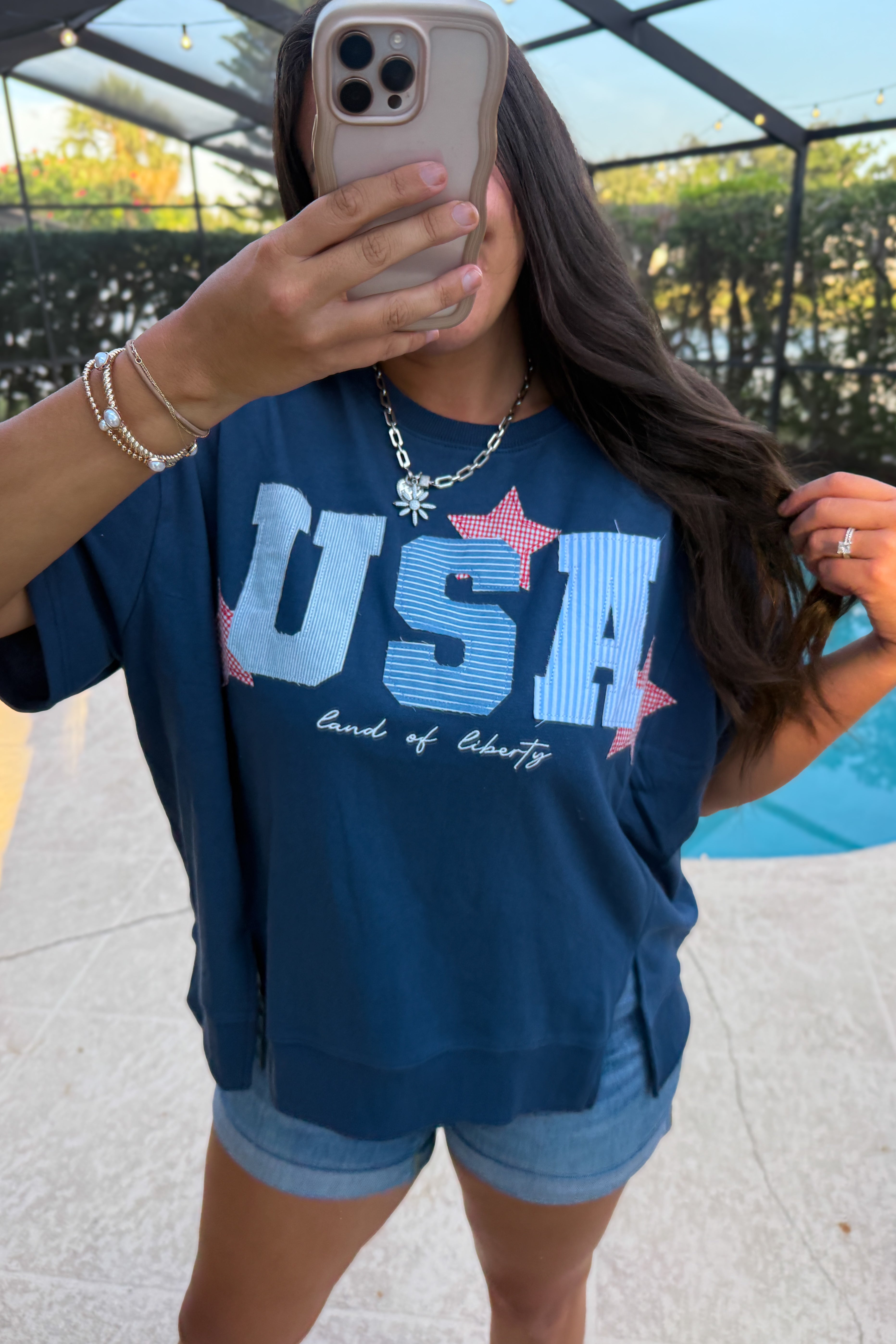 - Bring on the backyard BBQs and firework finales—the Land of Liberty USA Top is here to steal the spotlight. This oversized navy pullover features varsity-style “USA” appliqué lettering with seersucker and gingham stars for a playful, all-American twist. The cherry on top? White bow-tie shoulder details that make this top feel extra feminine and fun.