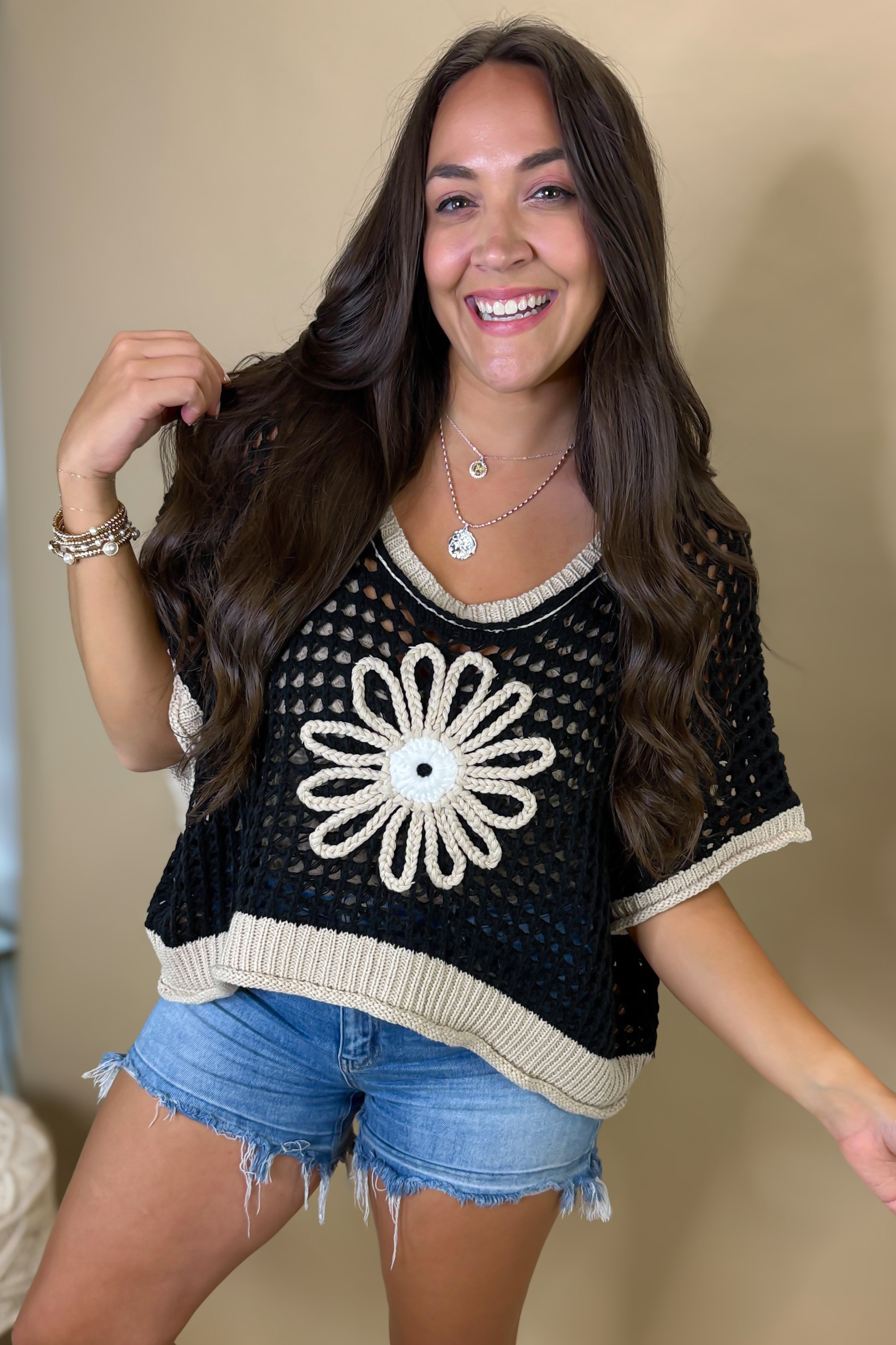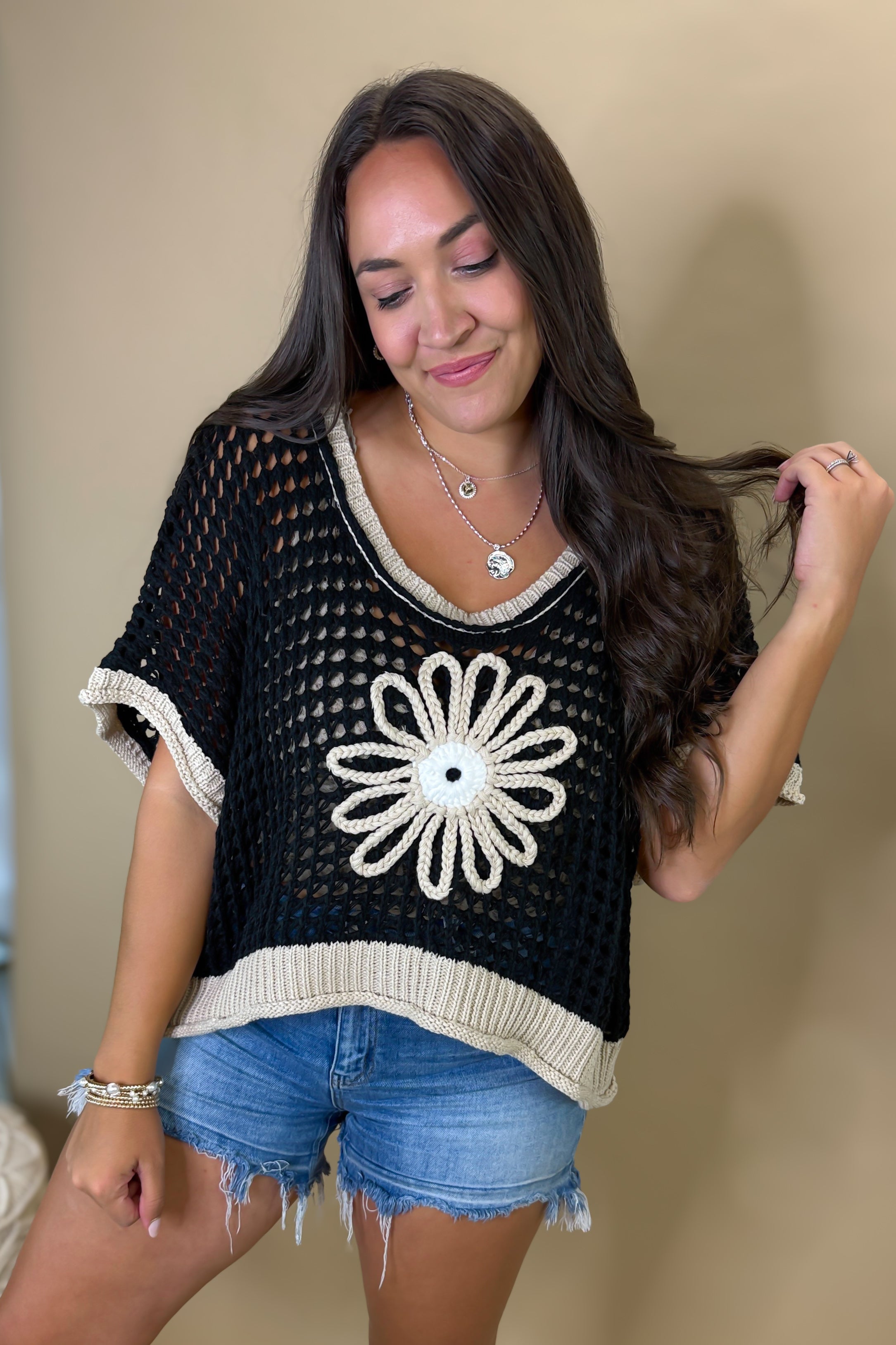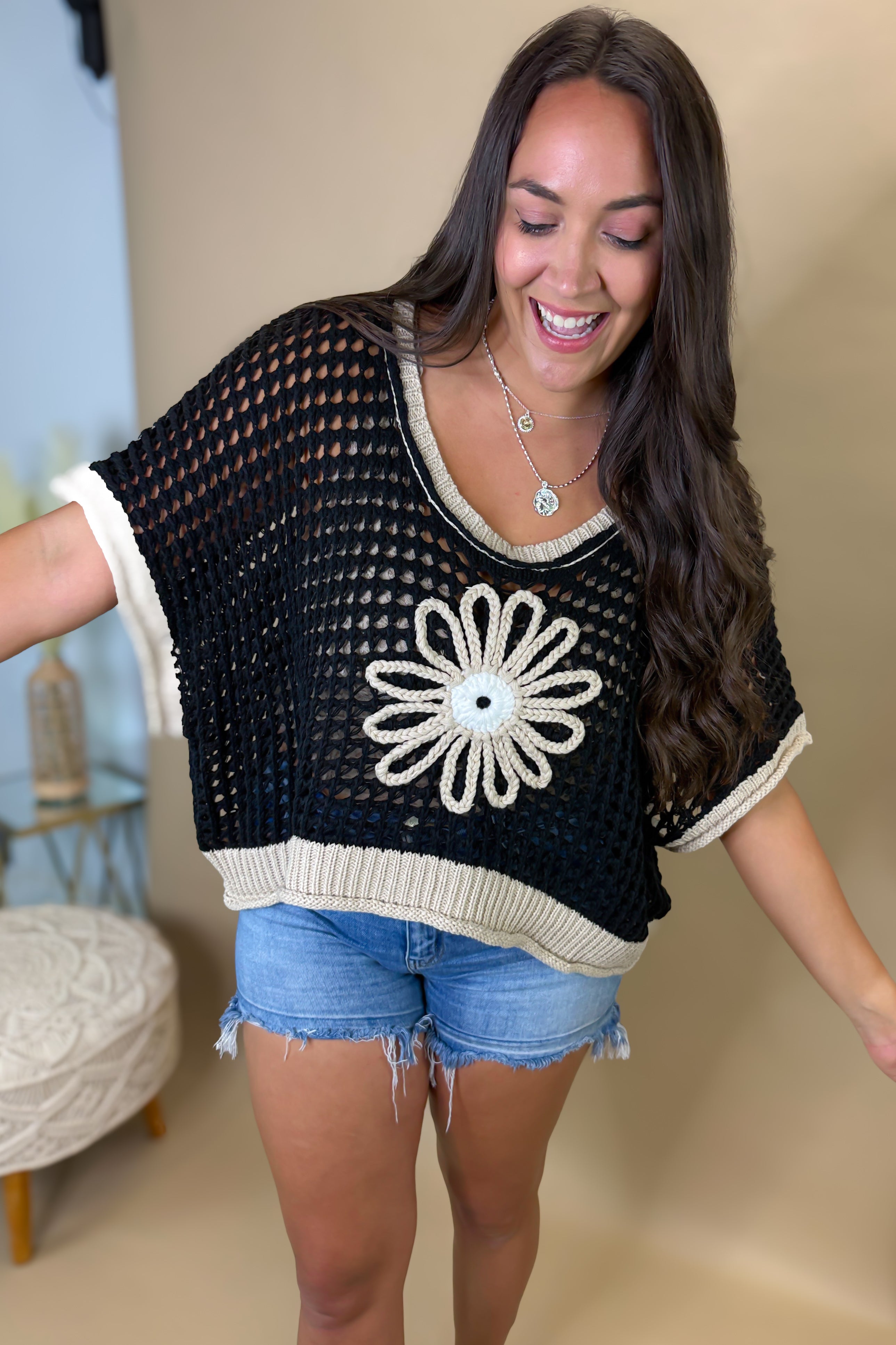 - This flower sign loose knit top is THE CUTEST short sleeve top we have ever seen, for any time of year with a boho flare