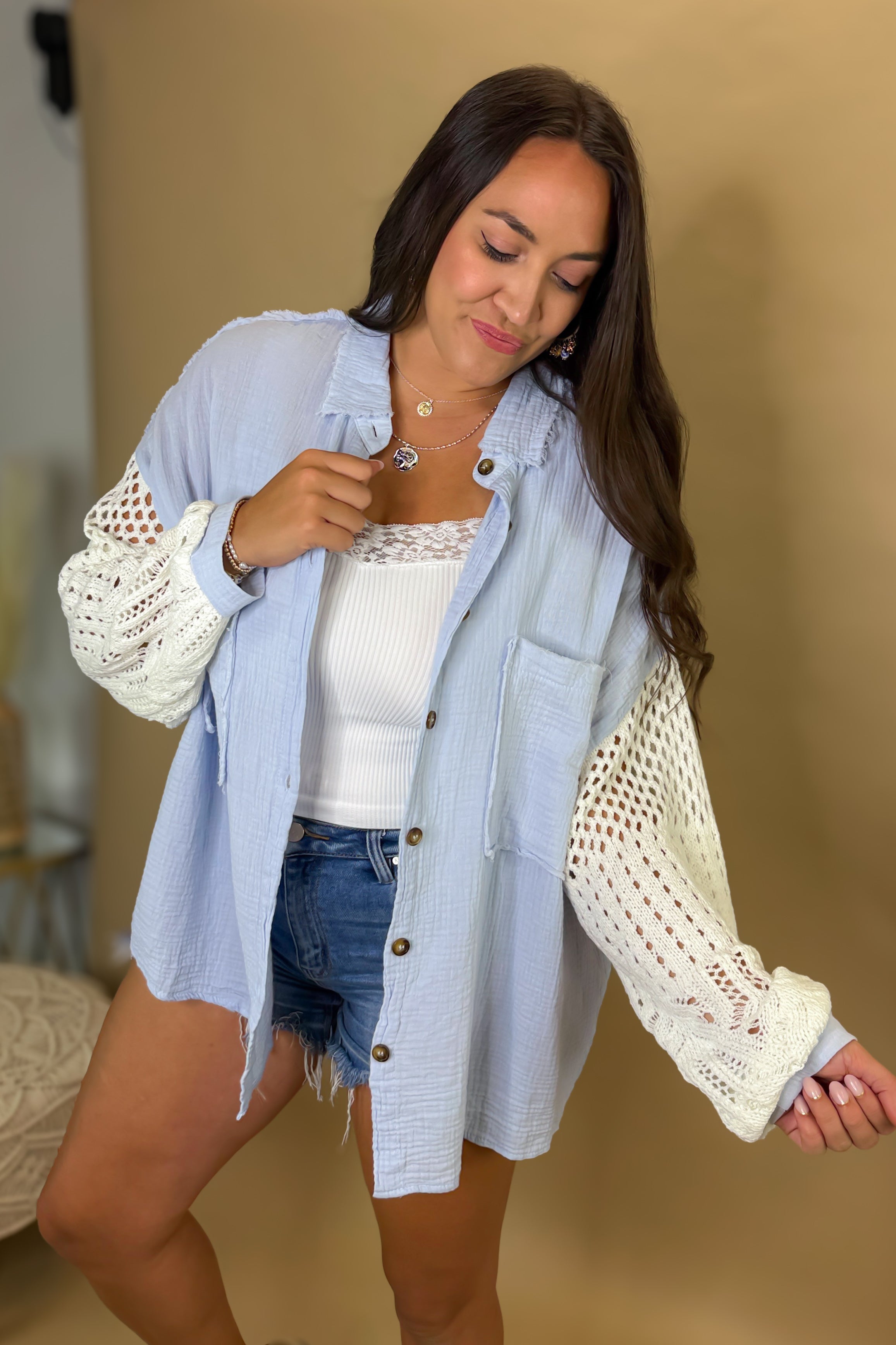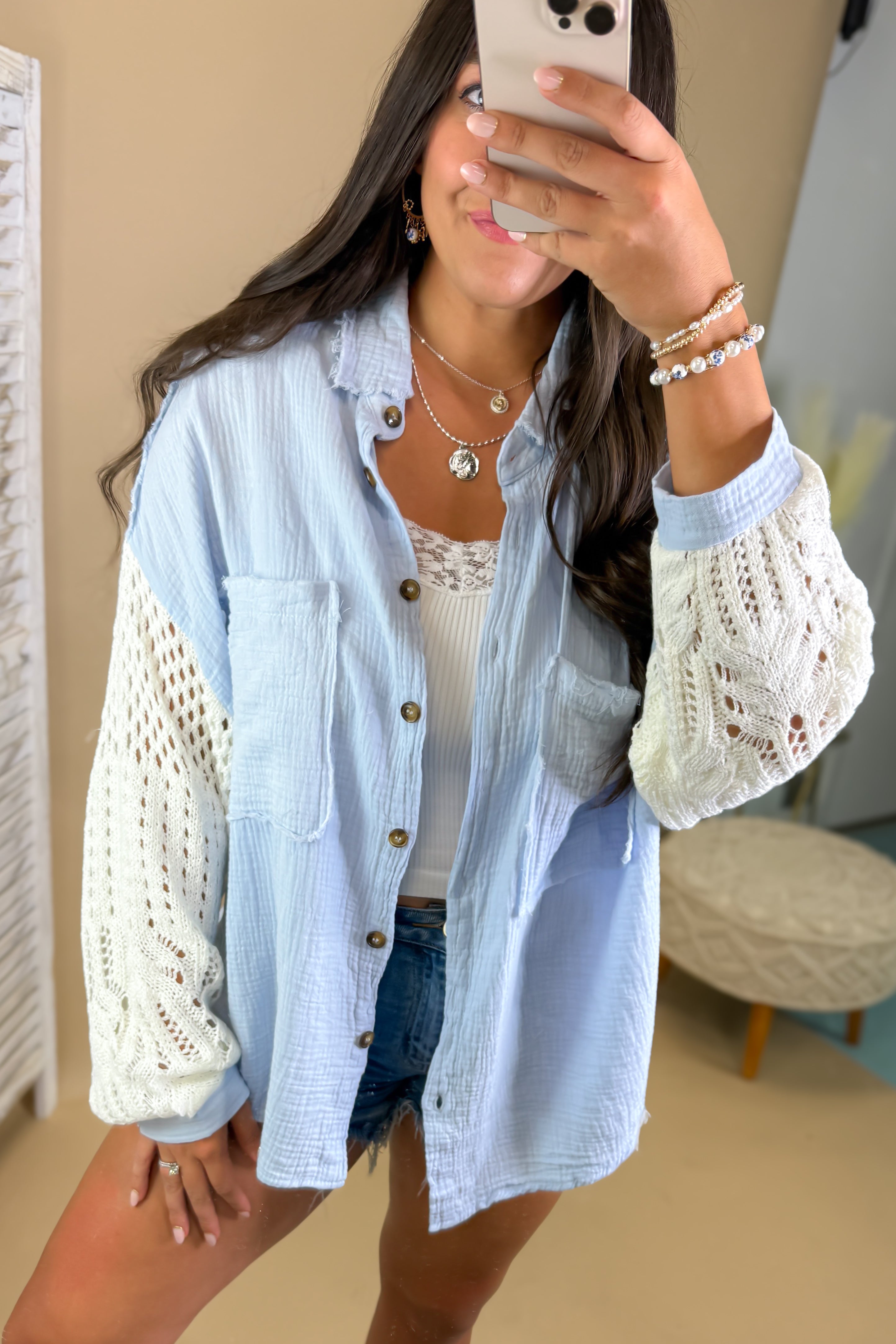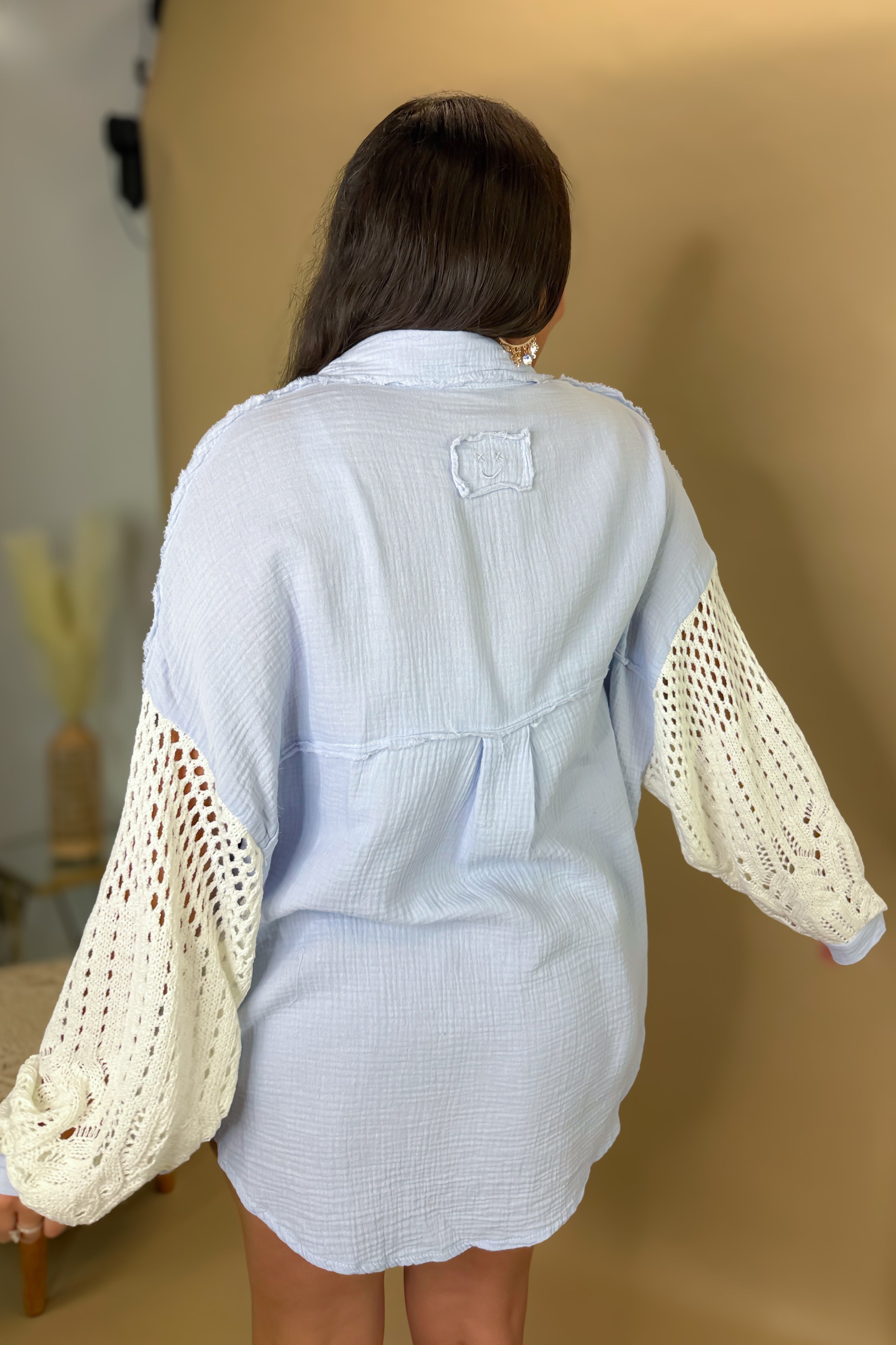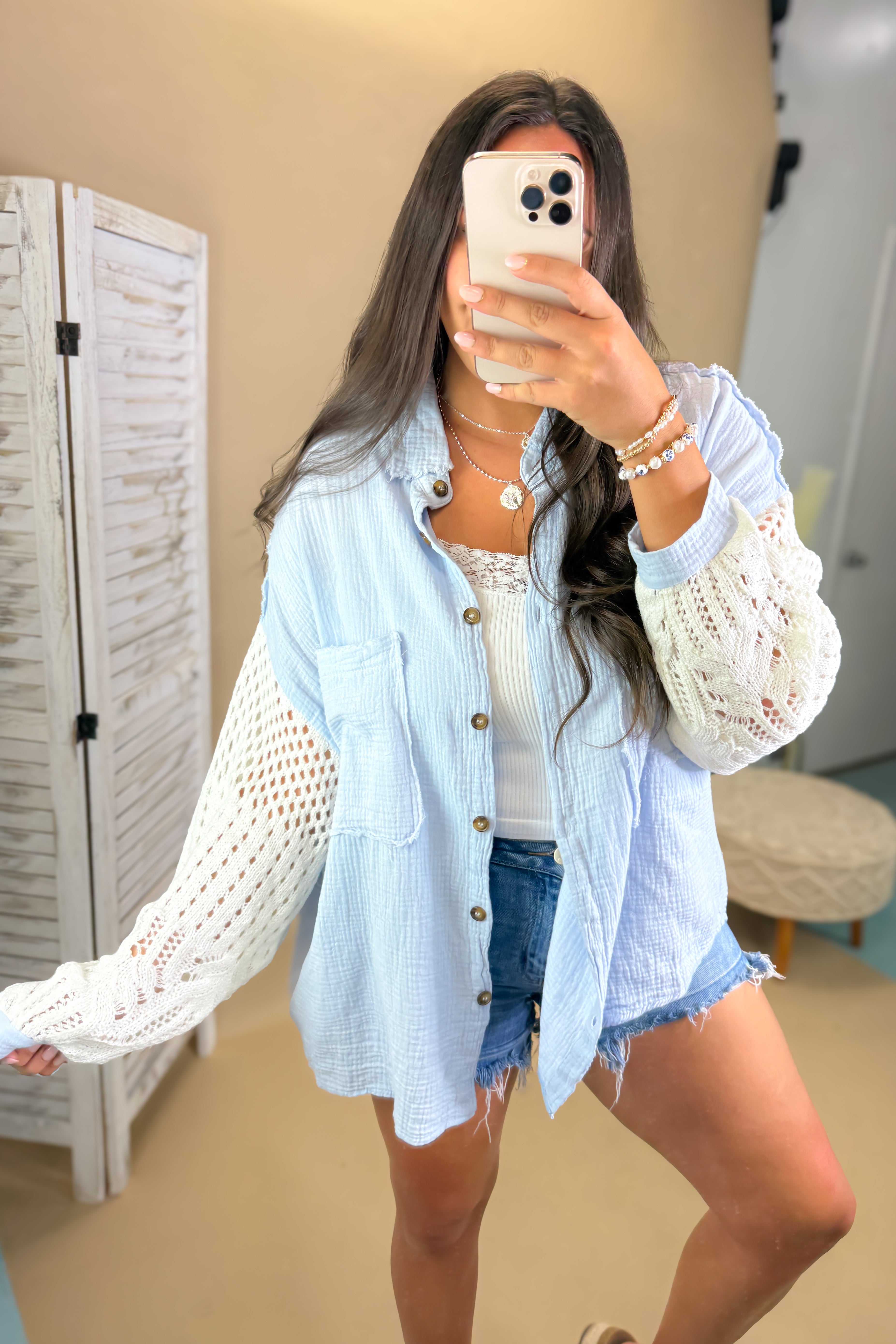 - Lightweight blue button up top with gorgeous front pocket details and distressed hem