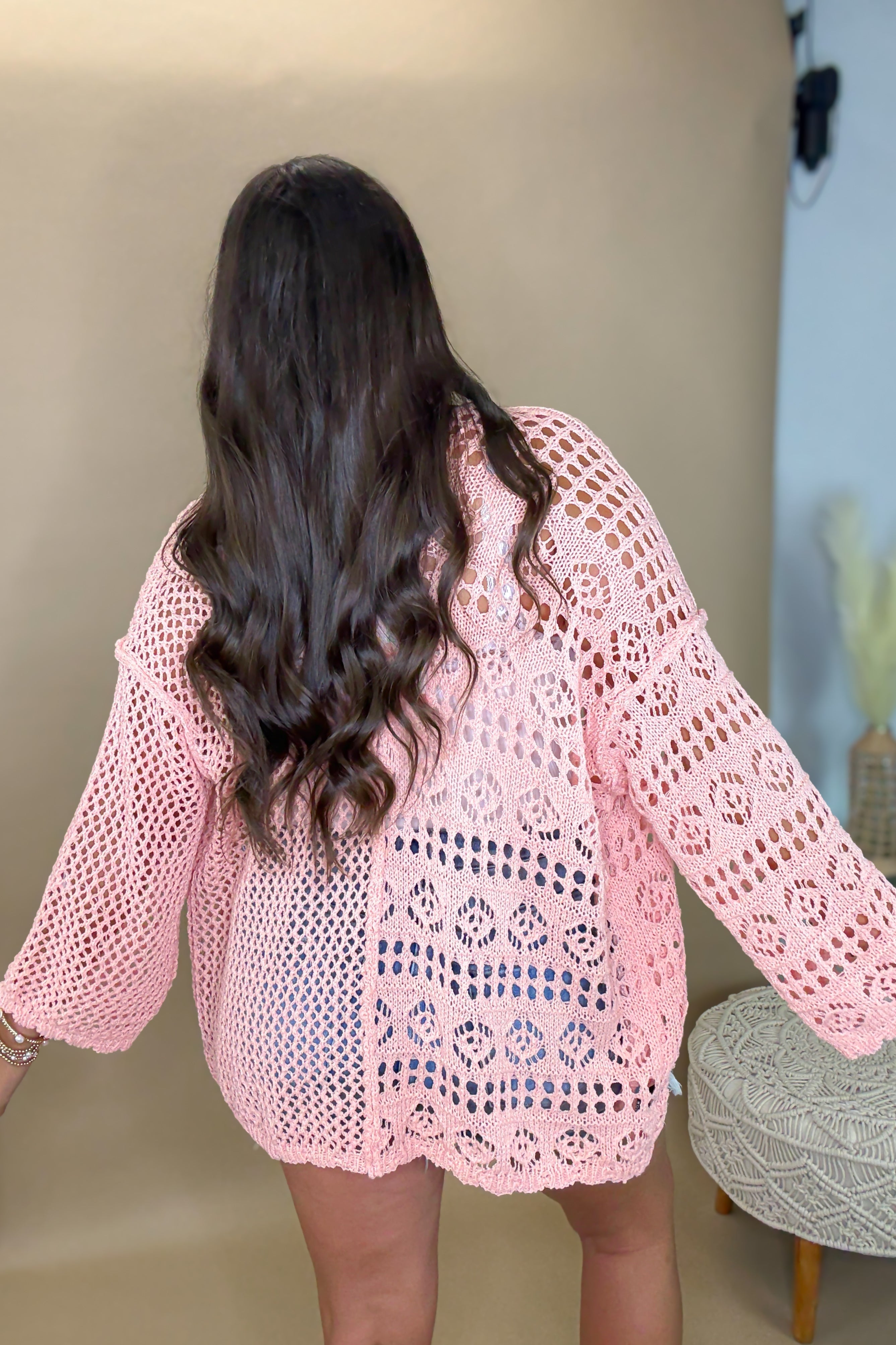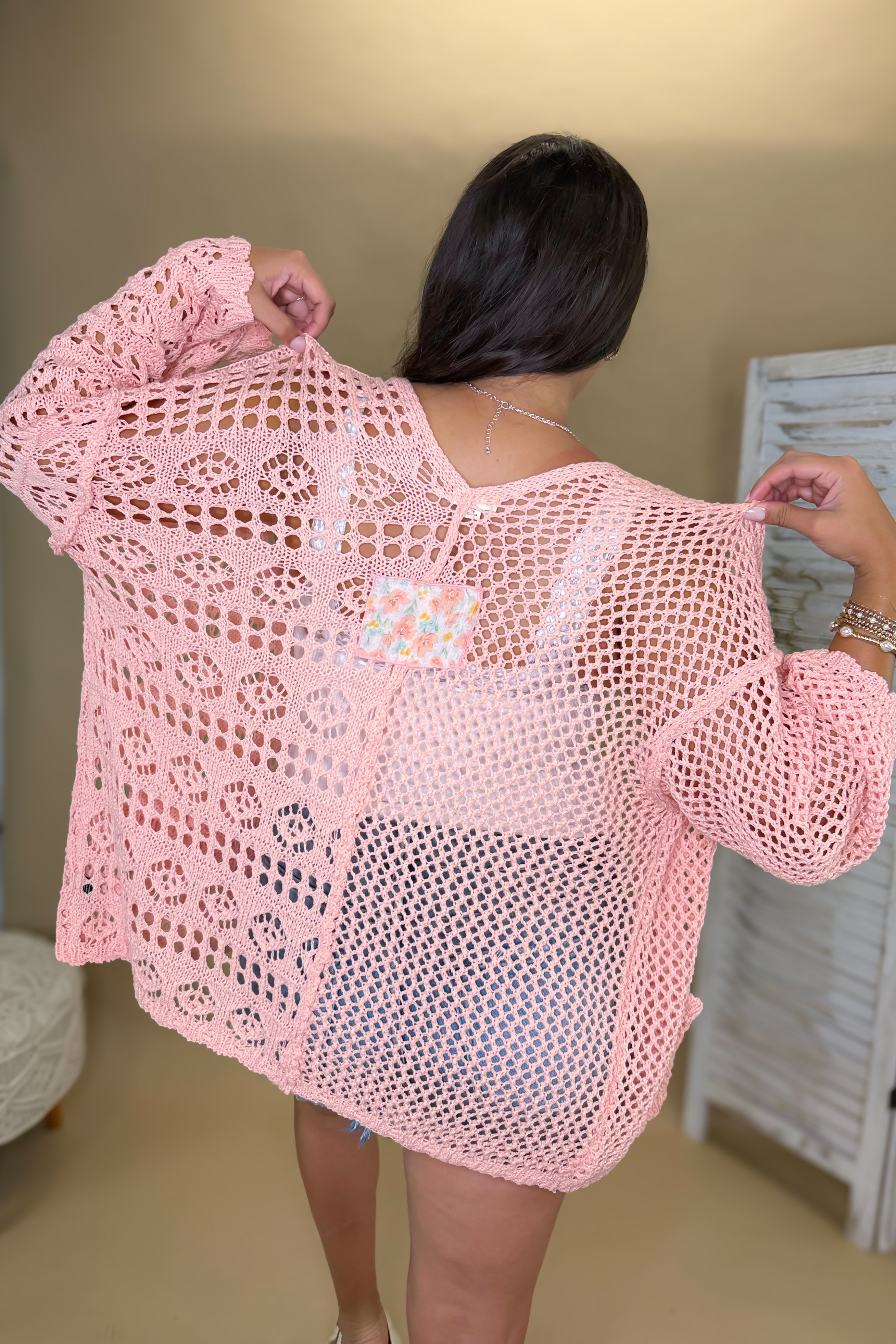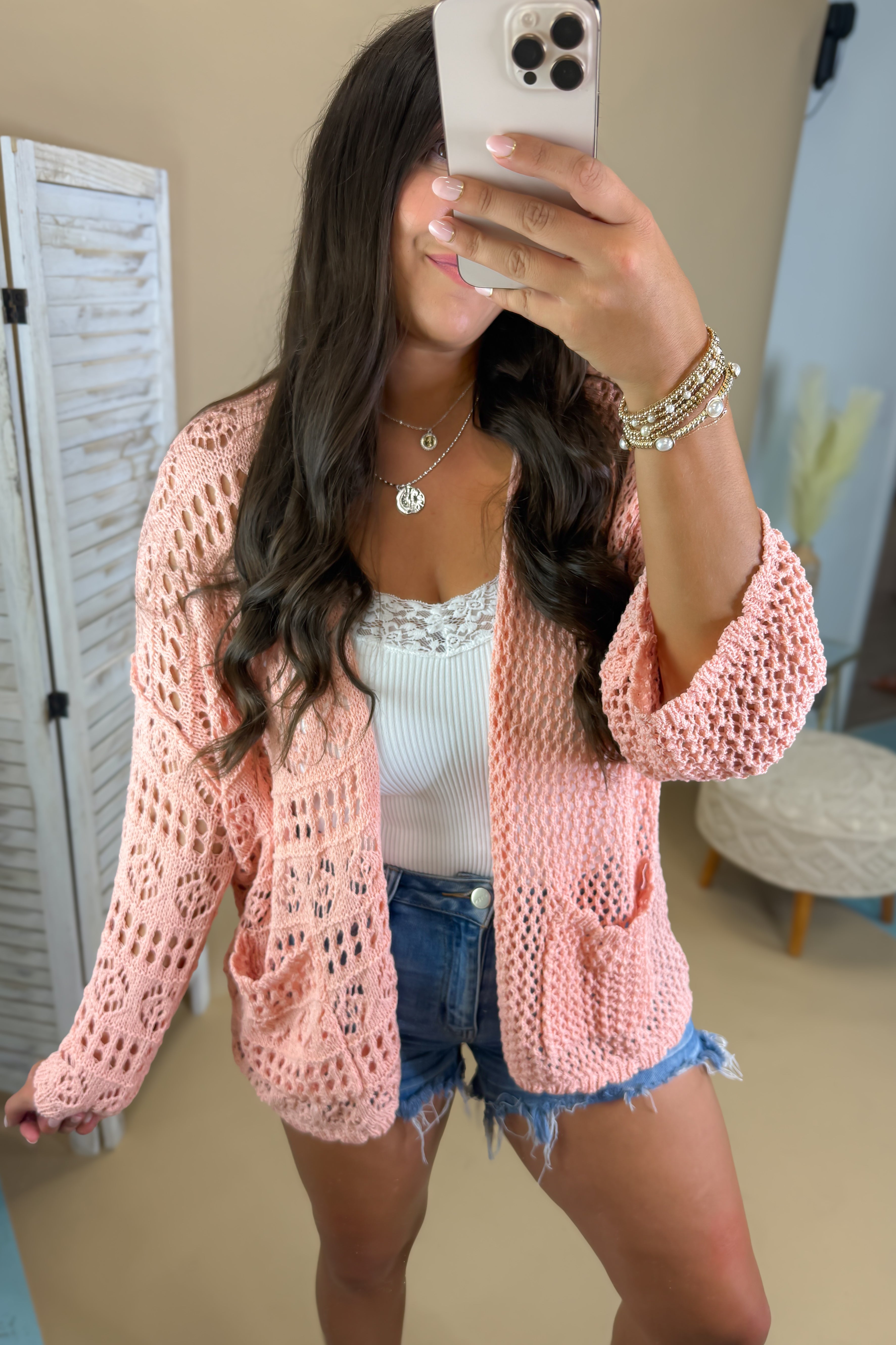 - Peach color crochet cardigan with an oversized, slouchy fit