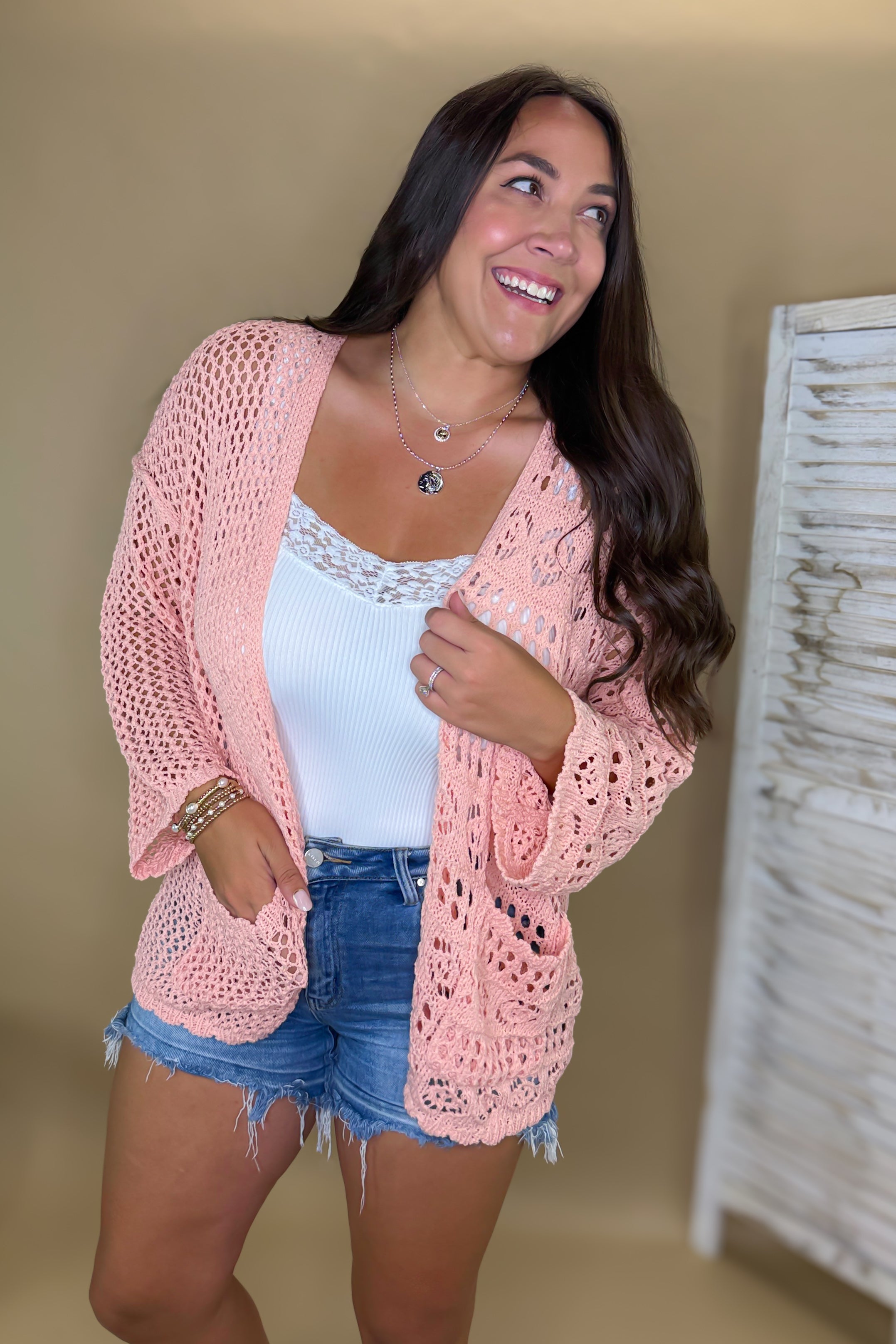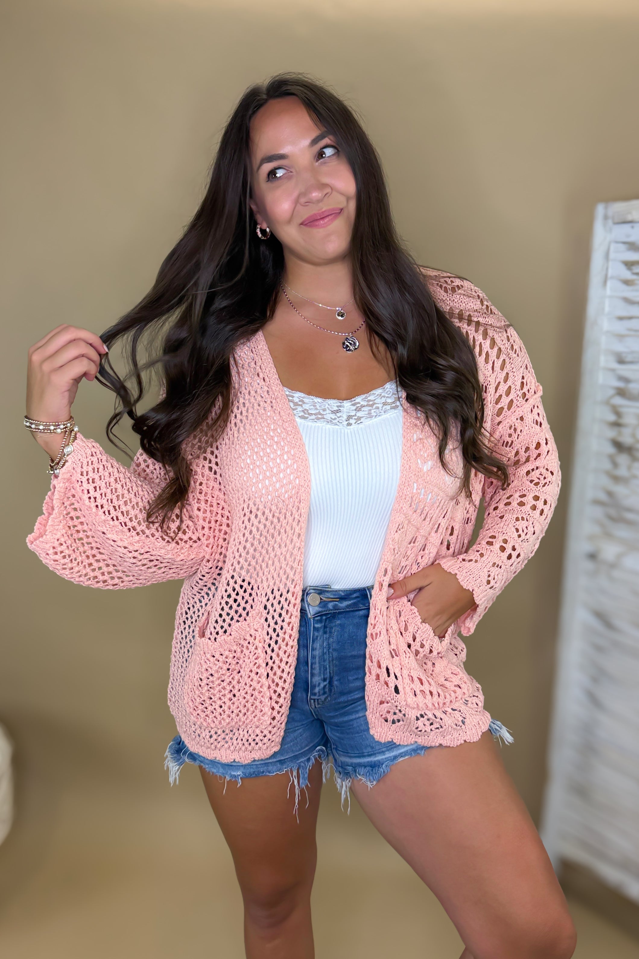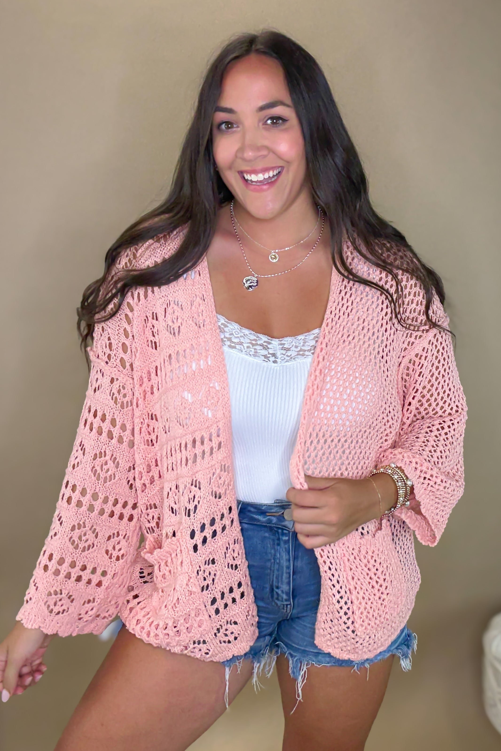 - Peach color crochet cardigan with an oversized, slouchy fit