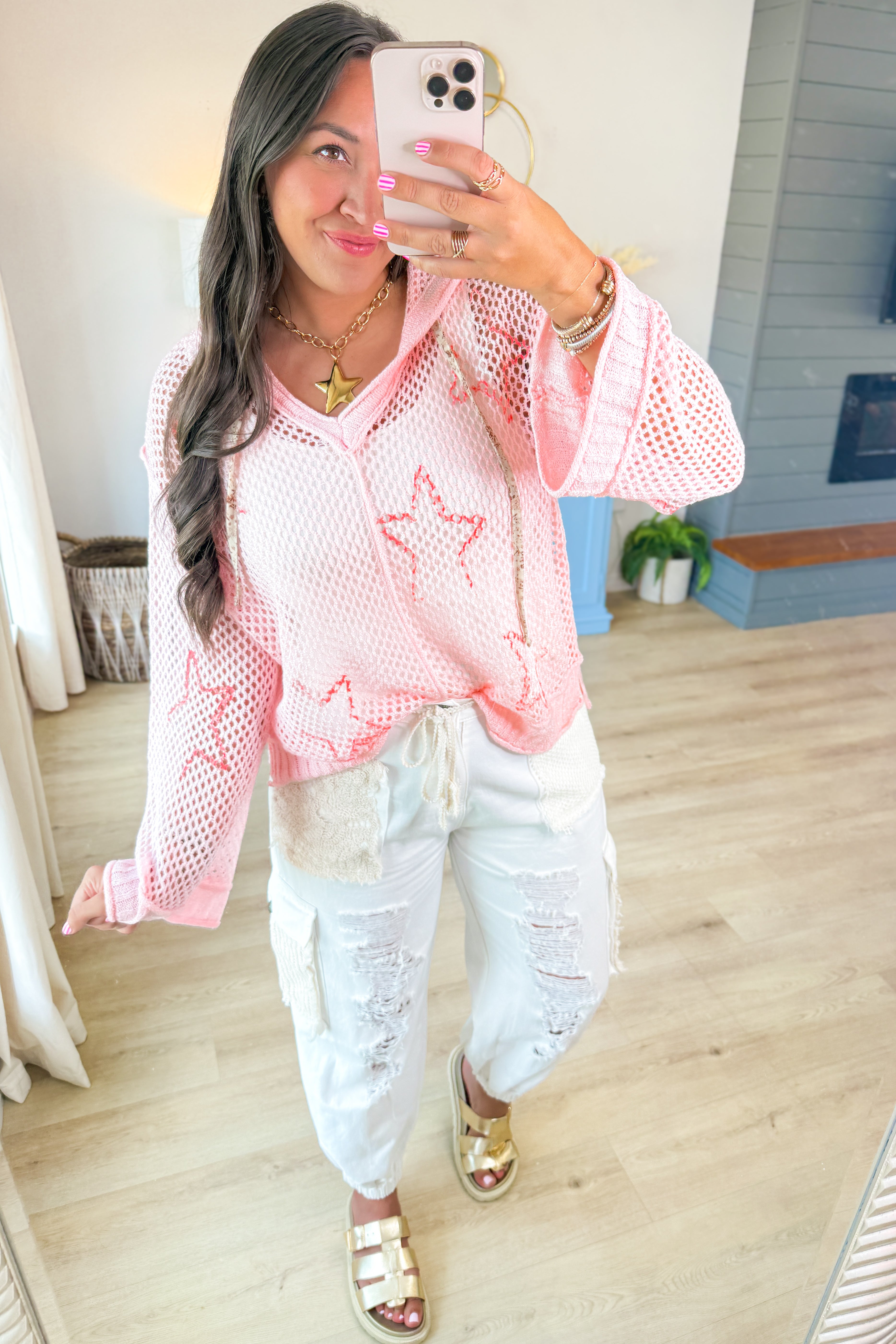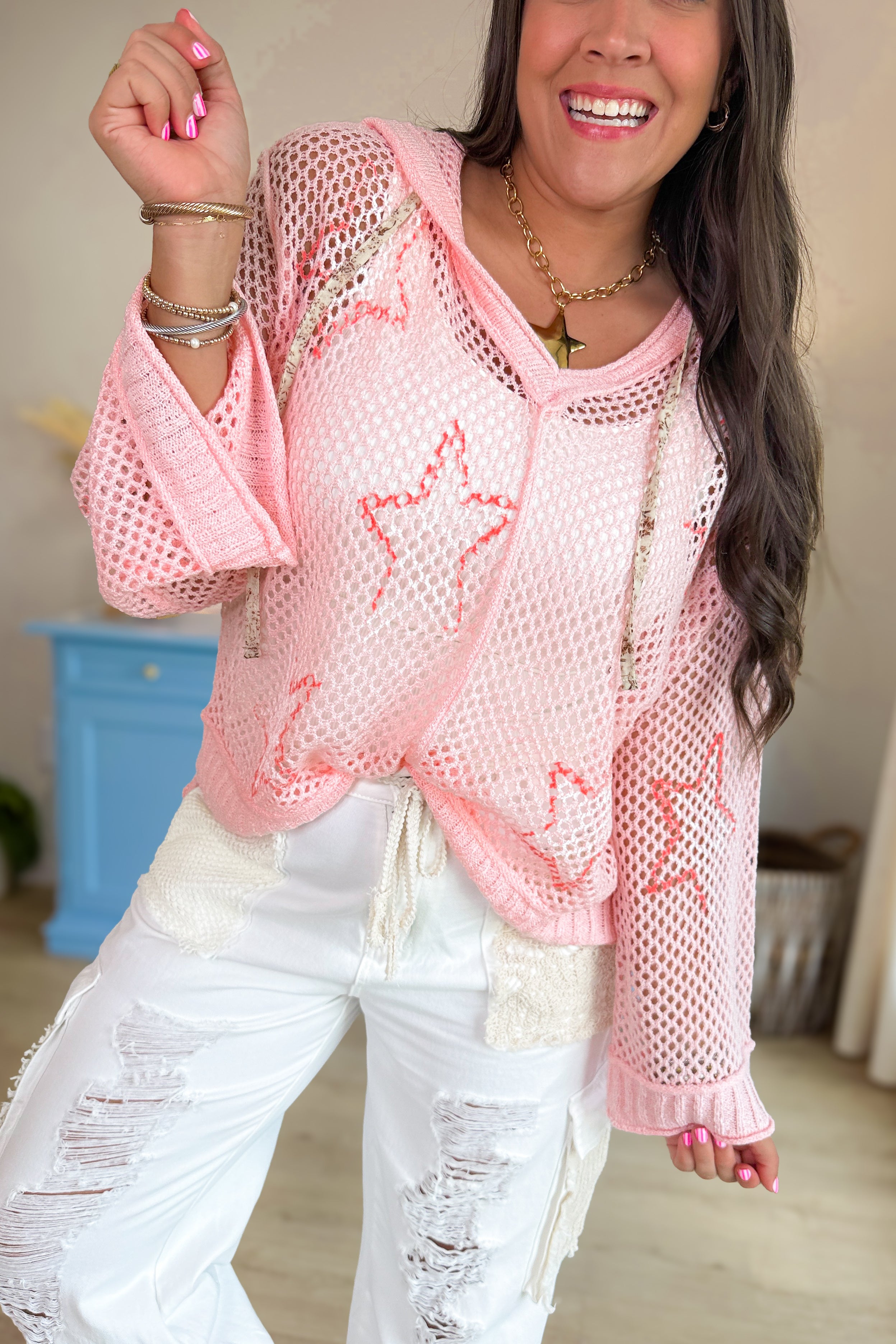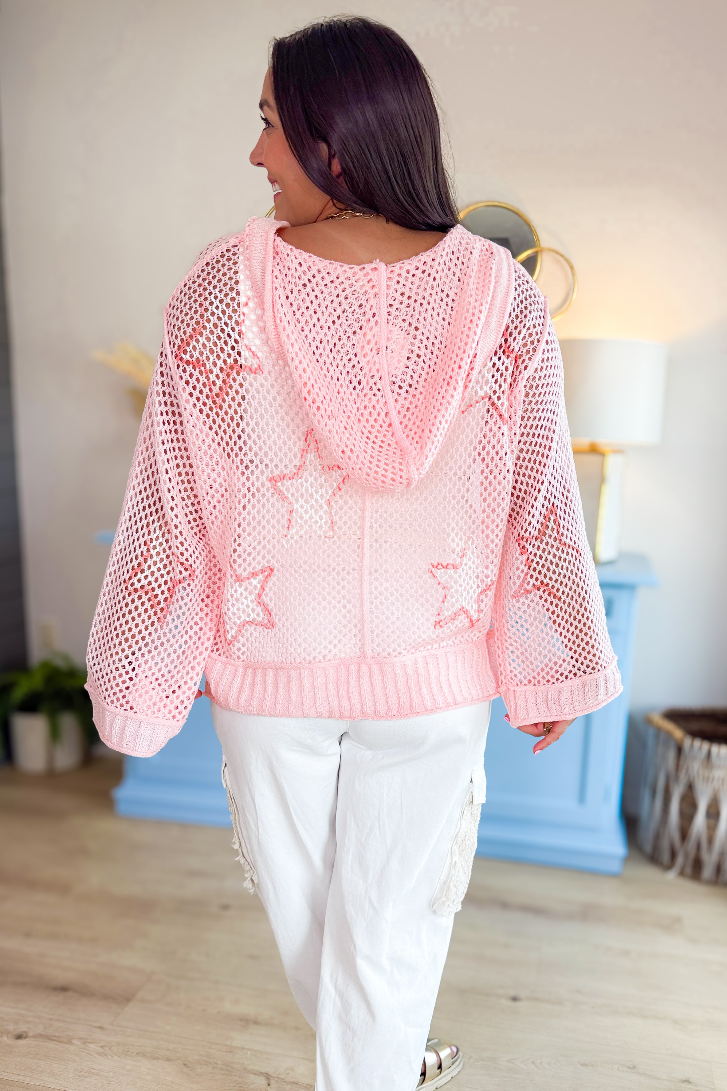 - Crochet light weight hoodie with fun star print details!