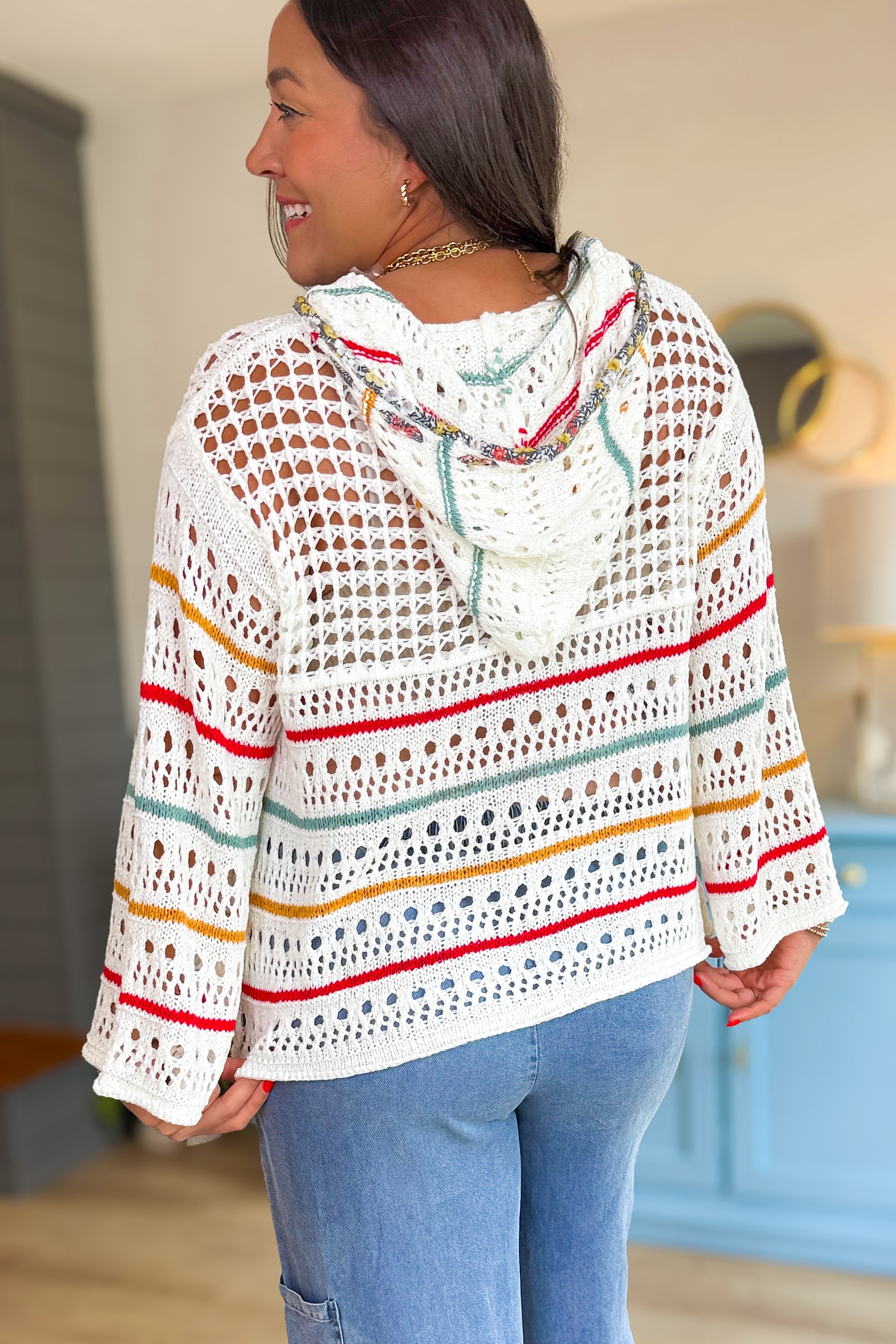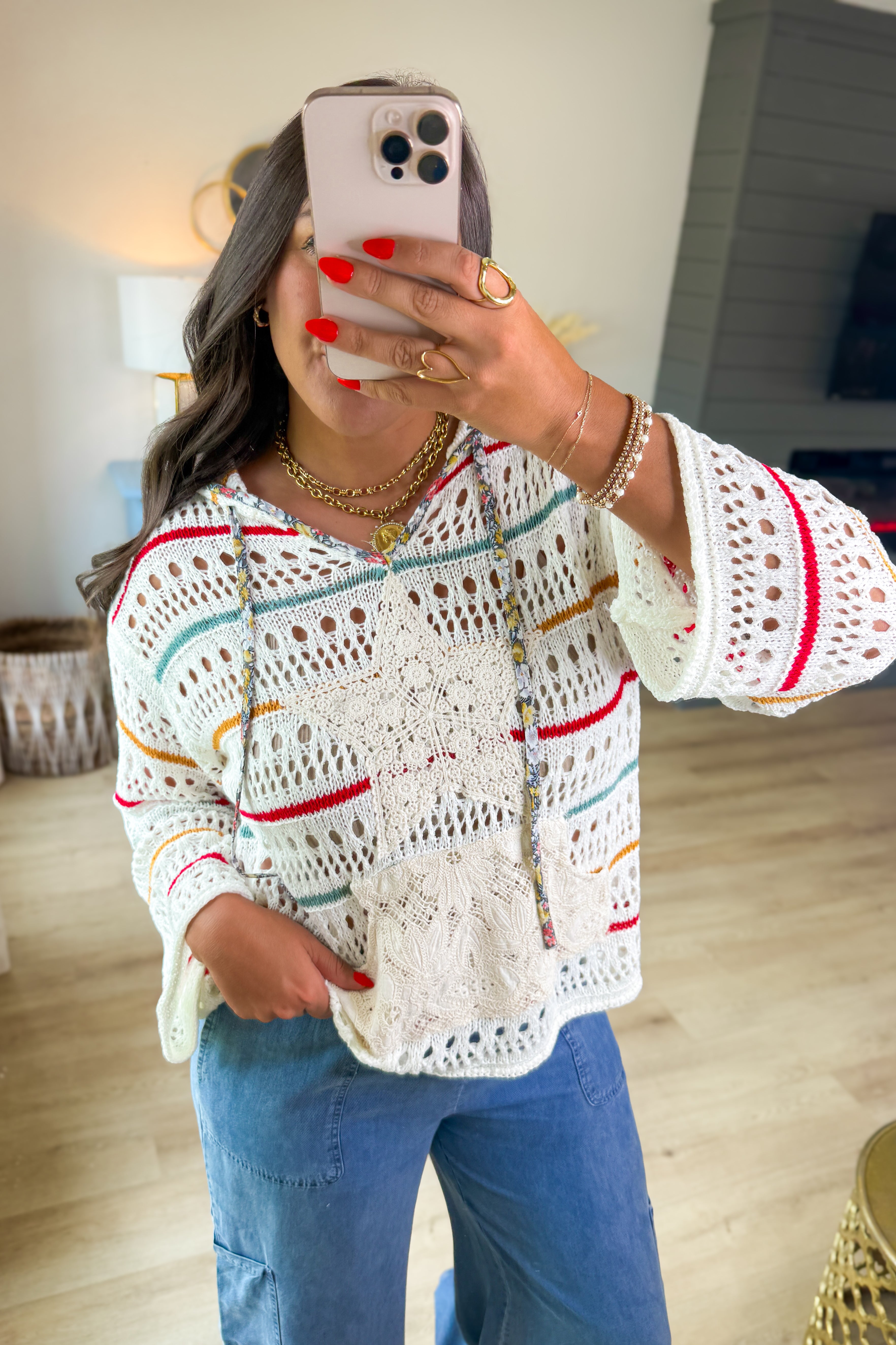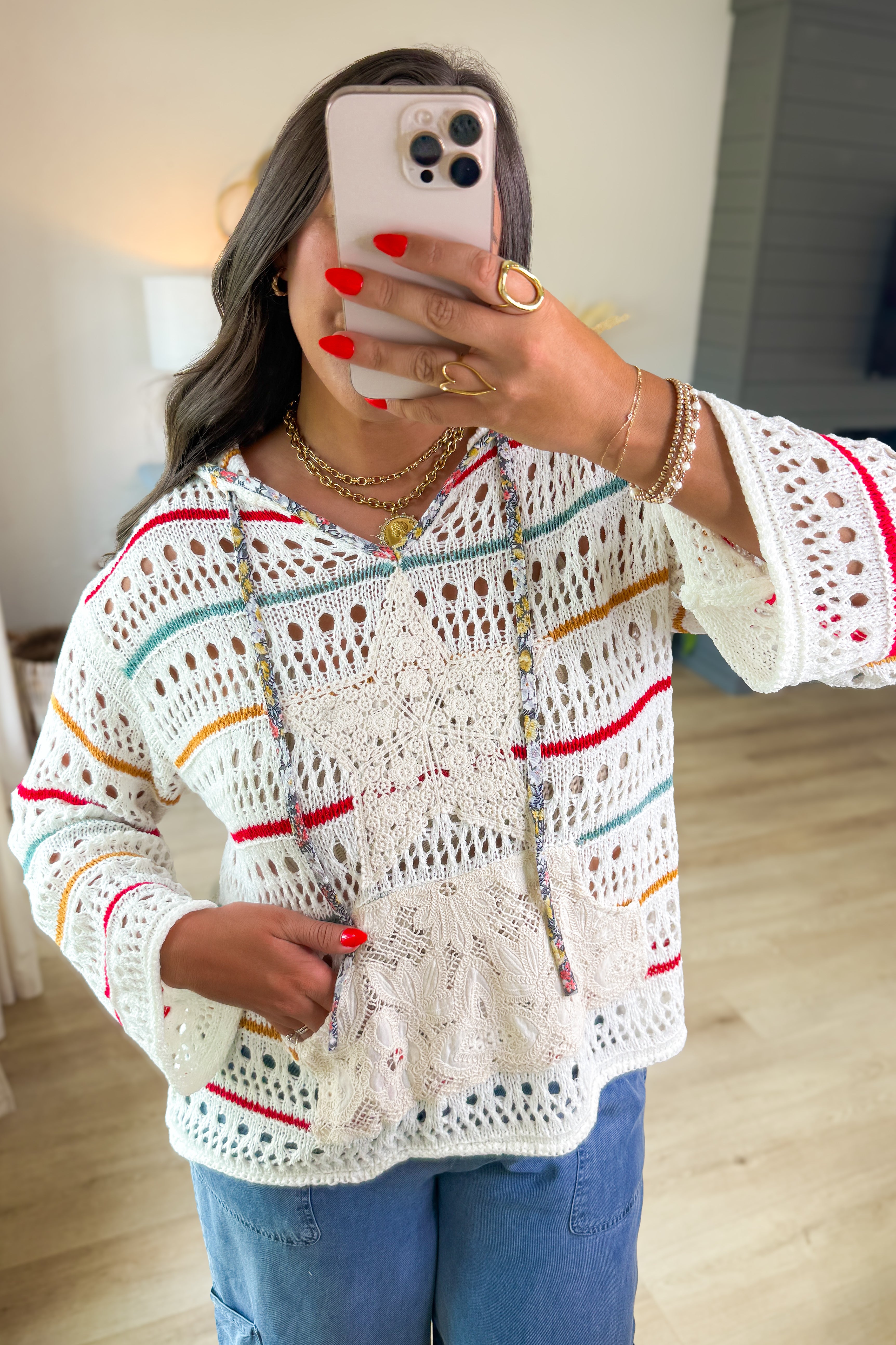 - Stunning lightweight crochet hoodie with fun colors, a star lace patch on the front with a lace front pocket