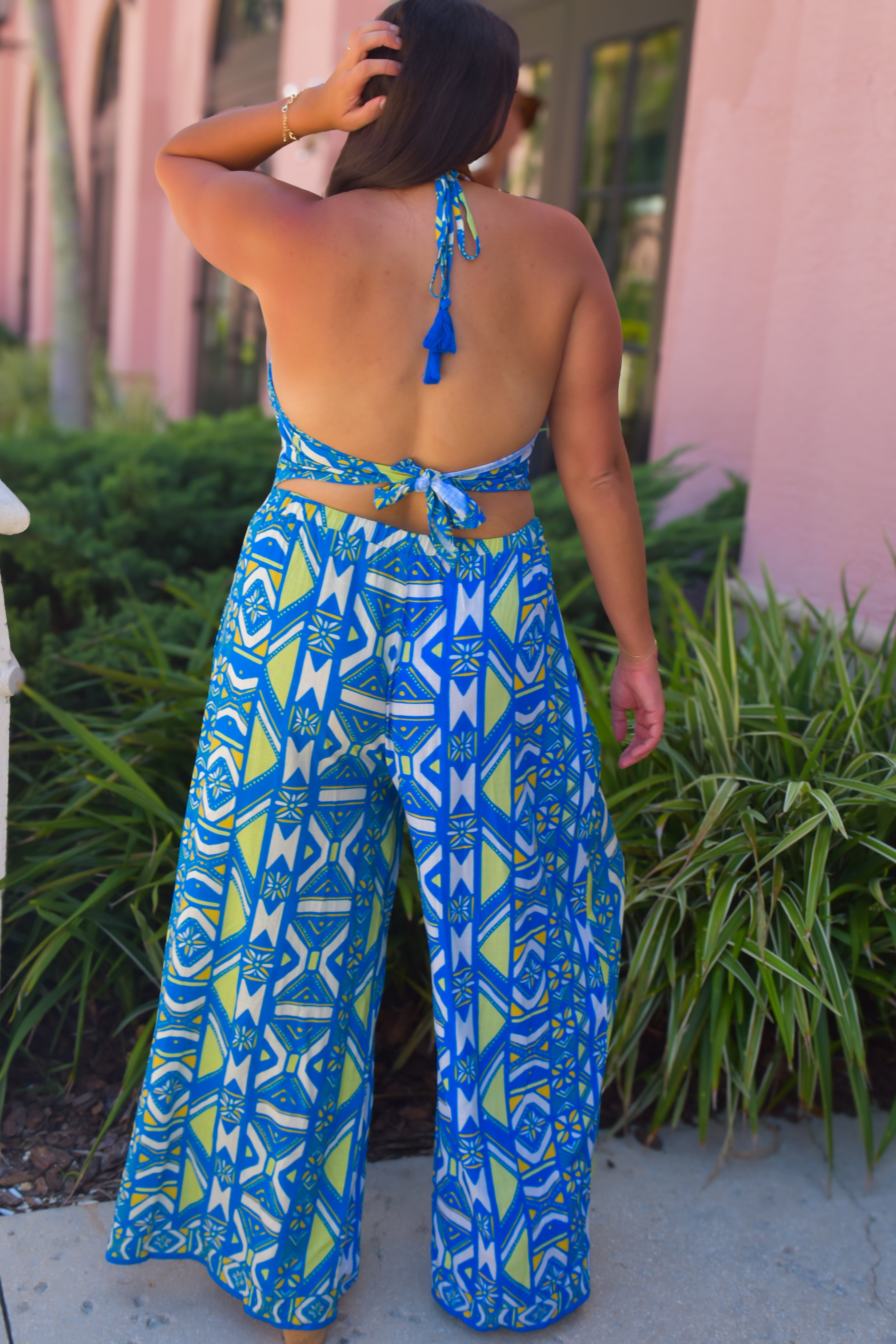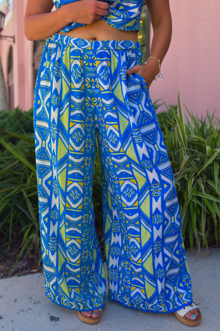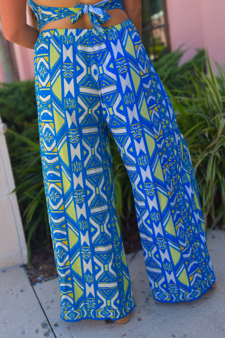 - Flow through summer in the Rio Vibes Wide-Leg Pants that match perfectly with the Rio Vibes Tie Back Top! Designed with the same bold tropical print as the top, these high-waisted pants feature an elastic back waistband and breezy, wide-leg silhouette for effortless movement and comfort. The lightweight fabric makes them a dream for beach trips, tropical nights, or just turning heads on the boardwalk.