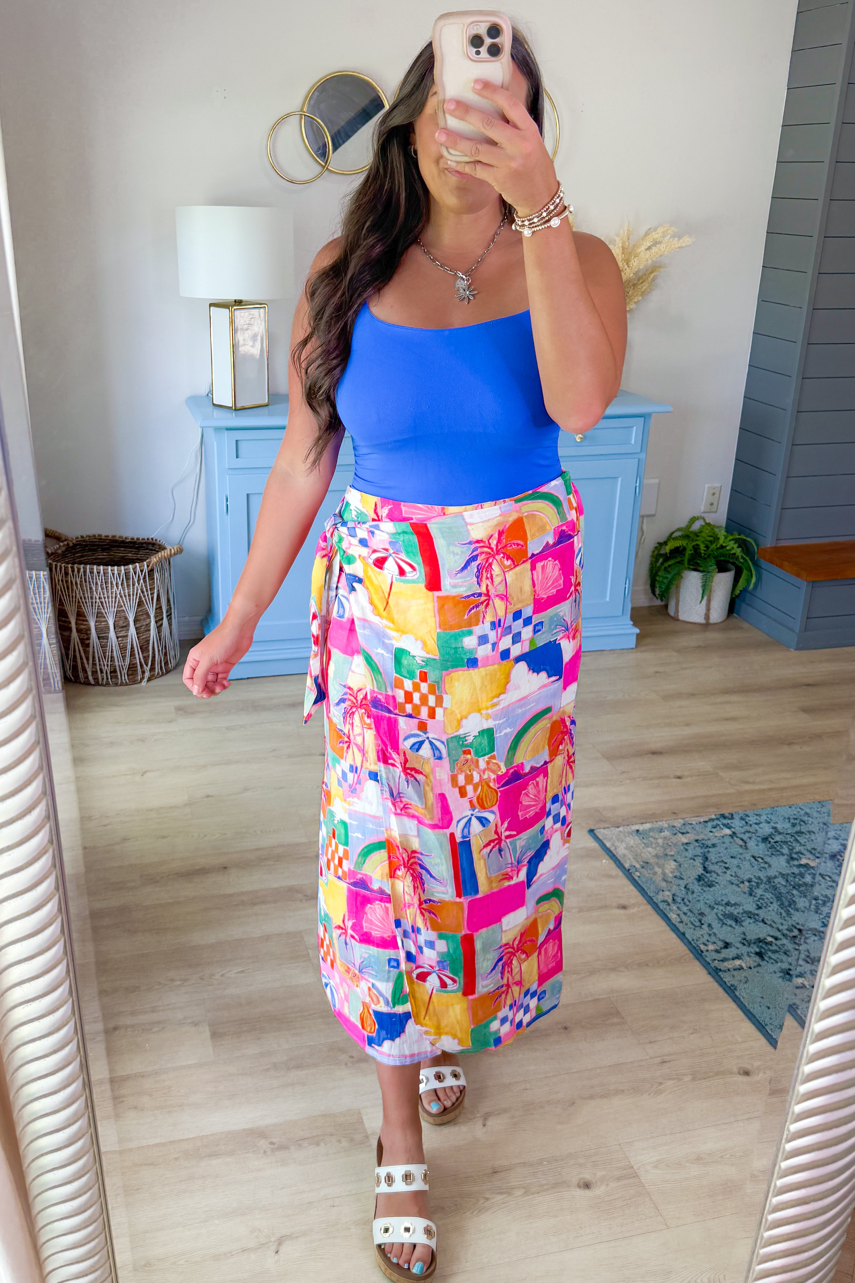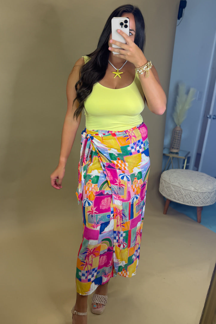 - Say hello to sunshine in The Calypso Coast Wrap Skirt! This vibrant tropical wrap skirt features bold watercolor prints inspired by island getaways. The easy tie waist lets you adjust for the perfect fit while the flowy silhouette gives effortless movement with every step. Pair it with your favorite crop, swimwear, or resort top for an instantly chic vacation look.
