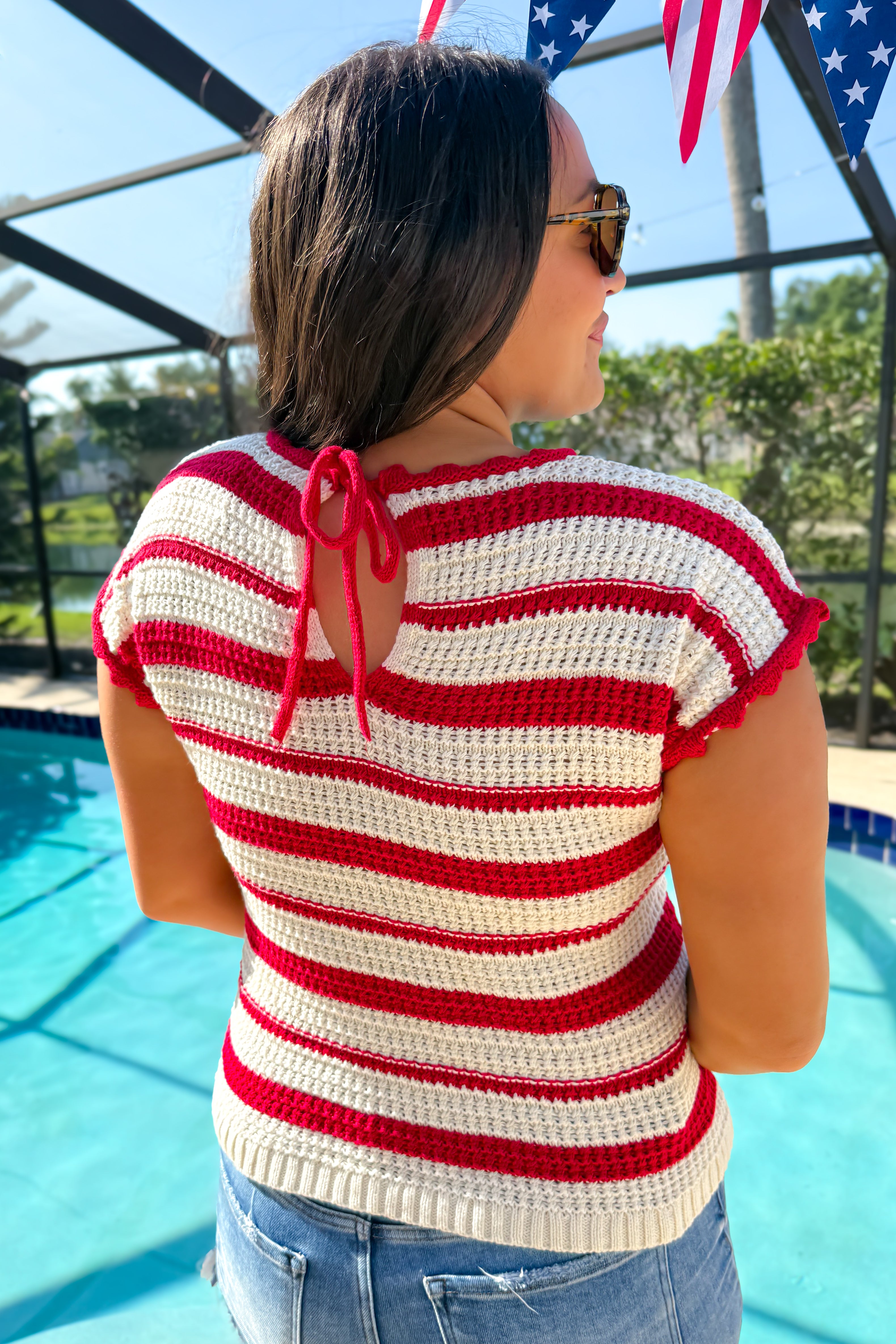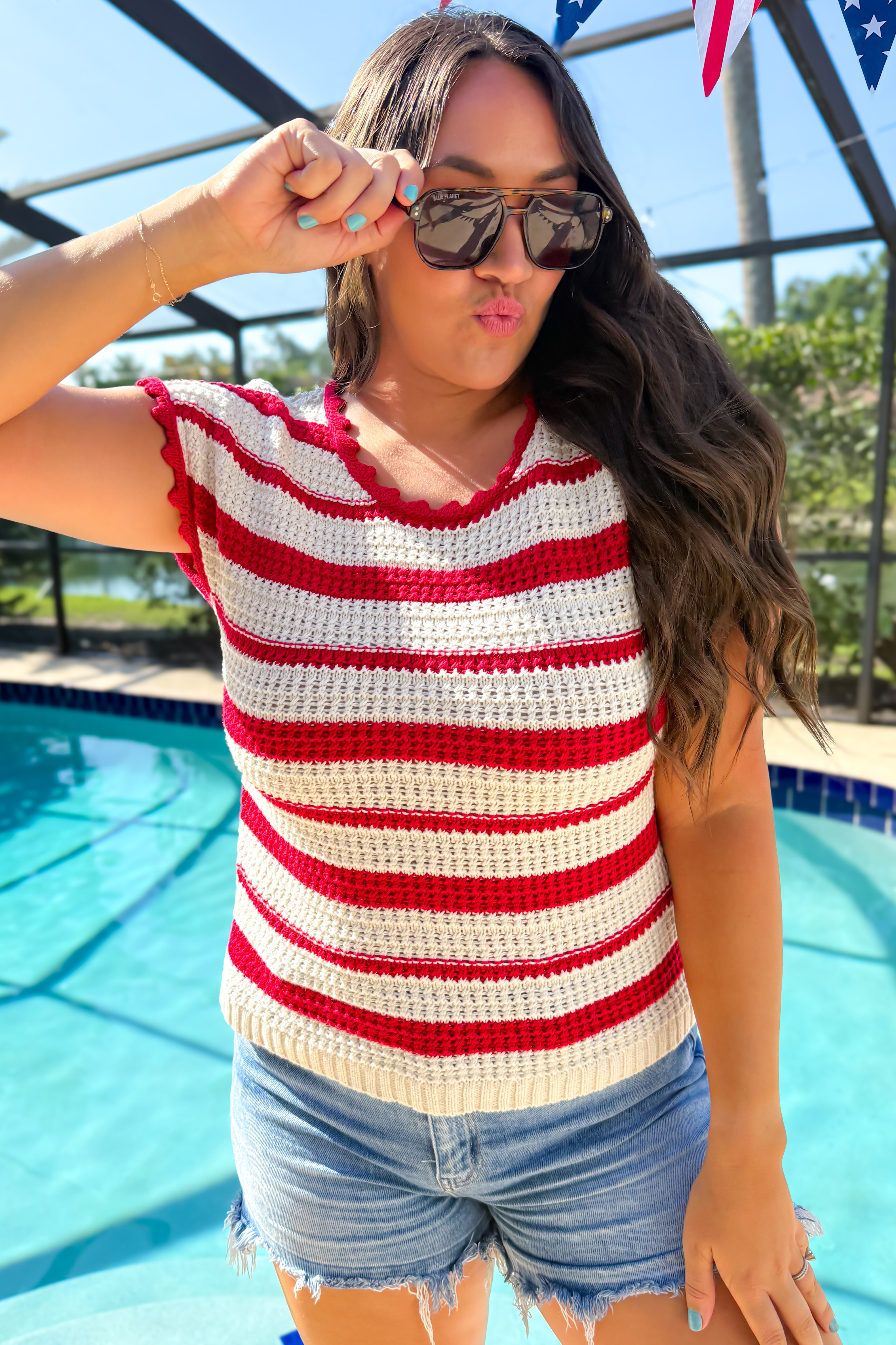 - Meet the Nantucket Knit Tee – your new go-to for breezy days and coastal vibes. This lightweight short sleeve sweater features a classic red and ivory stripe pattern in a soft, breathable knit that’s perfect for summer layering. With a relaxed fit and subtle scalloped neckline, it’s easy to dress up or down for any occasion—from a beachside brunch to a casual office look. Style it with white denim, cutoffs, or over a swimsuit for effortless, laid-back charm.