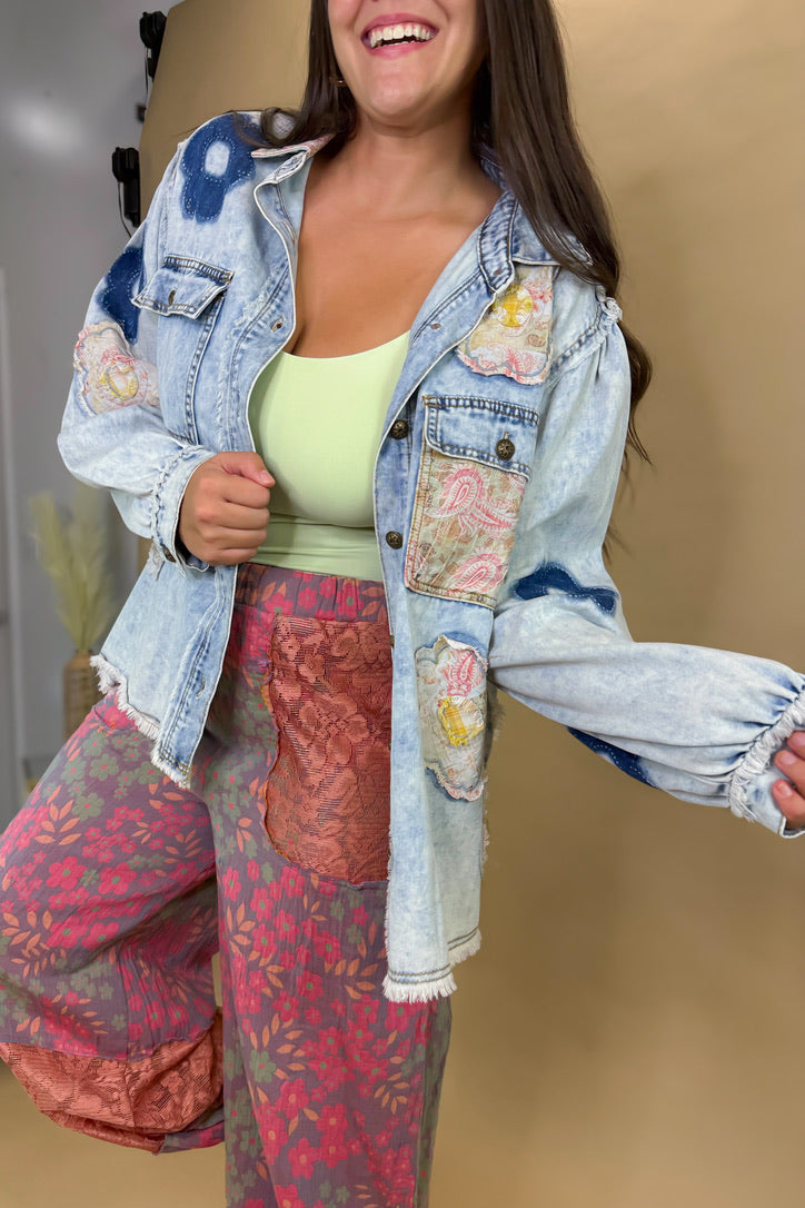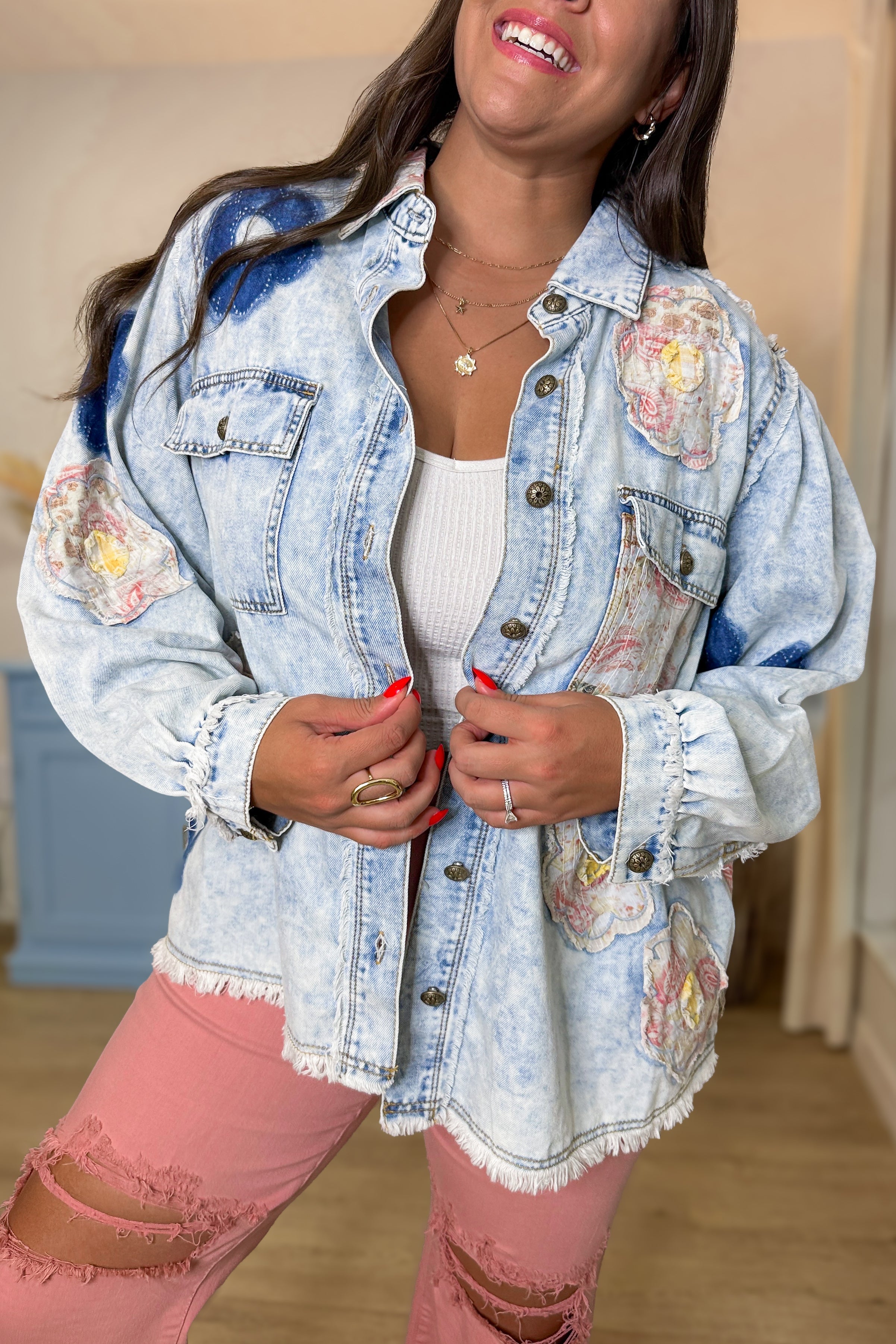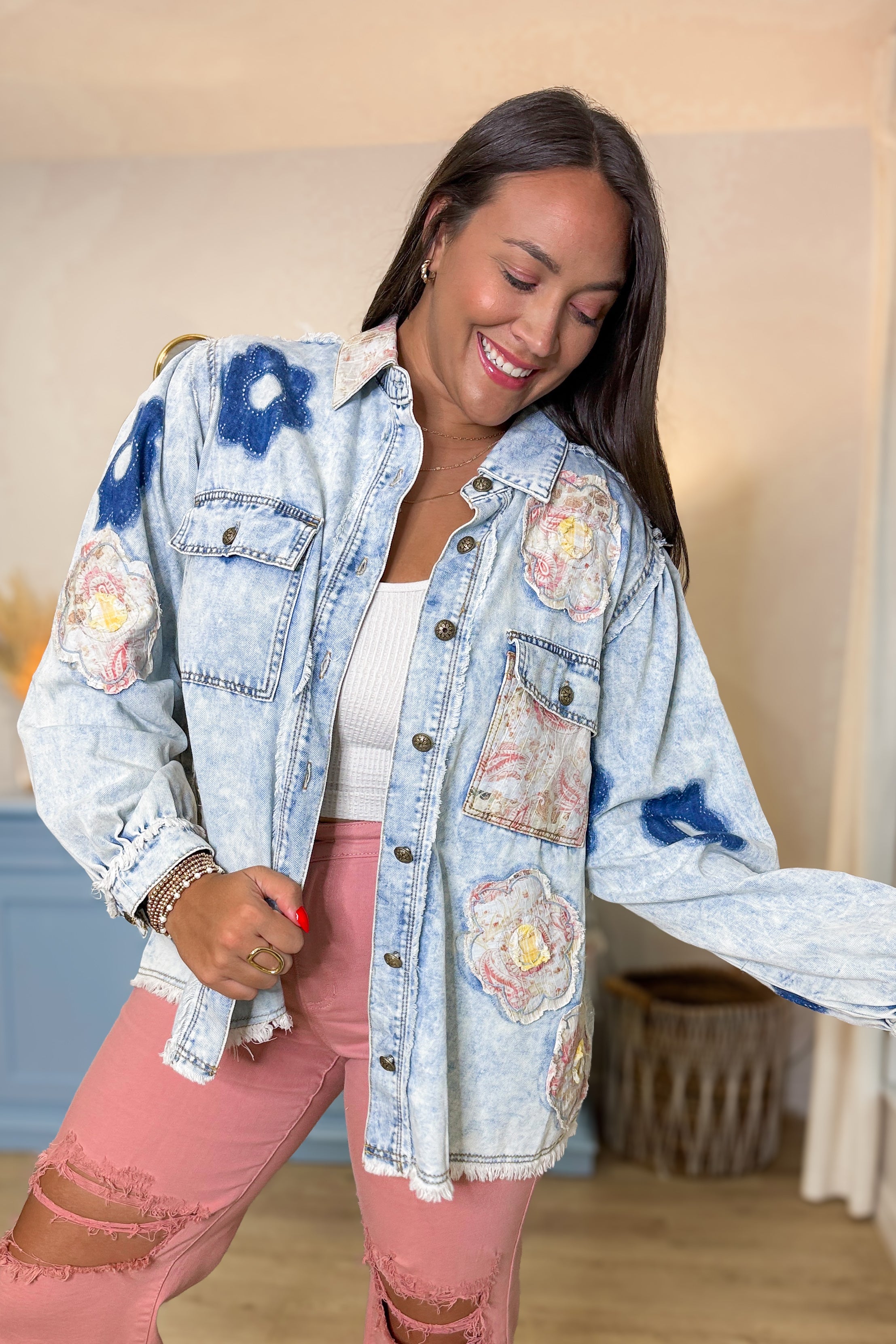 - Meet the Sunwashed Garden Denim Jacket — your new statement layer. This lightweight denim jacket features soft acid-wash tones paired with bold floral appliqués for that perfectly lived-in, one-of-a-kind feel. The relaxed oversized fit makes it easy to throw on over your favorite basics, dresses, or even swimwear for a laid-back coastal vibe.
