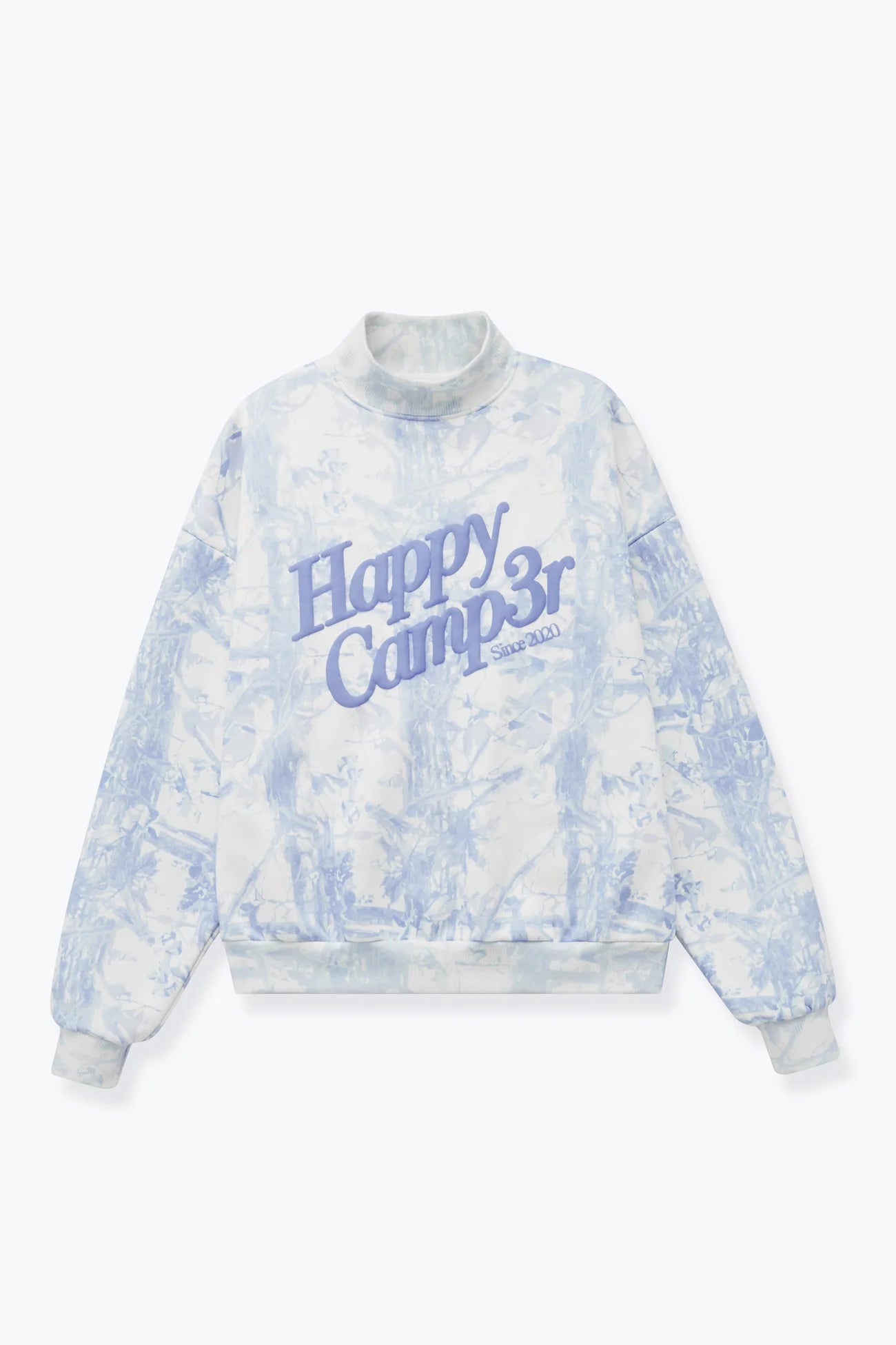 Meet the standout of the season - our Soft Blue Camo Mockneck Sweatshirt, designed to keep you cozy while making a statement. This dreamy blue-on-white camo print blends effortless style with the comfort you know and love from Happy Camp3r.