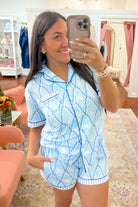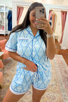 - A buttery-soft pajama set featuring a relaxed button-up top and comfy drawstring shorts.