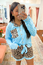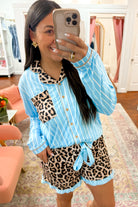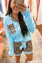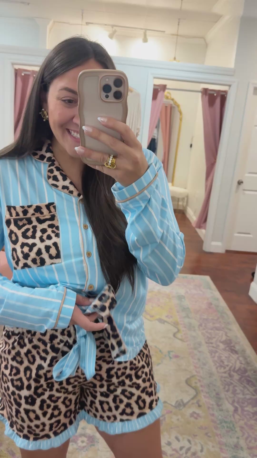 A soft and stretchy pajama set with a button-up top and matching drawstring shorts.