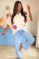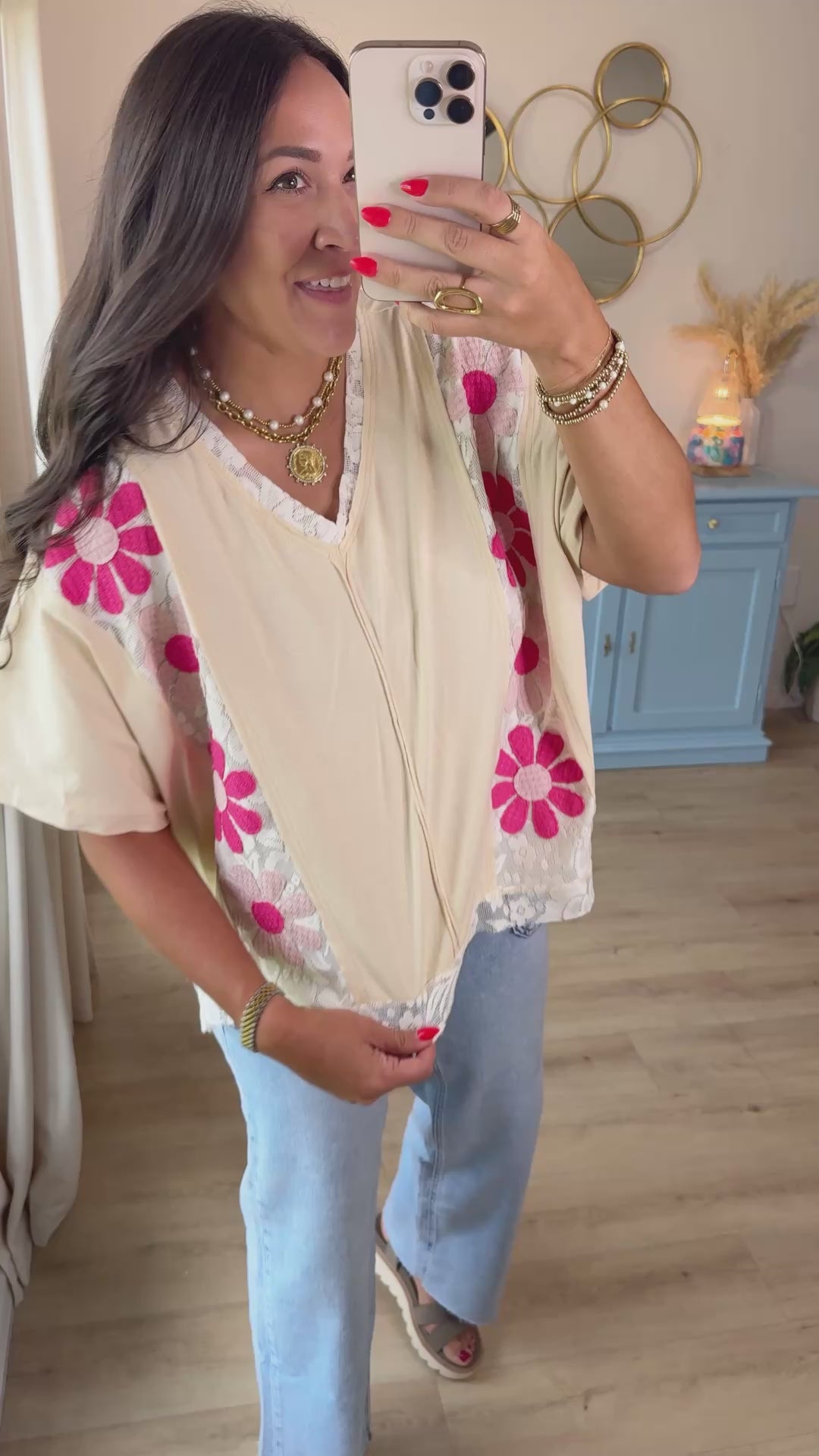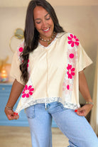 • The Daisy Dreams Top is pure sunshine in a shirt. Featuring soft cream fabric, oversized fit, delicate lace paneling, and embroidered pink daisy details, this top is designed to bring a touch of whimsy to your everyday style. Pair it with the matching shorts for the full look or wear it with your favorite denim for a casual-chic vibe.