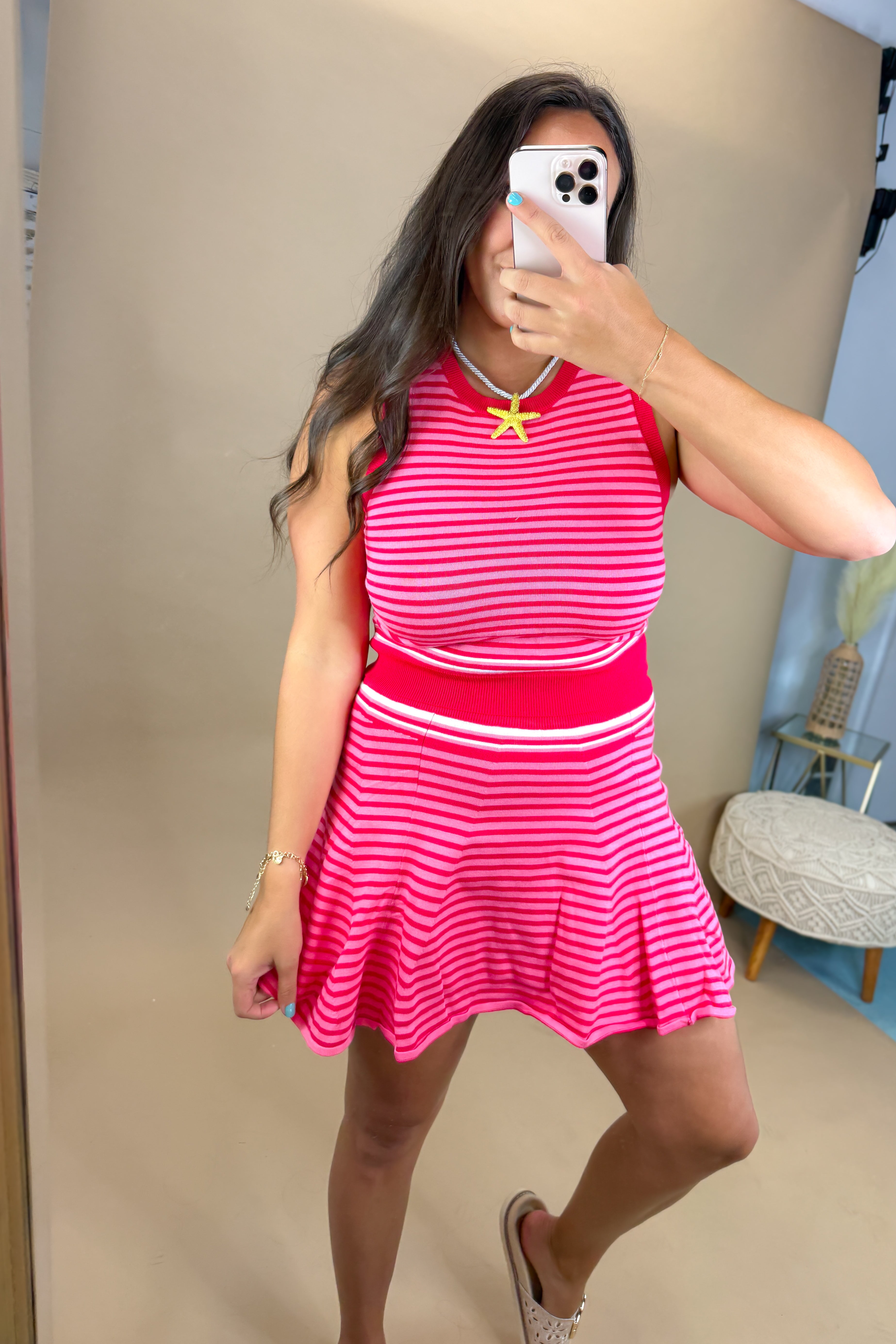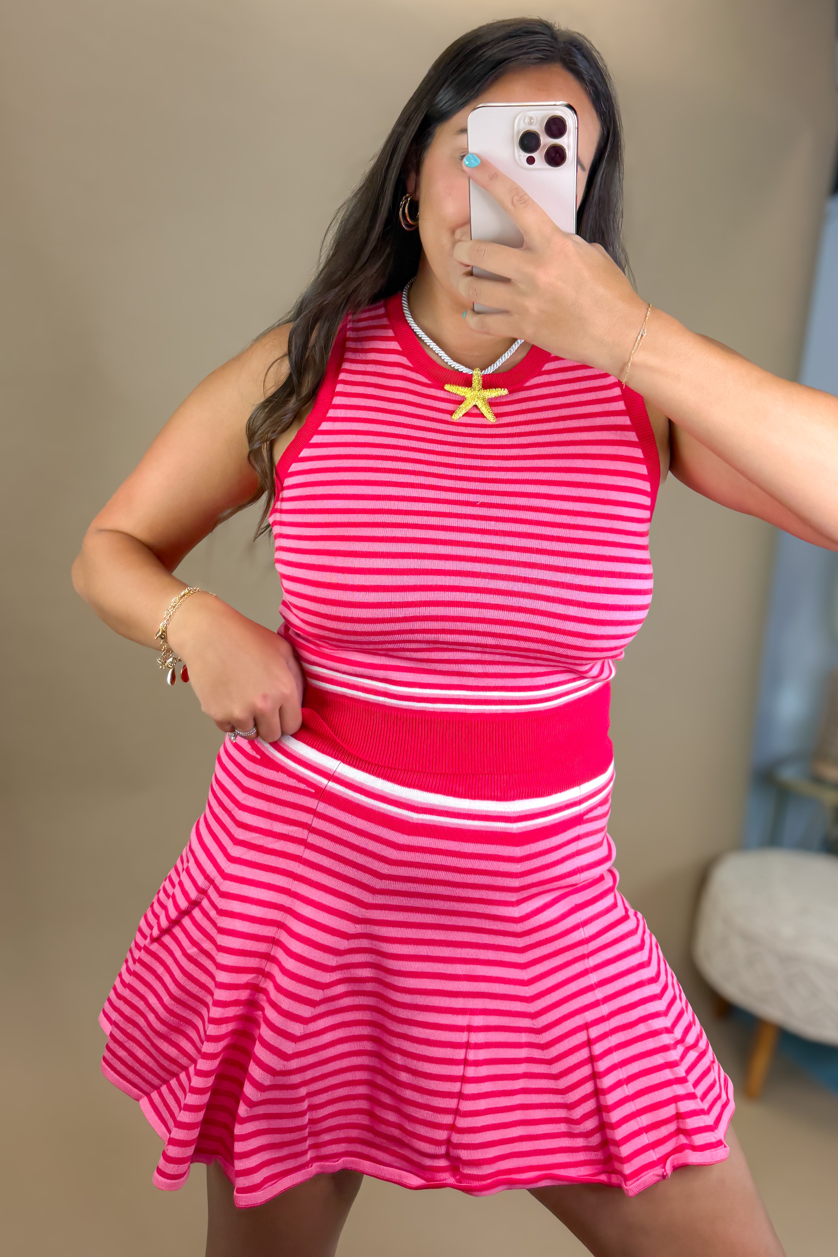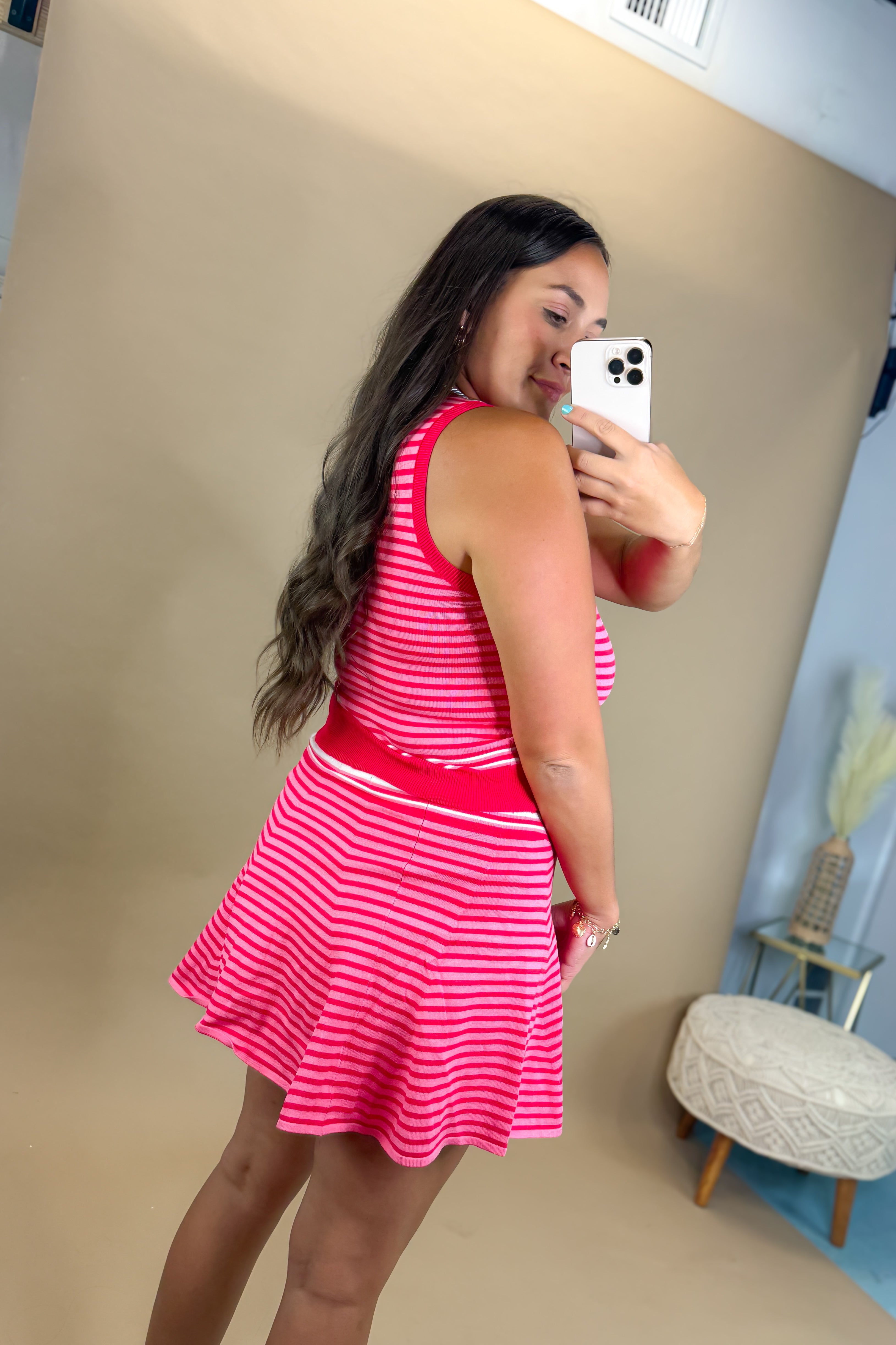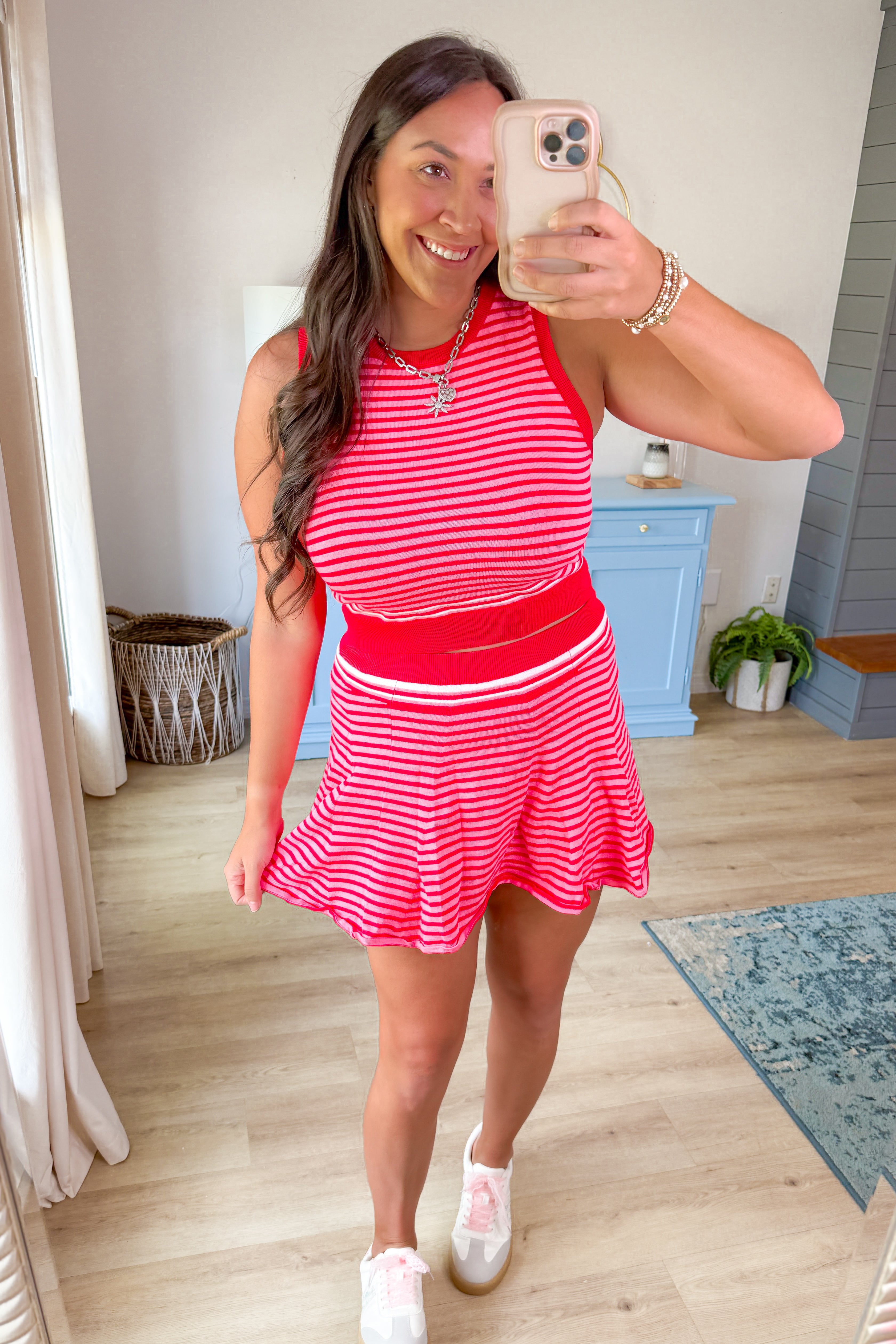 • Flirty meets functional in the Ruby Stripe Knit Skort. This red and pink striped mini skort features built-in shorts underneath, a soft stretch waistband, and a swingy hemline that moves with you. It’s comfy, playful, and made for warm days when you want to feel cute without sacrificing comfort.