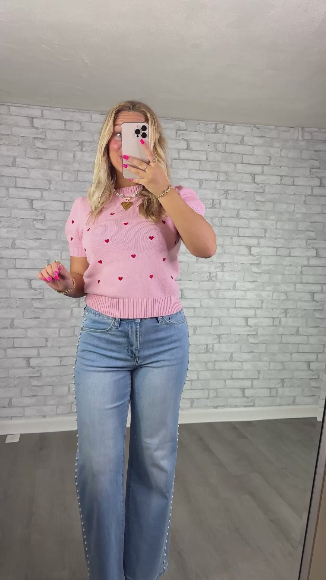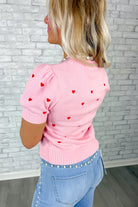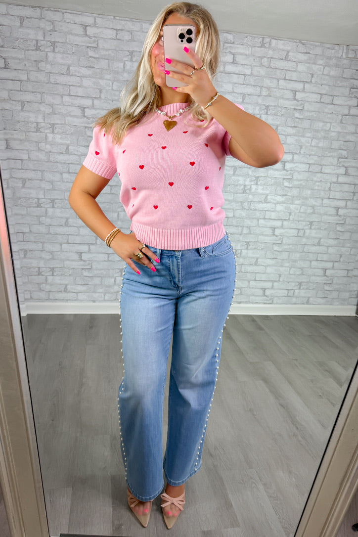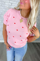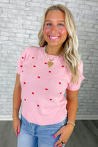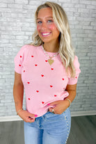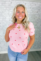 Soft pink knit sweater with a sweet allover embroidered red heart detail