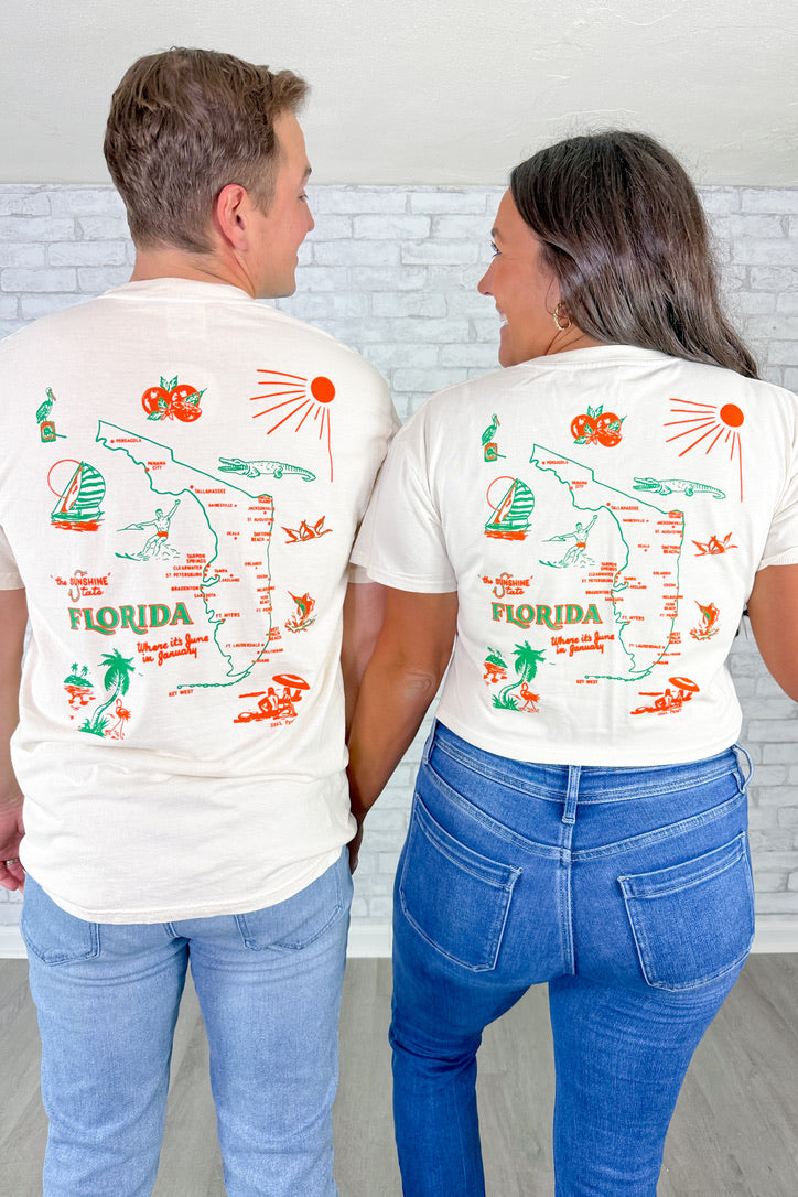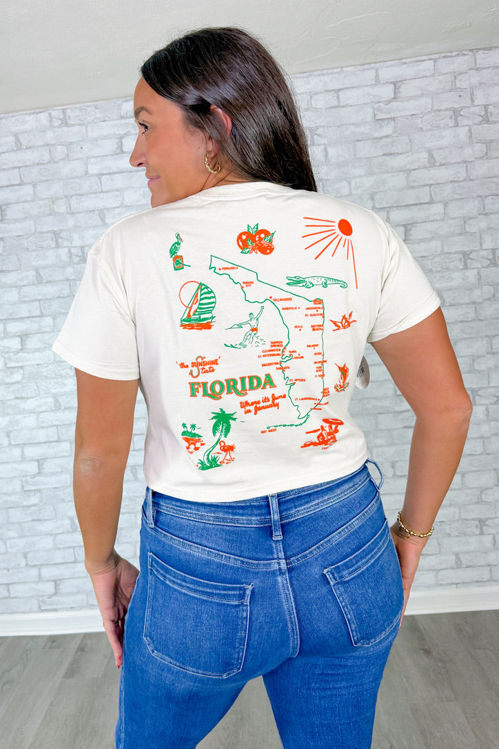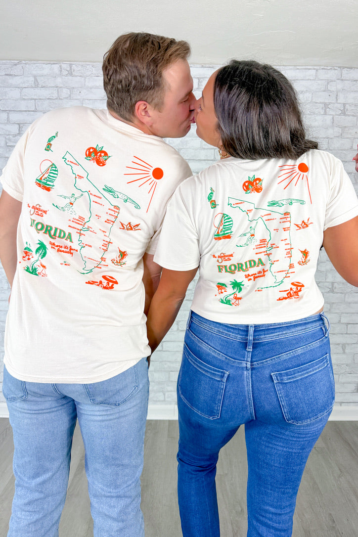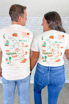 - Front chest graphic Sarasota, FL with a detailed Florida map design on the back for a true statement look