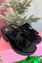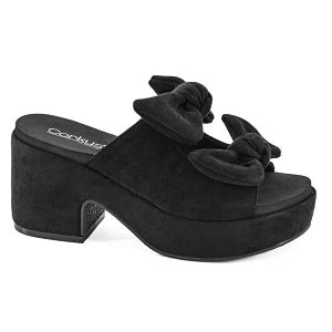 - Step into playful sophistication with these Corky’s sandals featuring chic velvet bows and a chunky platform heel.