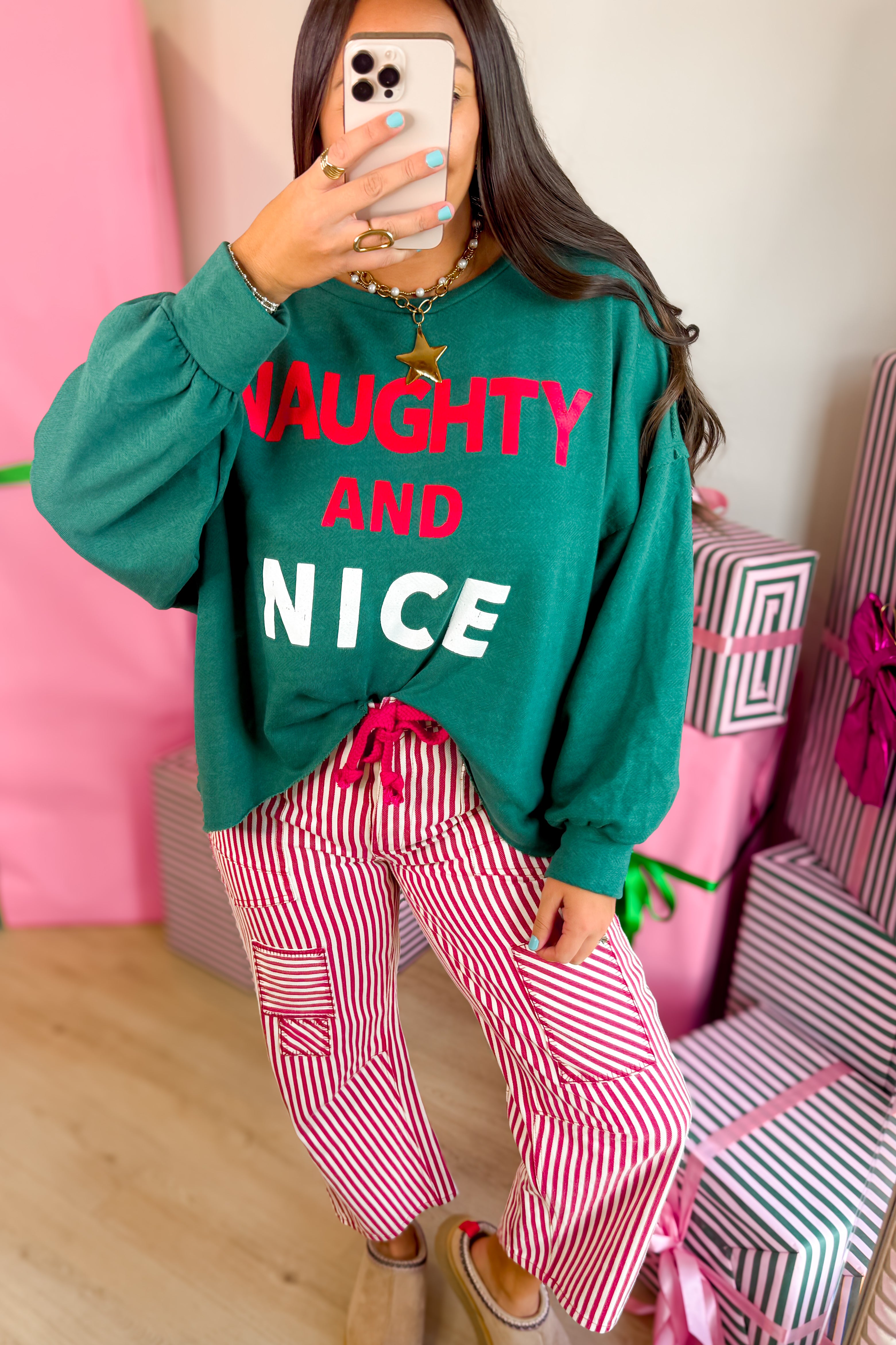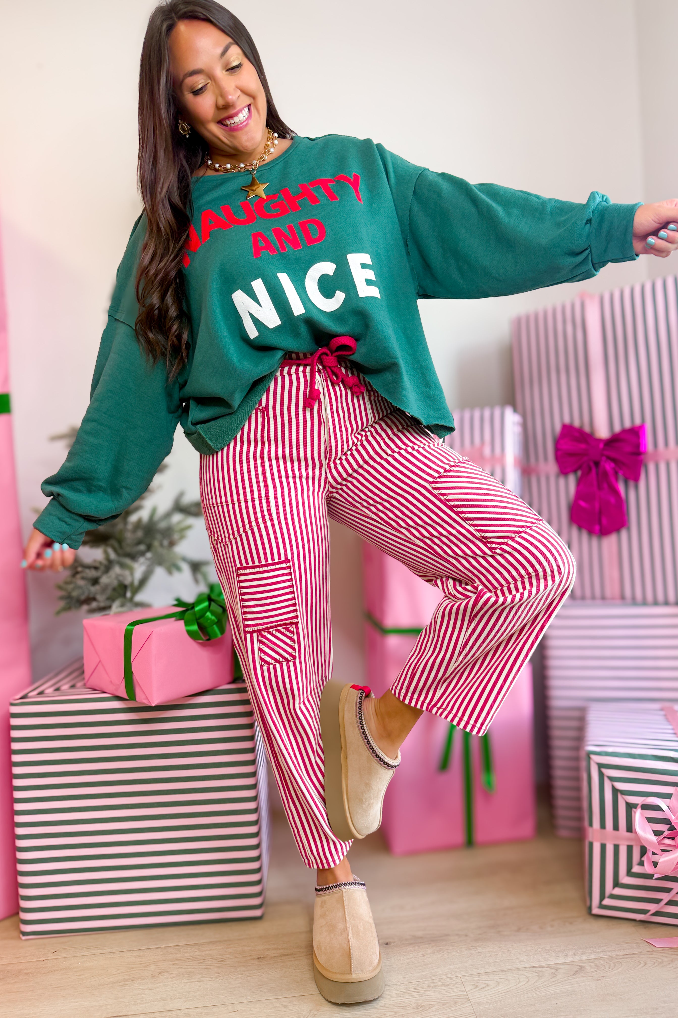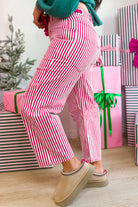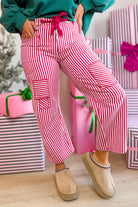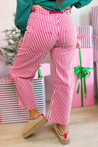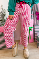 - Full-length pants feature a mix of red and cream vertical stripes with contrasting patchwork panels that add texture and charm.