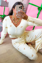 - Relax in style with this playful long sleeve lounge top featuring an adorable teddy bear print. Designed with a button front and soft, lightweight fabric, it’s the perfect mix of comfort and charm.