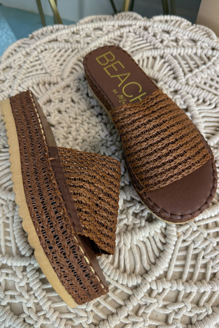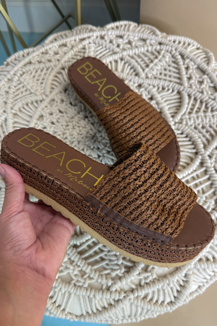 - The Del Mar Cocoa Sandals by Beach by Matisse are the ultimate slide for sun-soaked days. These woven platform sandals feature rich cocoa brown raffia, a chunky espadrille-style sole, and an effortless slip-on design. Whether you're headed to brunch, the boardwalk, or just beach-hopping, these comfy slides are ready for wherever summer takes you.