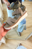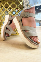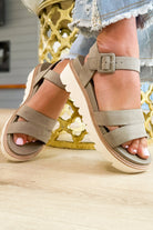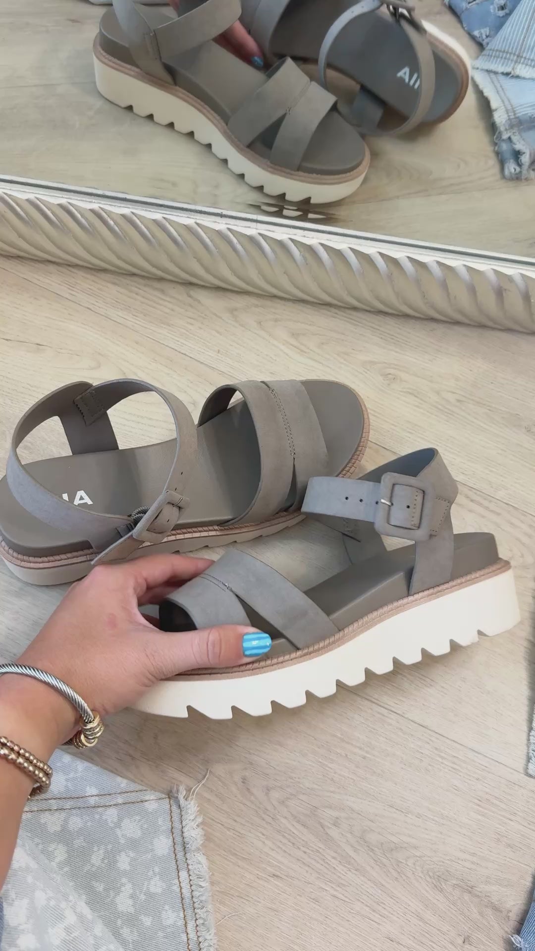 - Step into comfort and modern edge with the Everyday Edge Taupe Sandal by MIA. This platform sandal features wide crossover straps, a bold buckle ankle closure, and a chunky ridged sole for that effortless street-style vibe.