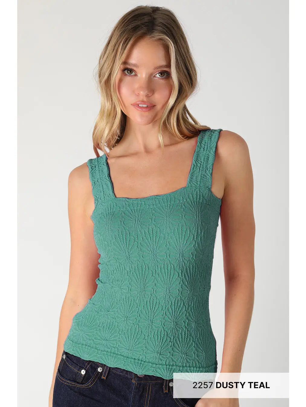 - This amazing tank is a soft, textured dream with a touch of vintage charm. Designed with wide straps, a stretchy material, and a subtle scallop design, this stretchy knit top hugs in all the right places. Whether styled solo with denim or layered under a jacket, it's the kind of versatile, feminine piece you’ll reach for on repeat. Available in multiple colors to match every mood.