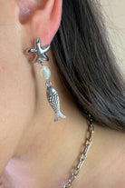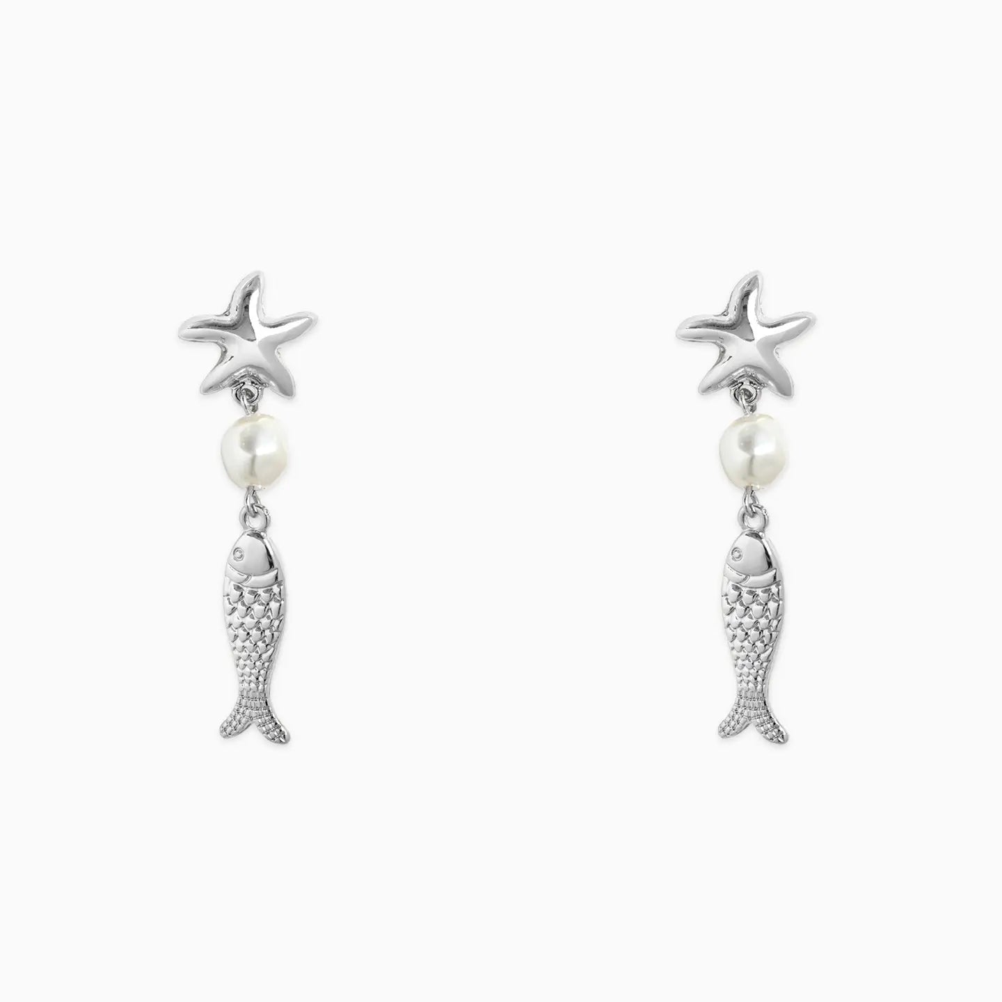- A stunning blend of nautical charm and elegance, these drop earrings feature starfish studs, delicate pearls, and dangling sardine charms.