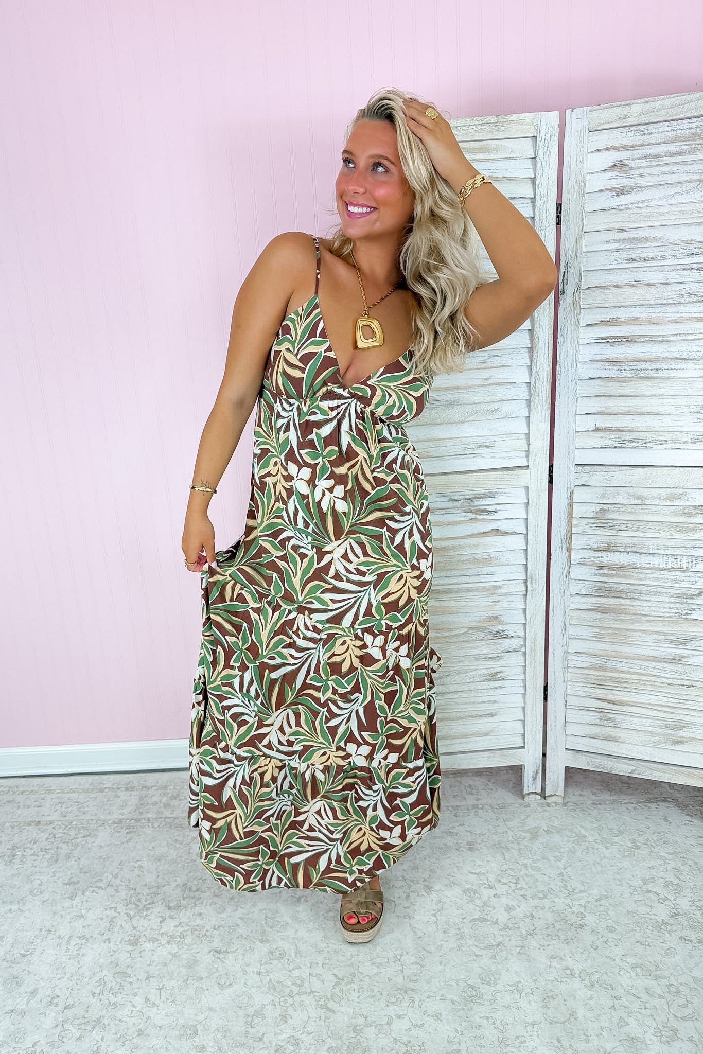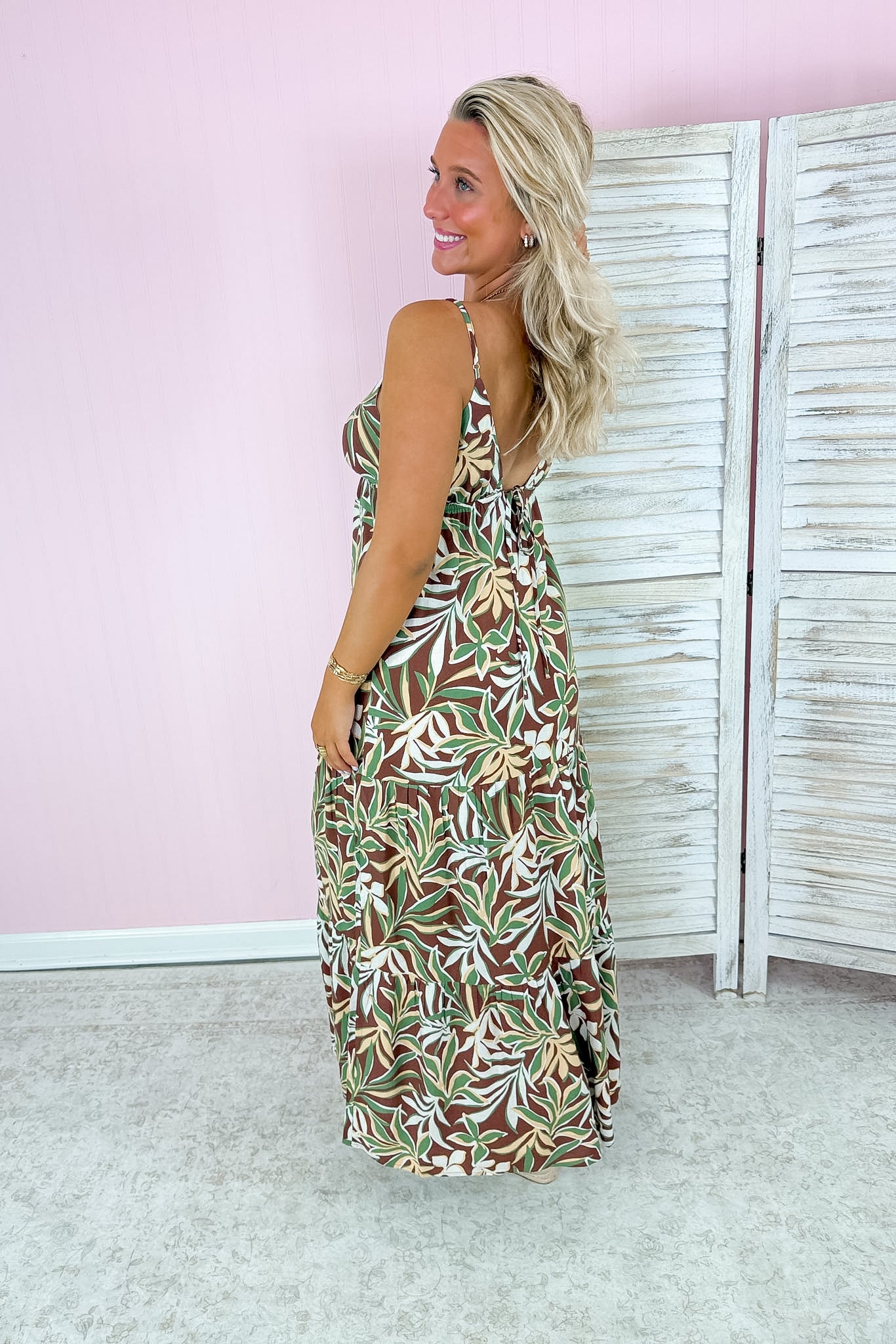 Soft, flowy maxi with a romantic tropical print in earthy tones