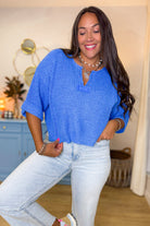 - Cozy up in this half sleeve knit crafted in a striking sapphire hue. Its relaxed silhouette and soft texture make it a perfect layering piece for fall and winter days.