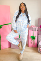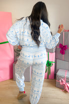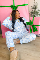 - Soft, lightweight fabric with a relaxed fit, balloon sleeves, and a frosty blue fair isle print