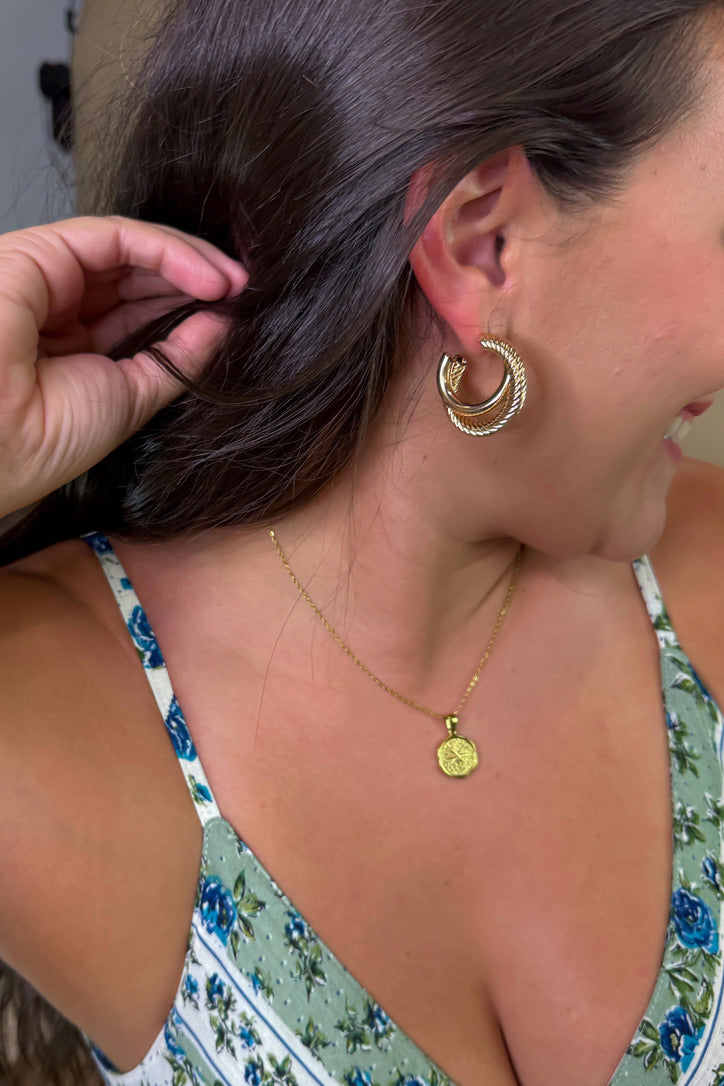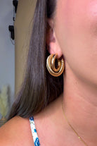- Bold Twist Rope and Gold Intertwined Hoop Earrings, these hoops feature intertwined twist rope-like design and fine gold mixed together, creating a bold and eye-catching design.