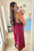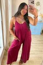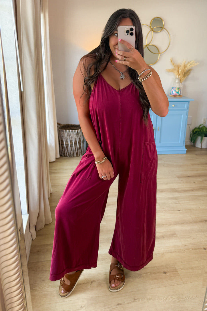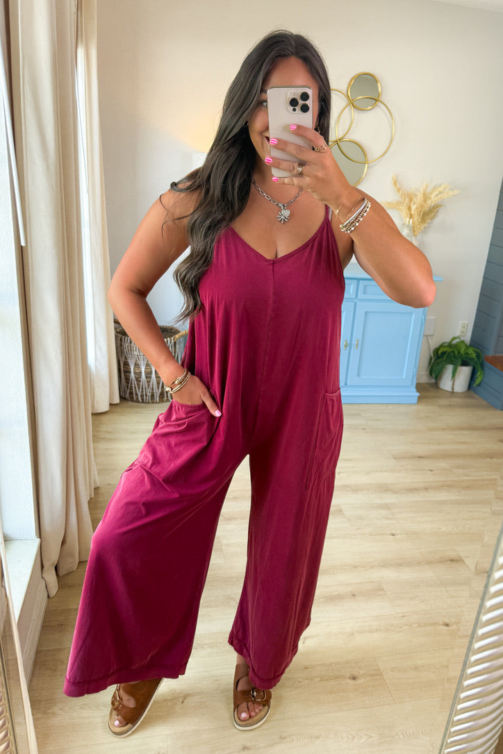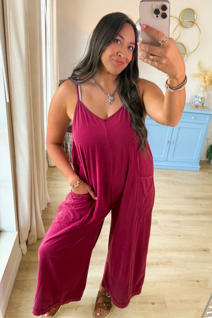 - Slip into something effortless with the Merlot Mood Jumpsuit—a wide-leg, flowy silhouette made for your most carefree days. Crafted in a deep wine hue, this relaxed-fit one-piece features adjustable spaghetti straps, oversized pockets, and soft, breathable fabric that moves with you. Whether you're lounging, brunching, or layering it with a cardi for fall, this jumpsuit is the definition of easy-chic.