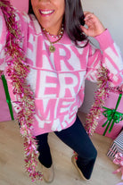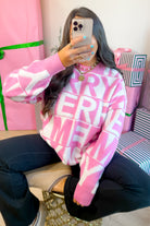 - Comfy + oversized knit that wraps you in cozy cheer with its bold “MERRY” lettering and dreamy pink-and-white palette.