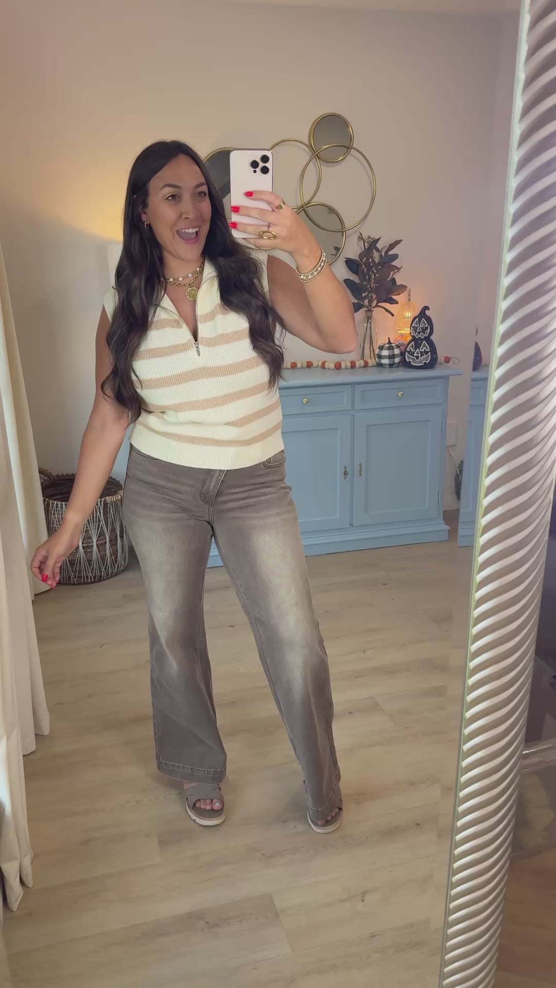 - This striped knit vest is the perfect mix of cozy and chic, with a half-zip neckline and soft fabric that layers beautifully. The neutral tones make it easy to pair with denim or trousers, giving you a versatile look for workdays or casual outings.