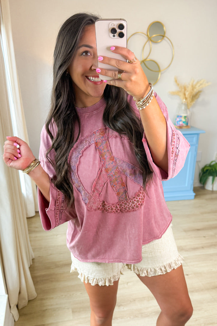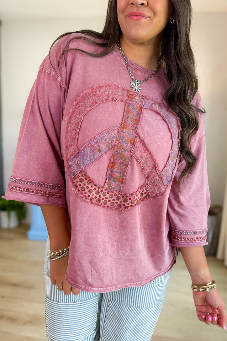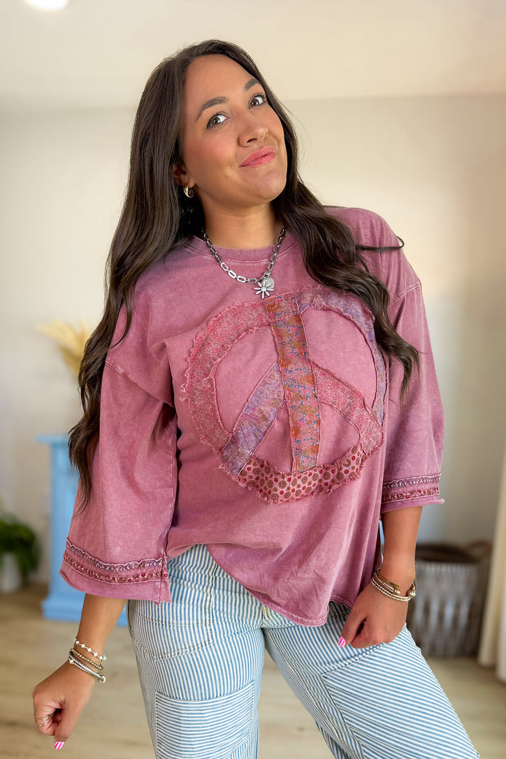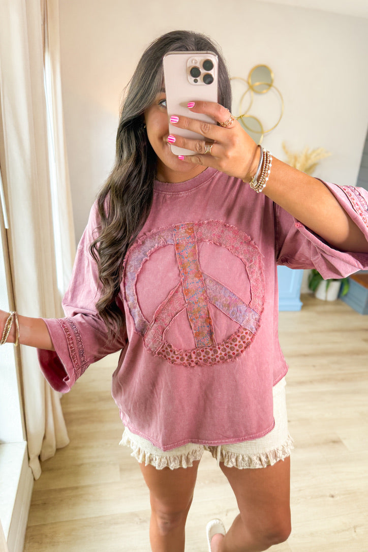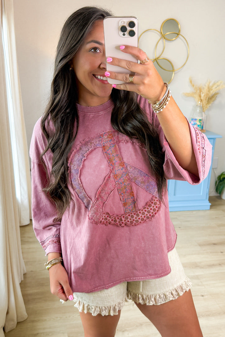 - Slide into serenity with the Peaceful Drift Tee—a washed mauve oversized top featuring a bold, boho-inspired peace sign patch front and center. The relaxed fit and vintage-style stitching give this long sleeve top all the cozy, retro vibes your fall wardrobe needs. Whether you're heading to a music fest, market stroll, or just keeping it comfy with denim, this tee is all about effortless peace and style.