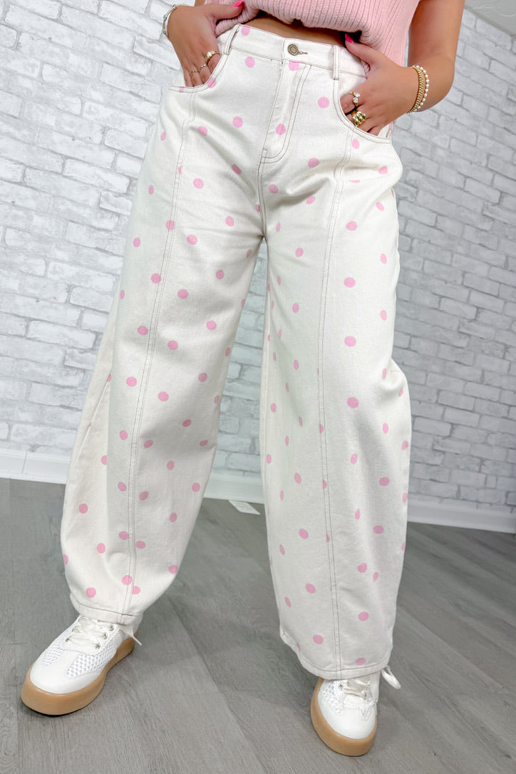 - Features a barrel jean fit with white denim and pink polka dots