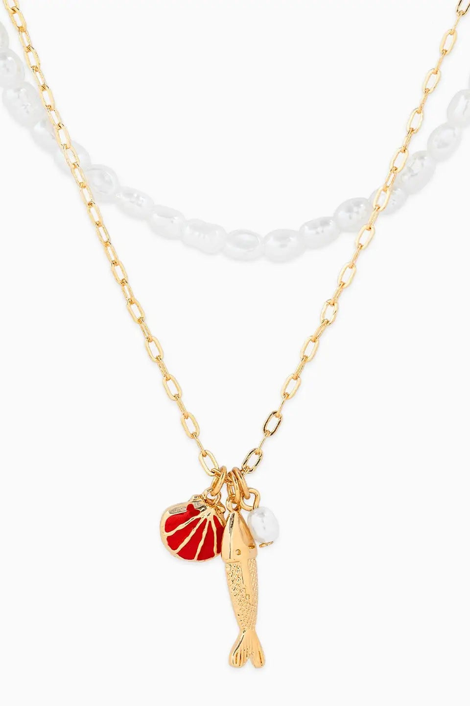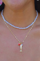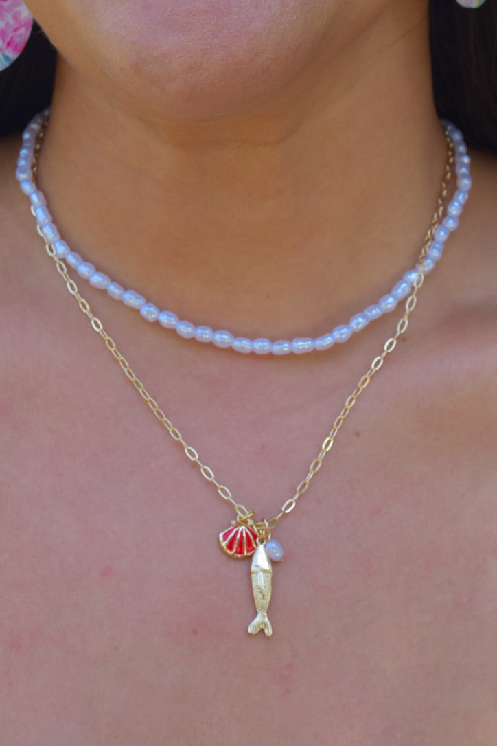 Sun-soaked and seaside-ready, this layered necklace pairs a glossy pearl choker with a dainty gold chain finished with a shimmering fish charm, enamel red shell, and a pearl drop.