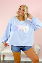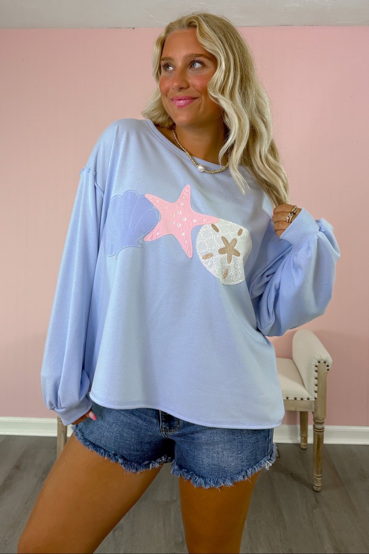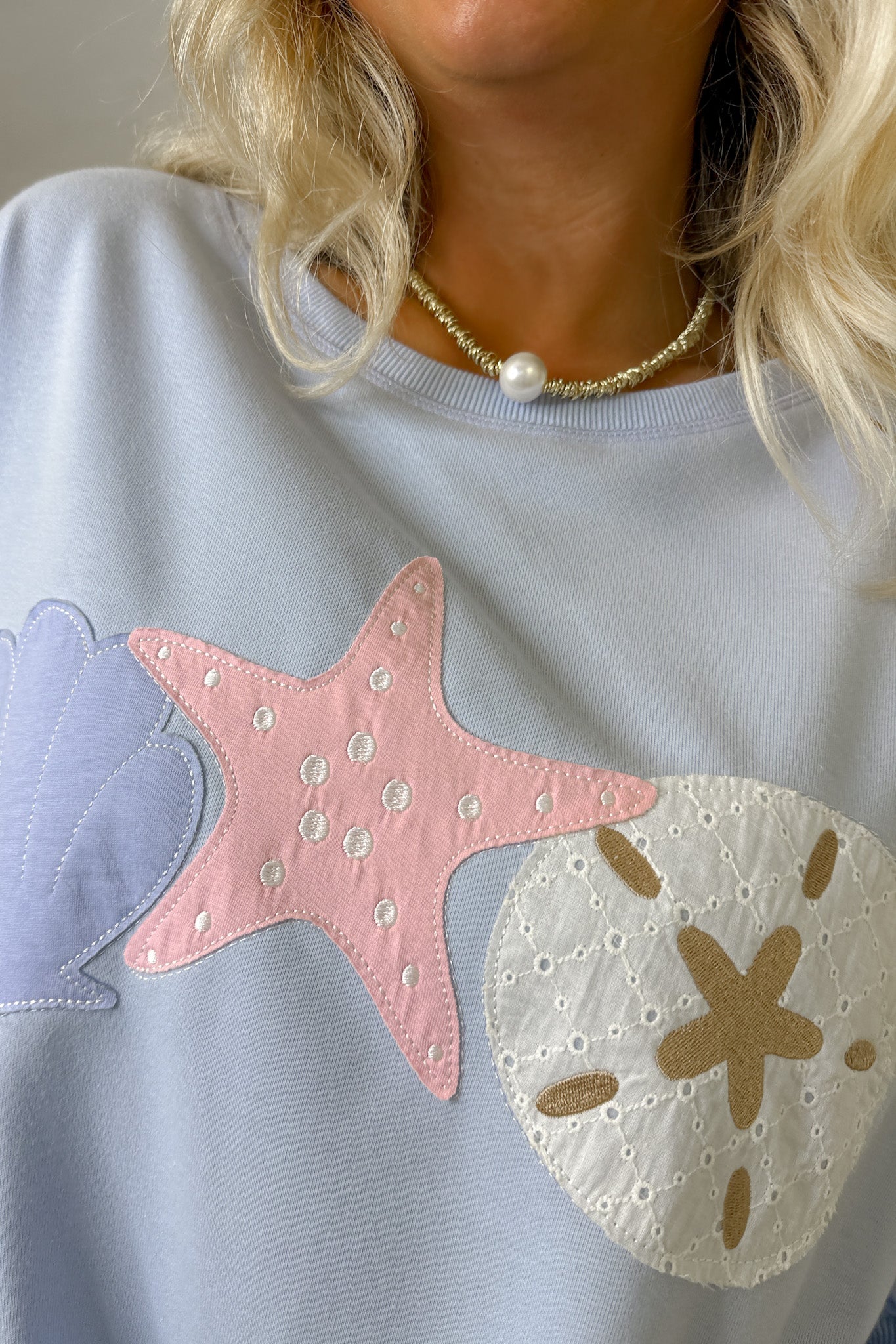 Soft pastel crewneck featuring charming seaside patch details.