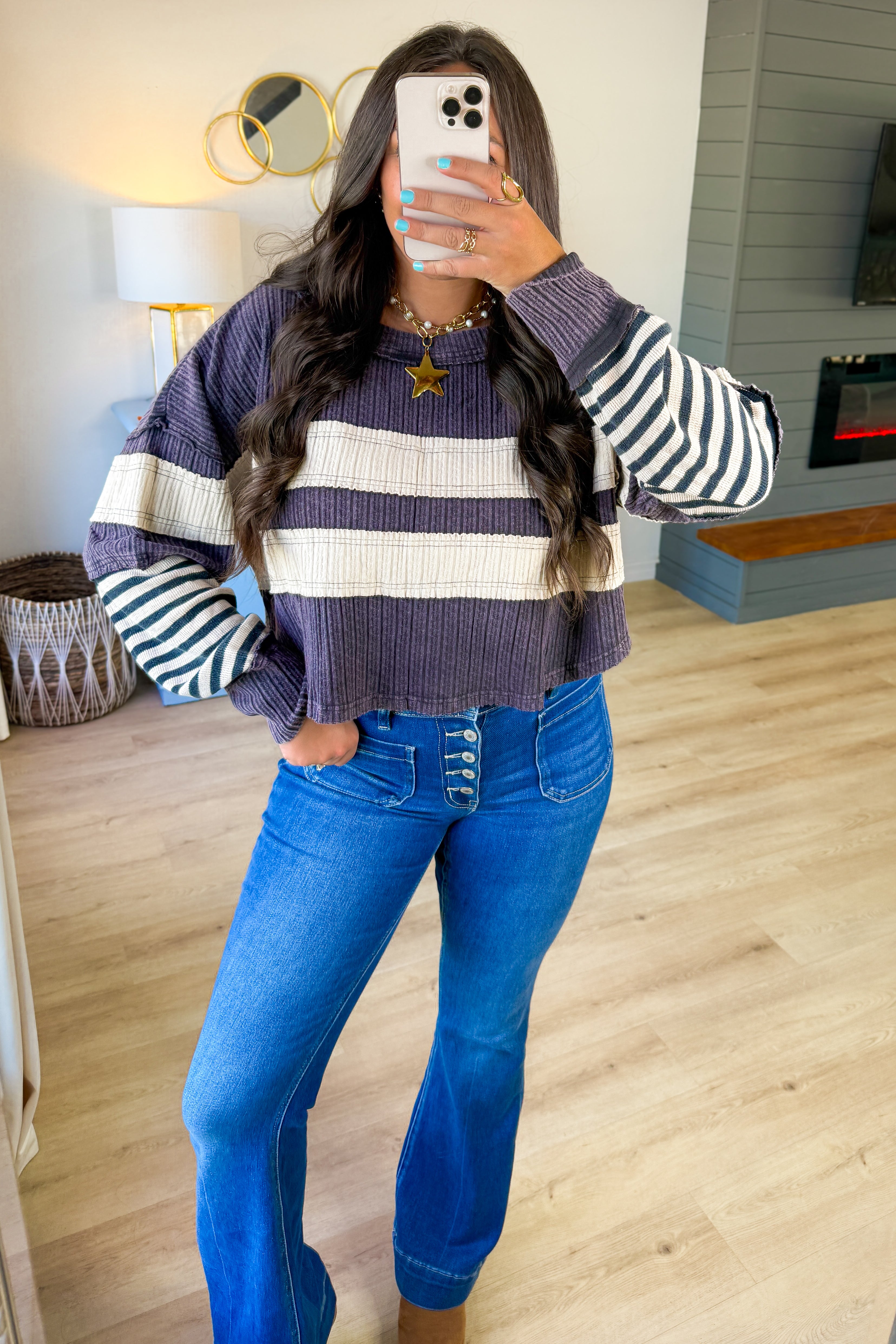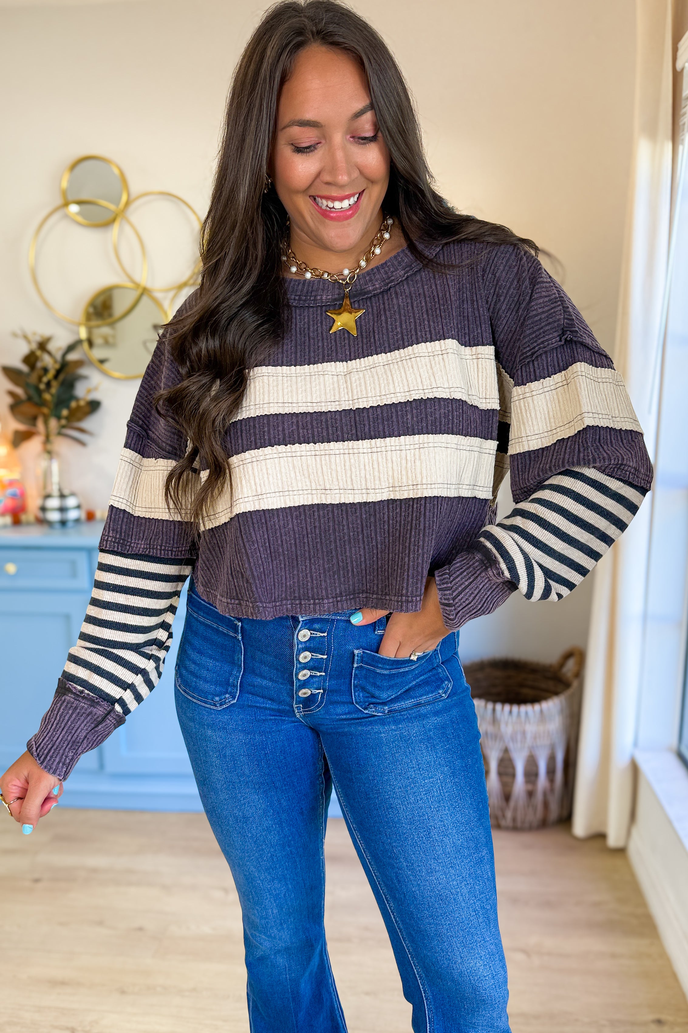 - Infuse your style with a warm bohemian touch in this striped knit top. Its relaxed silhouette and ribbed textures give it an easygoing, lived-in feel while the earthy tones add vintage-inspired charm.