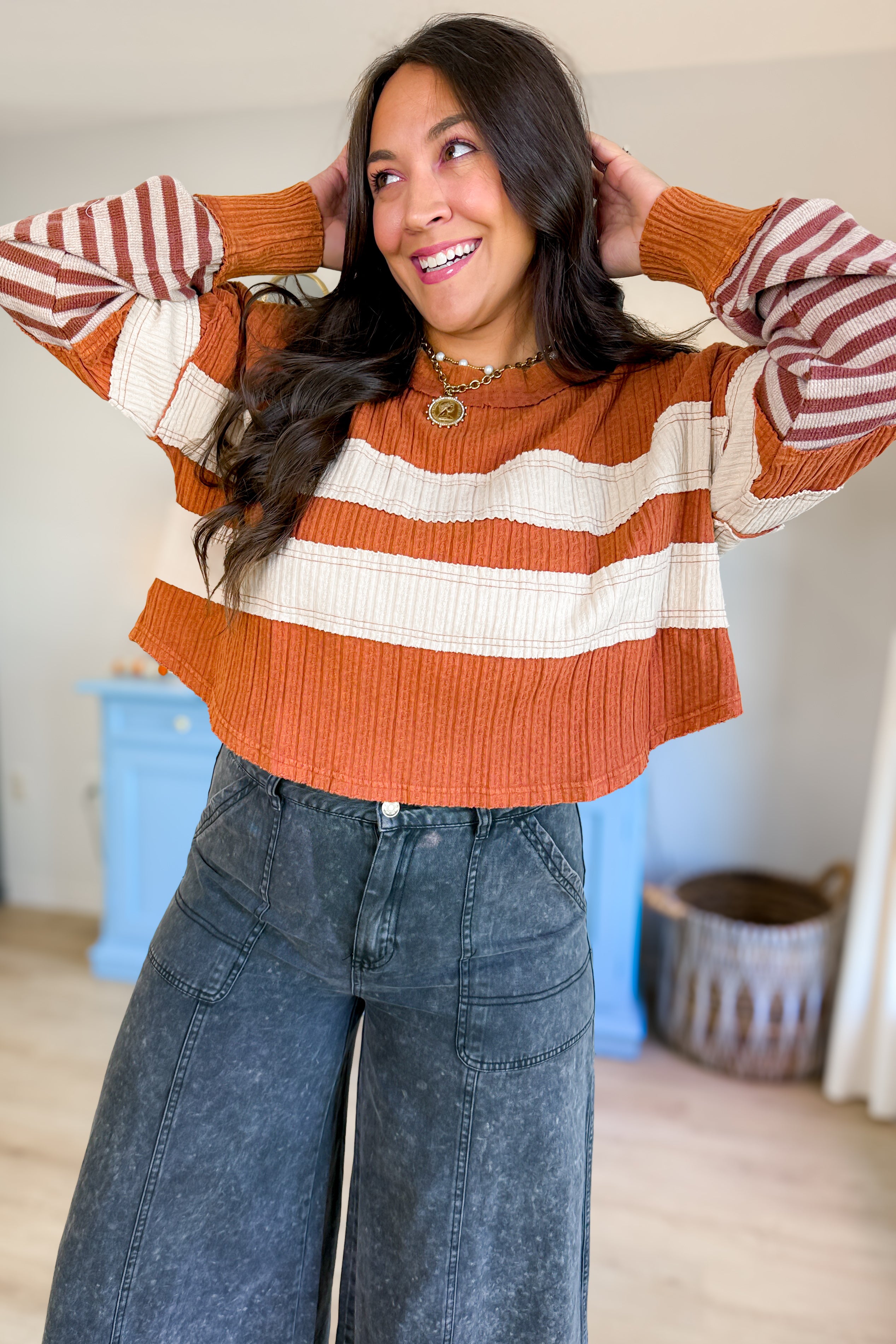- Infuse your style with a warm bohemian touch in this striped knit top. Its relaxed silhouette and ribbed textures give it an easygoing, lived-in feel while the earthy tones add vintage-inspired charm.