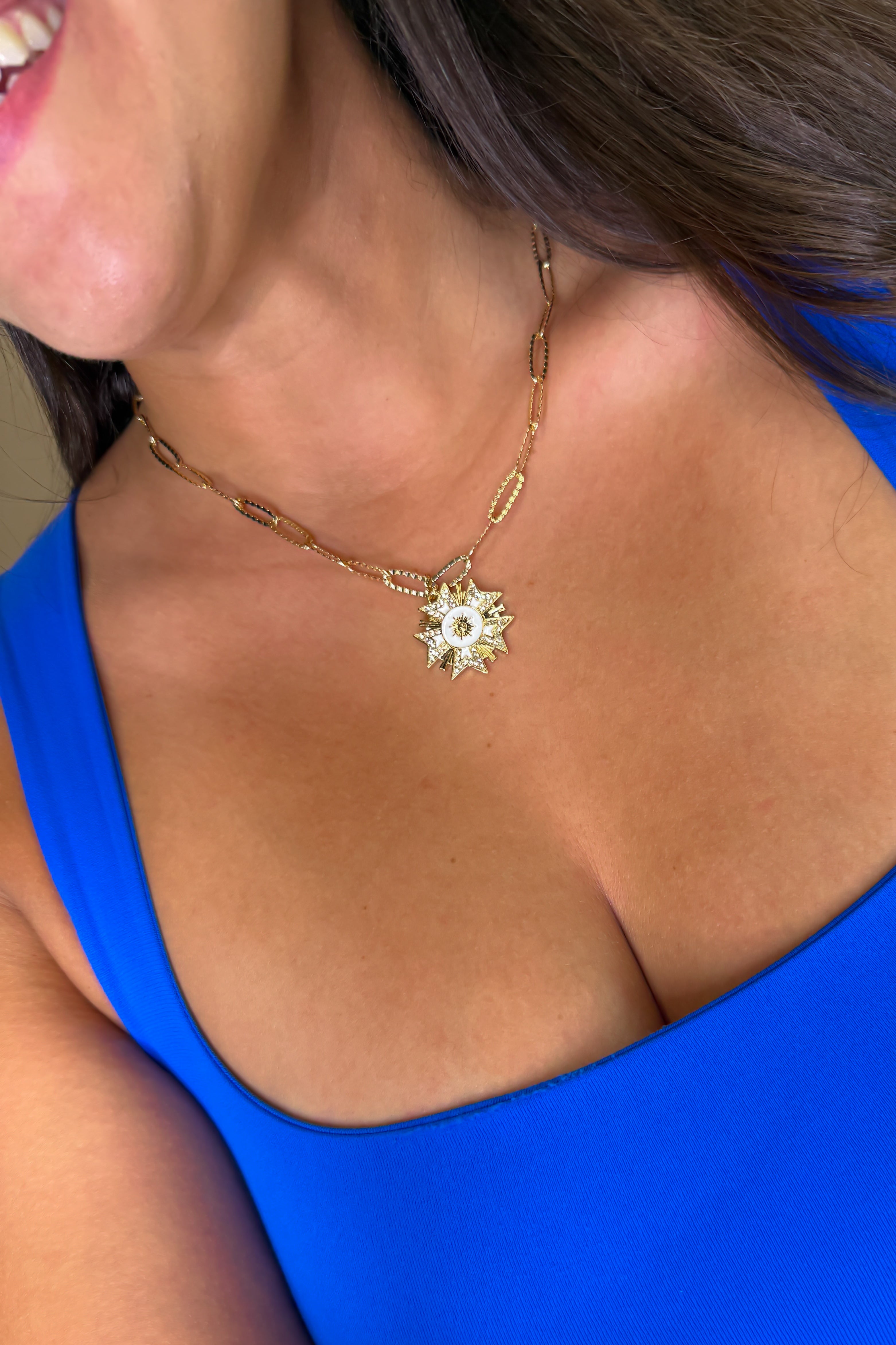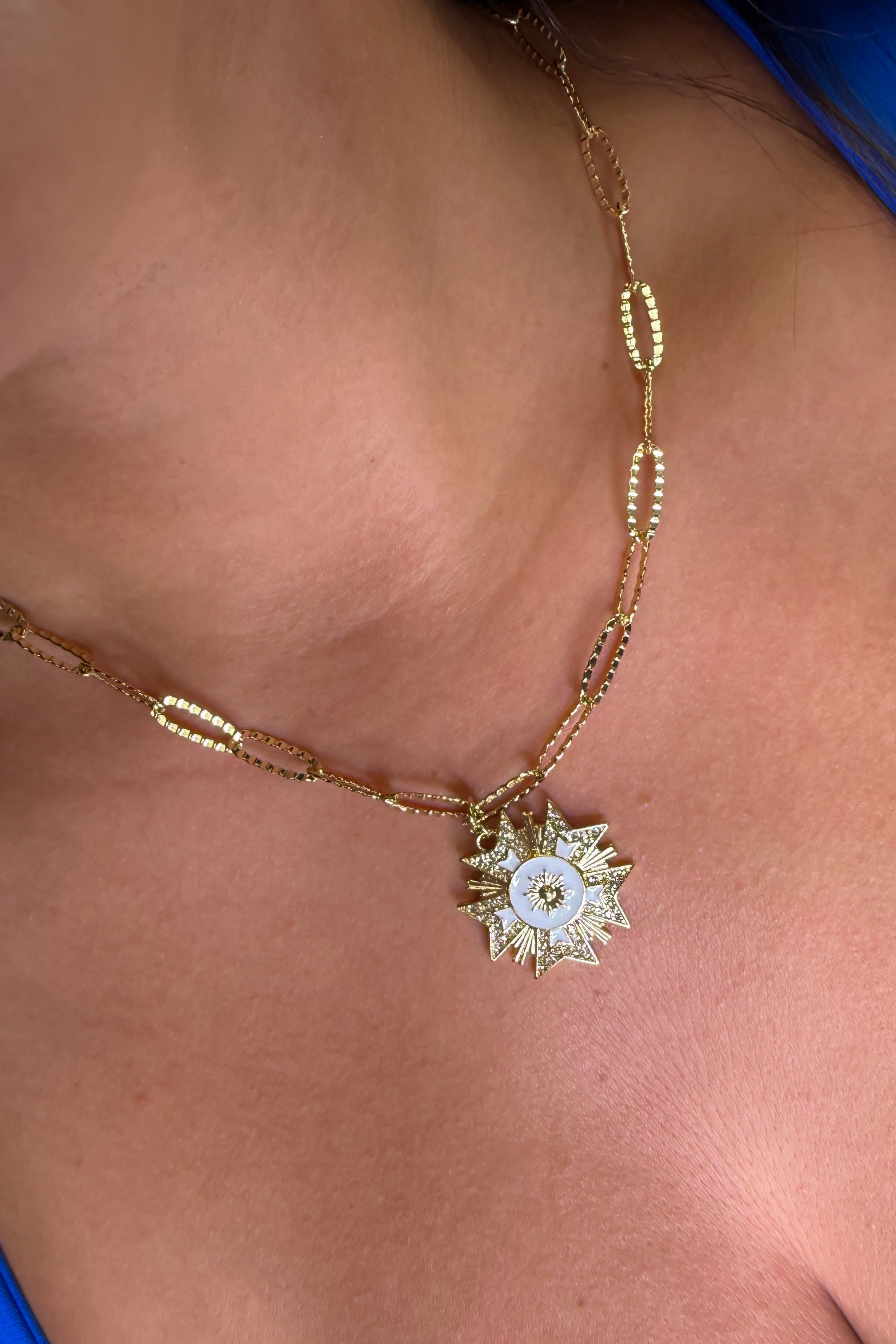 Let your style shine with the Solar Flare Pendant Necklace. This radiant piece features a starburst charm encrusted with glimmering stones, suspended from a textured gold chain. Perfect for layering or wearing solo, it adds a bold celestial touch to your everyday or night-out look.